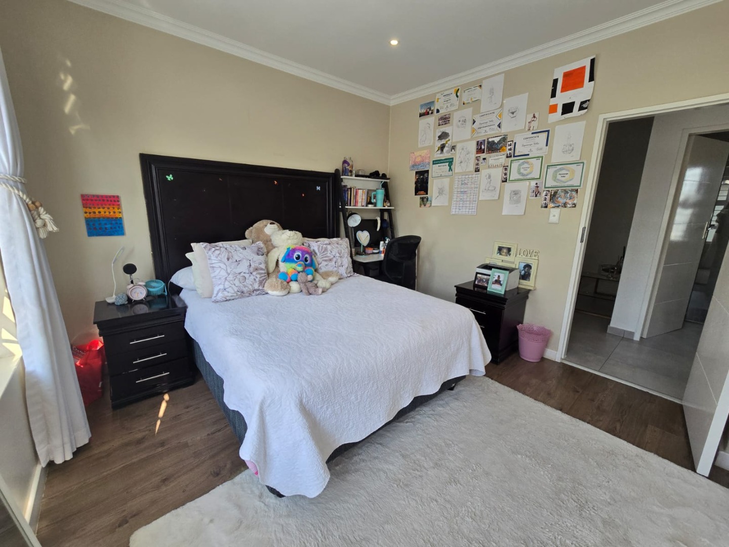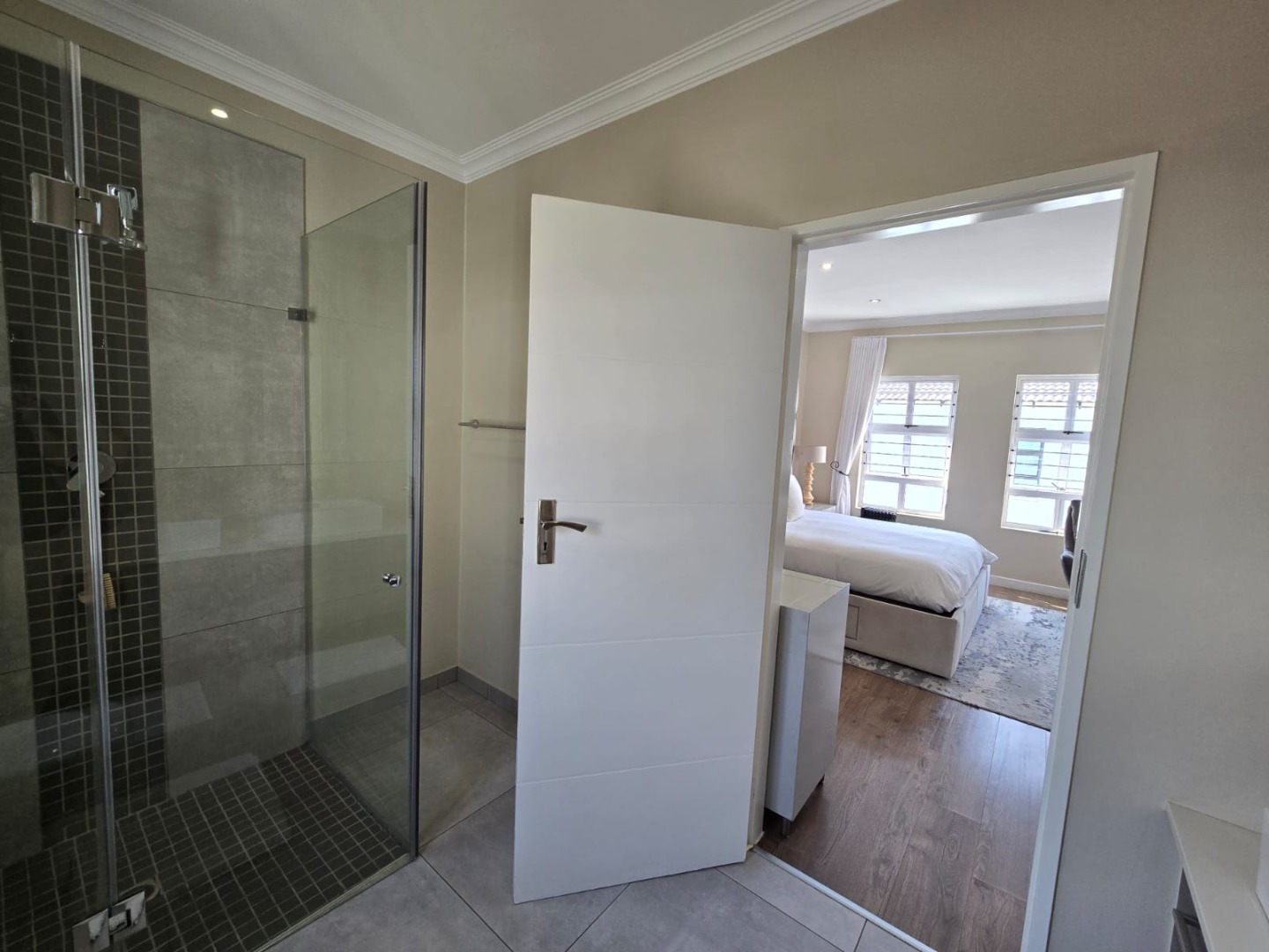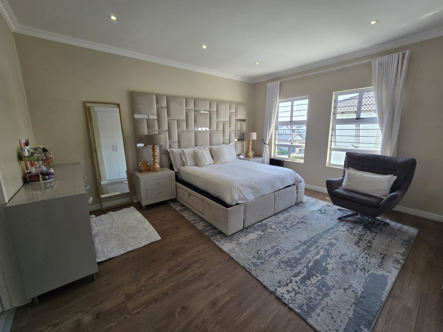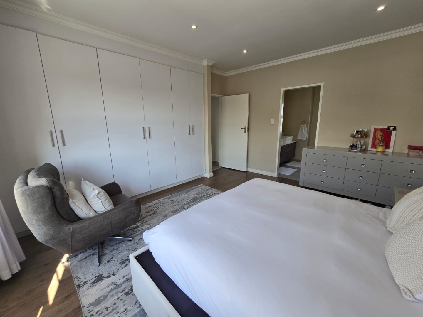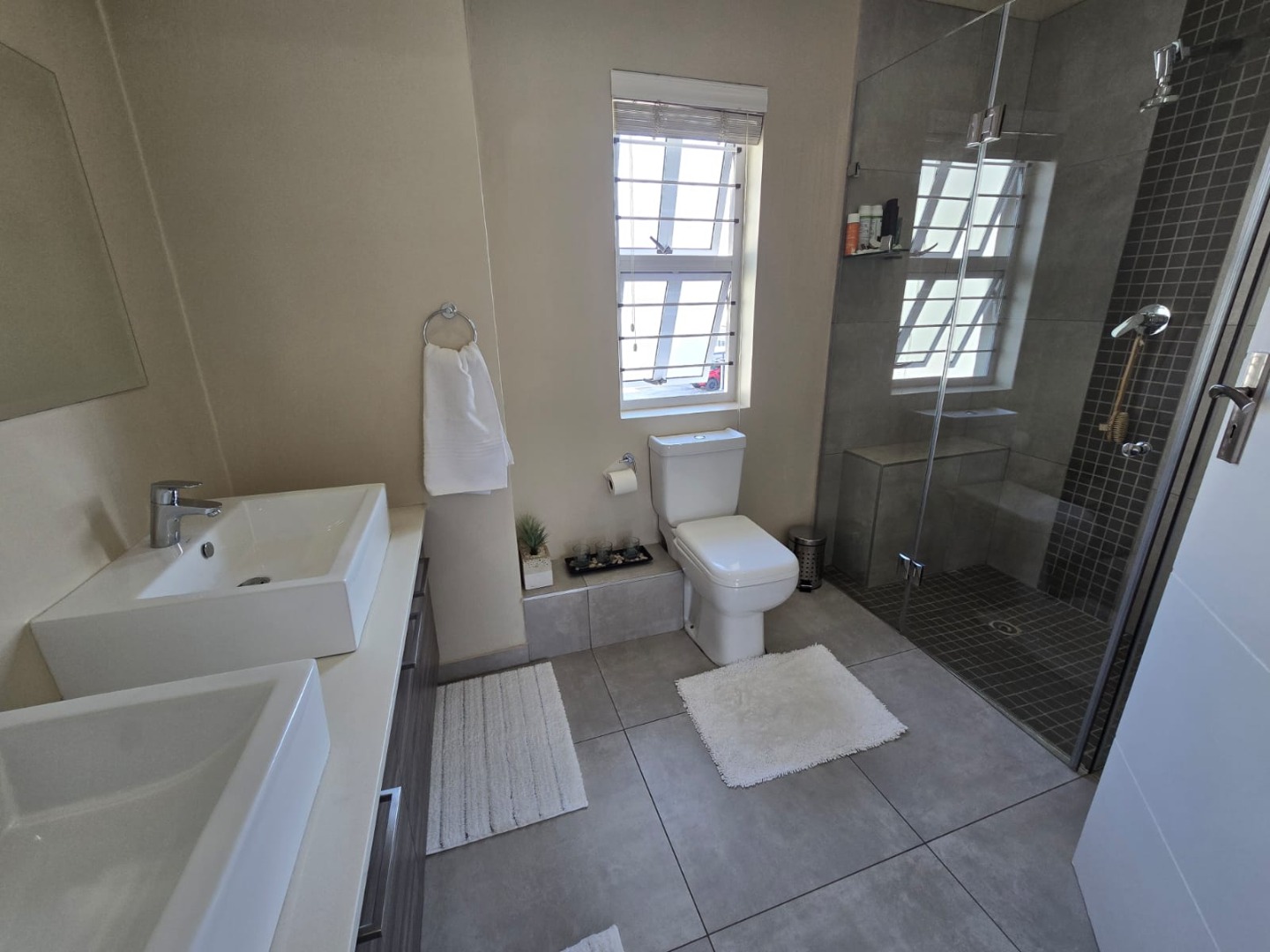 The main bedroom is a peaceful retreat, bathed in natural light and complemented by an en-suite bathroom featuring a spacious shower and double vanities.