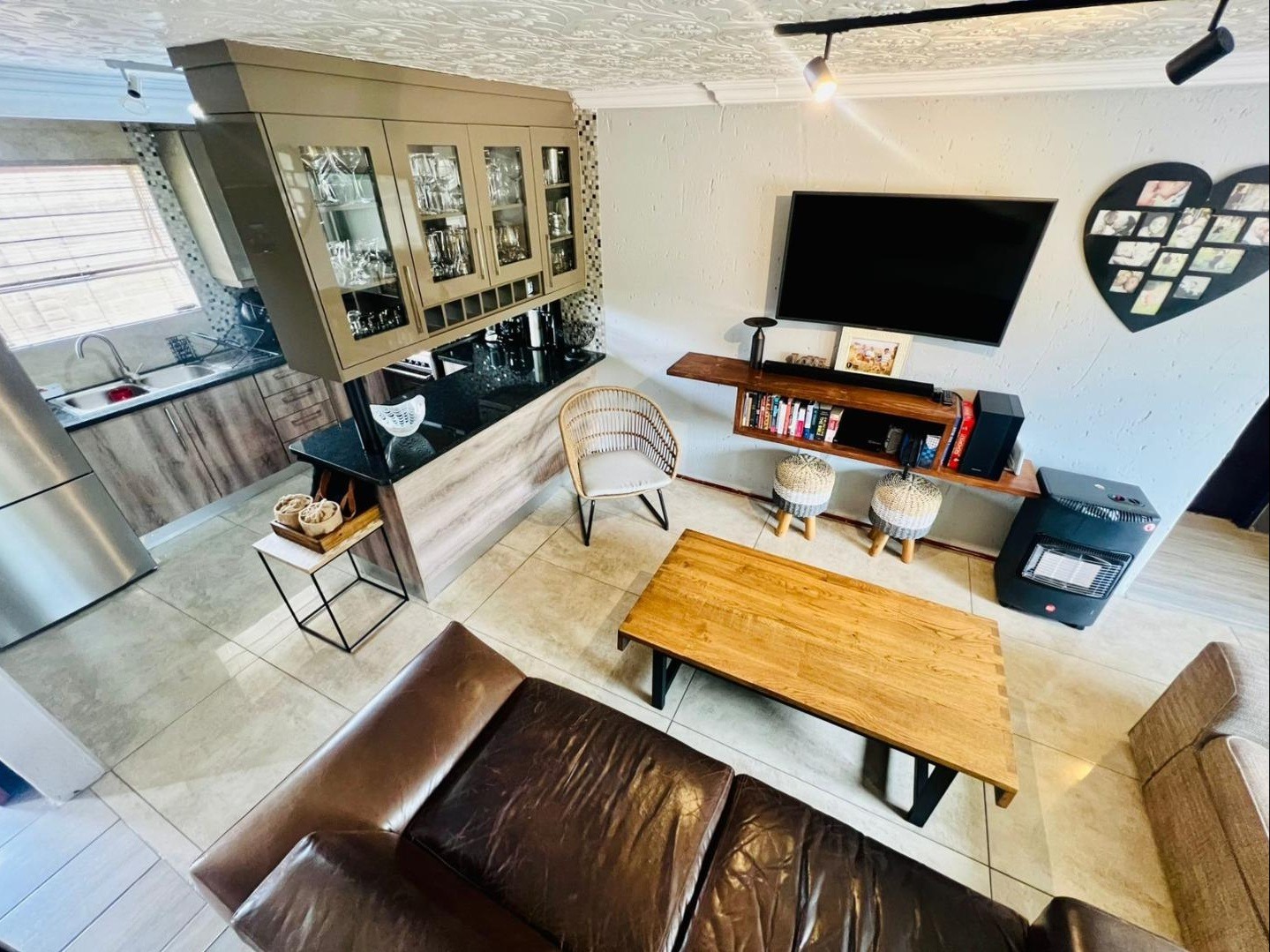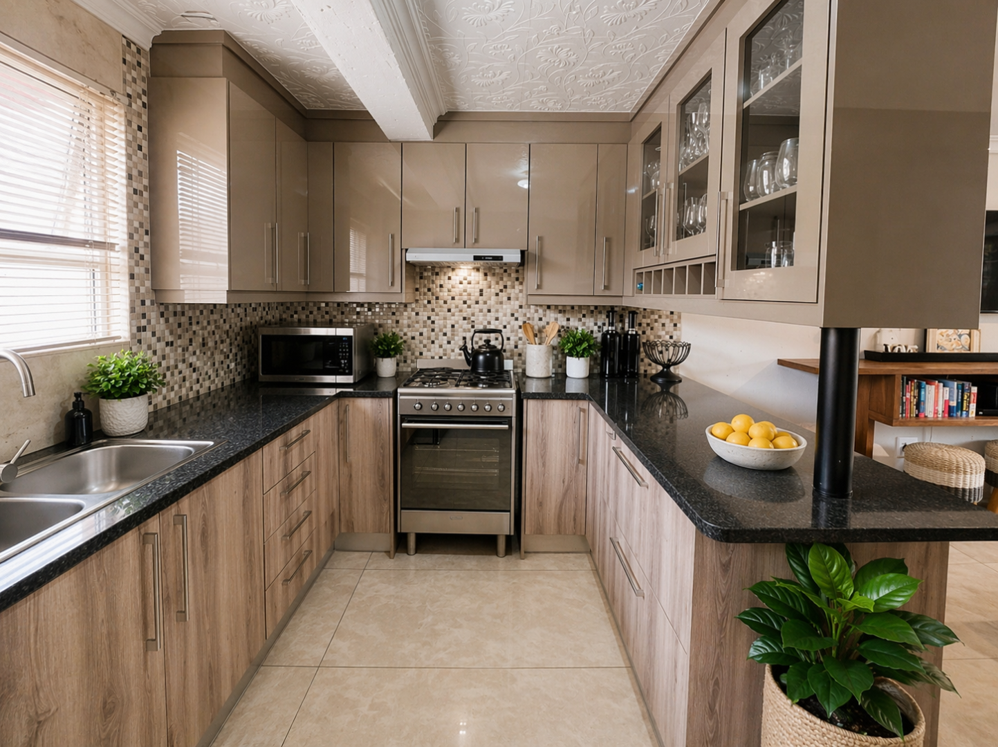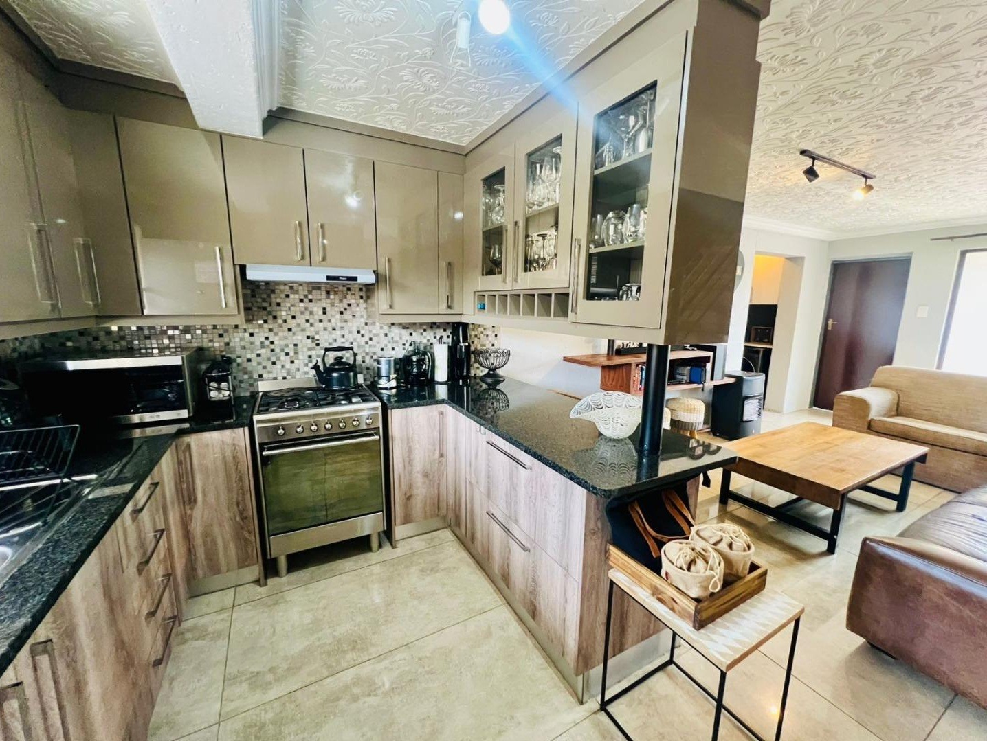 Upon entry, the open-plan layout seamlessly integrates the contemporary kitchen with the inviting lounge area. The kitchen boasts modern cabinetry, a sophisticated blend of glossy beige and wood-look finishes, complemented by black granite countertops and a mosaic tile backsplash. Equipped with stainless steel appliances, a double sink, and ample storage including glass-front cabinets and a wine rack, it also features a convenient breakfast bar. The lounge area, adorned with tiled flooring and modern track lighting, provides a comfortable space for relaxation and entertainment, complete with a floating TV shelf.