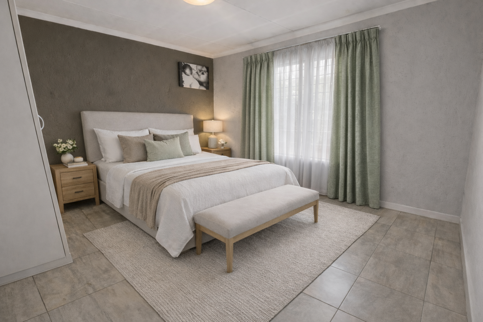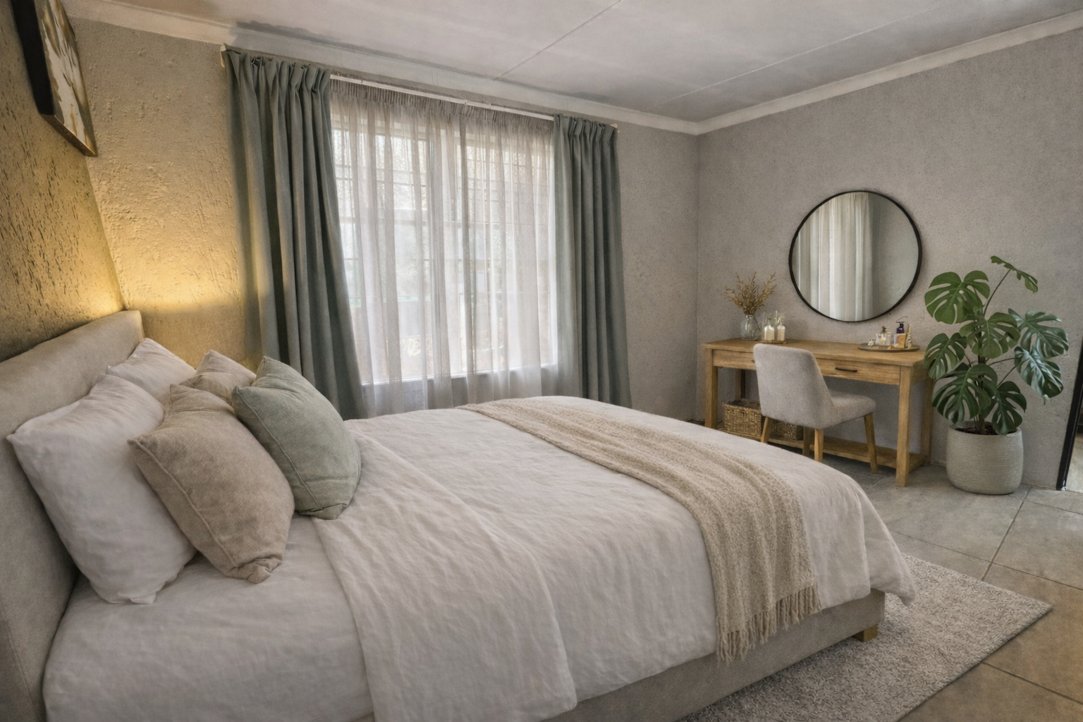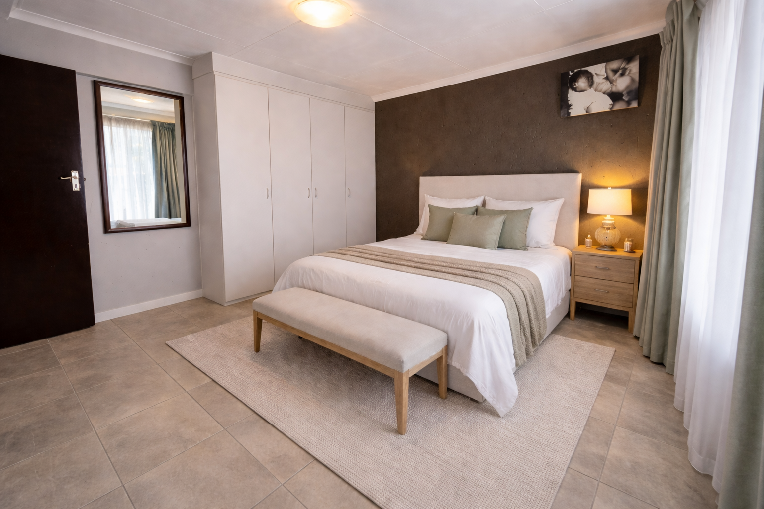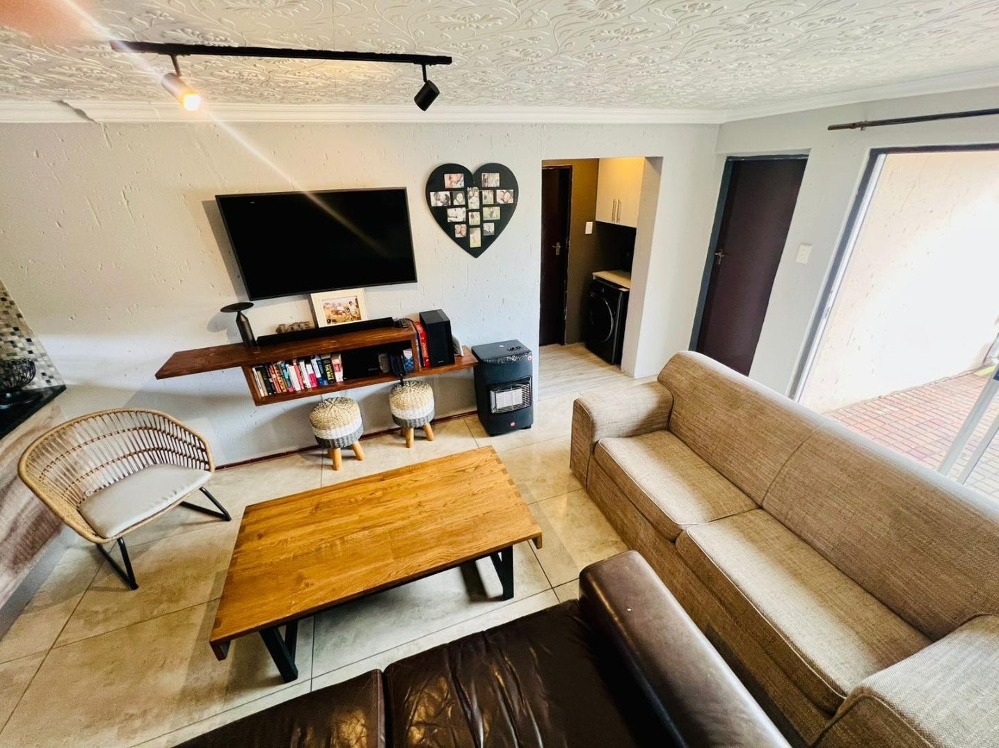 - Spacious Lounge with Tiled Flooring and Floating TV Shelf