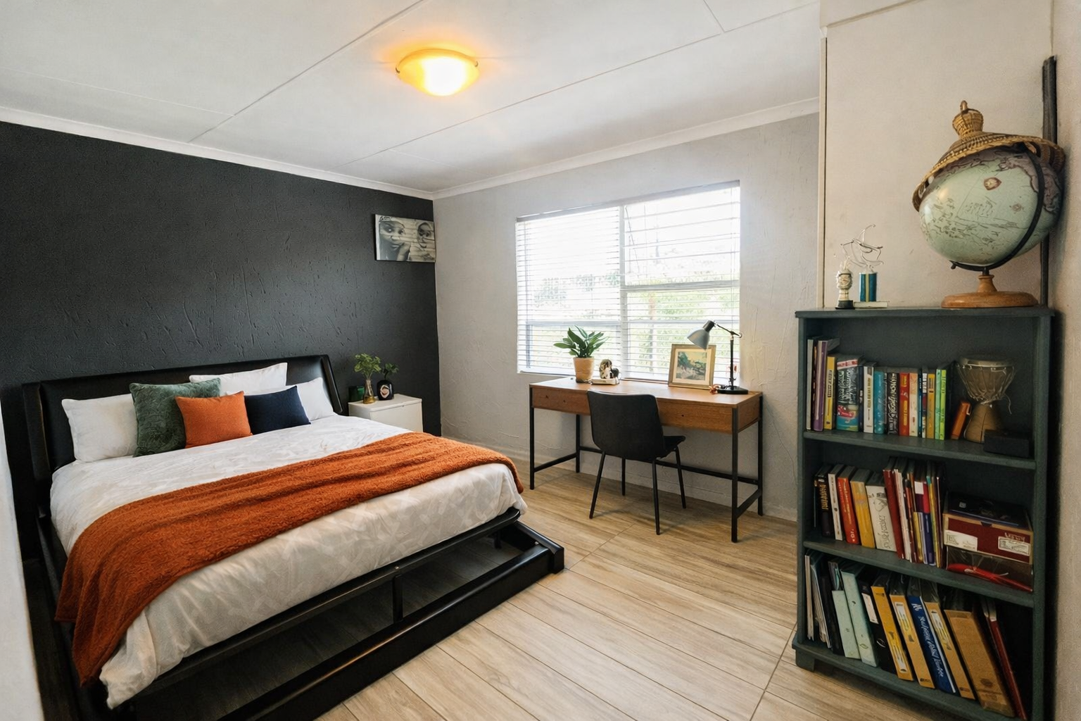 Accommodation comprises three well-appointed bedrooms and two bathrooms, including a private en-suite. The primary suite features polished wooden floors and built-in wardrobes, as well as a private relaxation nook, offering practical storage solutions and a refined aesthetic. Natural light permeates the living spaces, enhancing the overall ambiance.