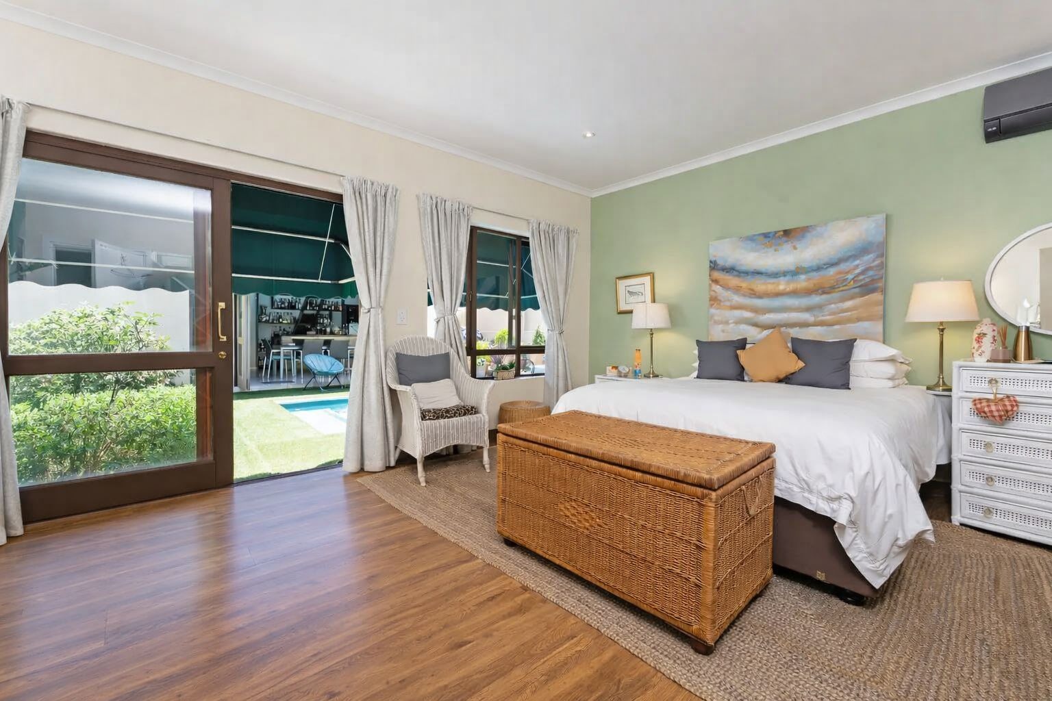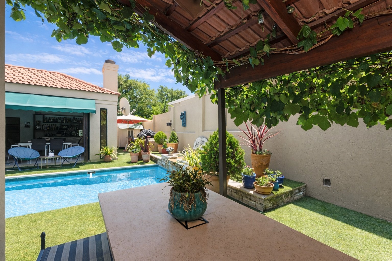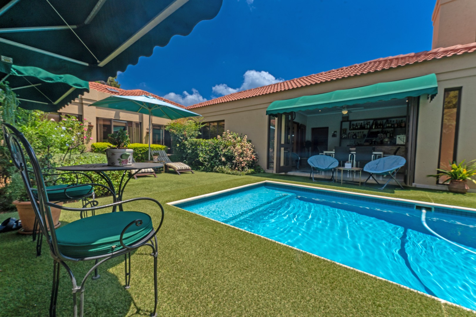 Accommodation includes four spacious bedrooms -or three plus a study. One bedroom opens onto a private courtyard with gazebo and grapevine. The main suite is a true retreat with walk-in dressing area, full en-suite, and direct pool and garden access.