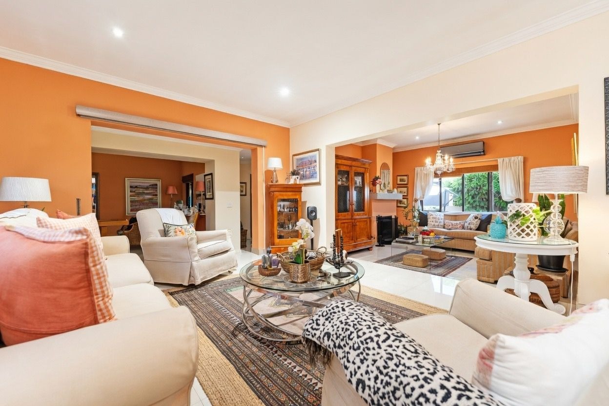 A welcoming entrance hall leads into expansive, light-filled reception areas. The formal lounge, arranged in two spacious sections, features a cosy fireplace. Entertaining continues effortlessly with a fitted bar and enclosed patio with built-in braai and stacking doors, opening onto a tranquil Mediterranean-style backyard oasis. The
