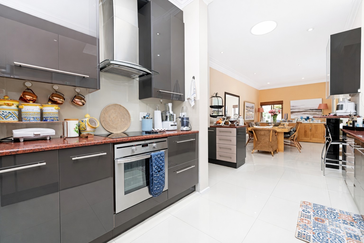 The heart of the home is the open-plan modern kitchen, complete with granite tops, ample storage, soft touch duco cabinetry, breakfast counter, and separate scullery, flowing seamlessly into the banquet-sized dining area.