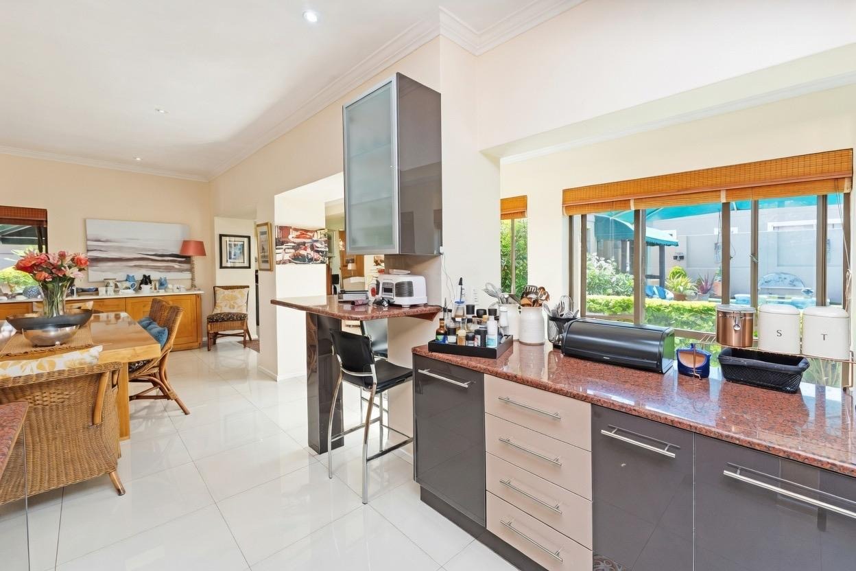 The heart of the home is the open-plan modern kitchen, complete with granite tops, ample storage, soft touch duco cabinetry, breakfast counter, and separate scullery, flowing seamlessly into the banquet-sized dining area.
