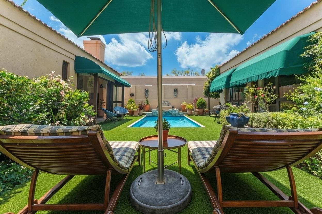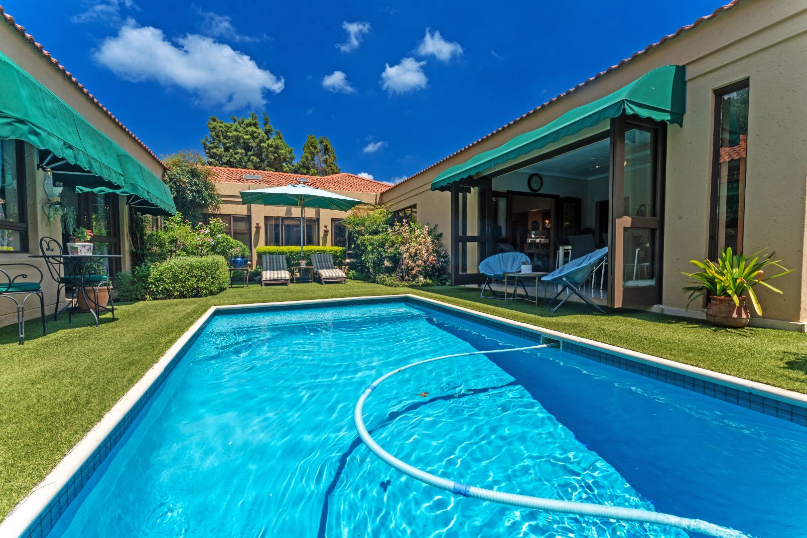 Accommodation includes four spacious bedrooms -or three plus a study. One bedroom opens onto a private courtyard with gazebo and grapevine. The main suite is a true retreat with walk-in dressing area, full en-suite, and direct pool and garden access.