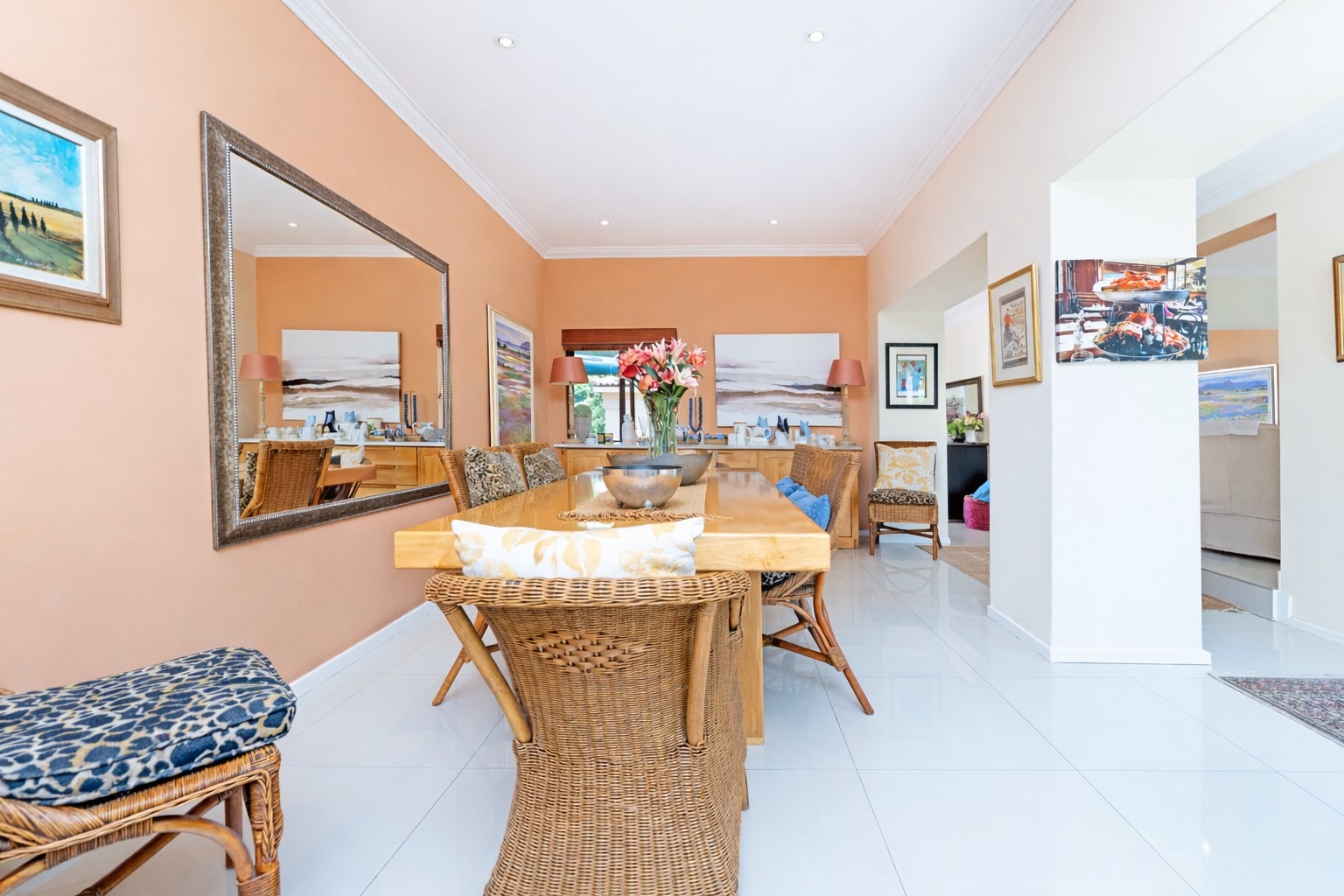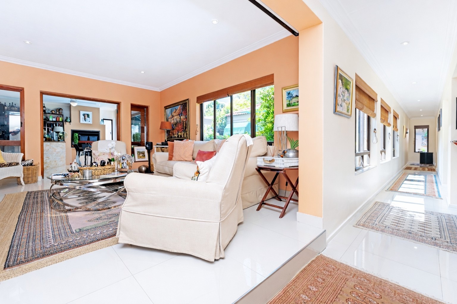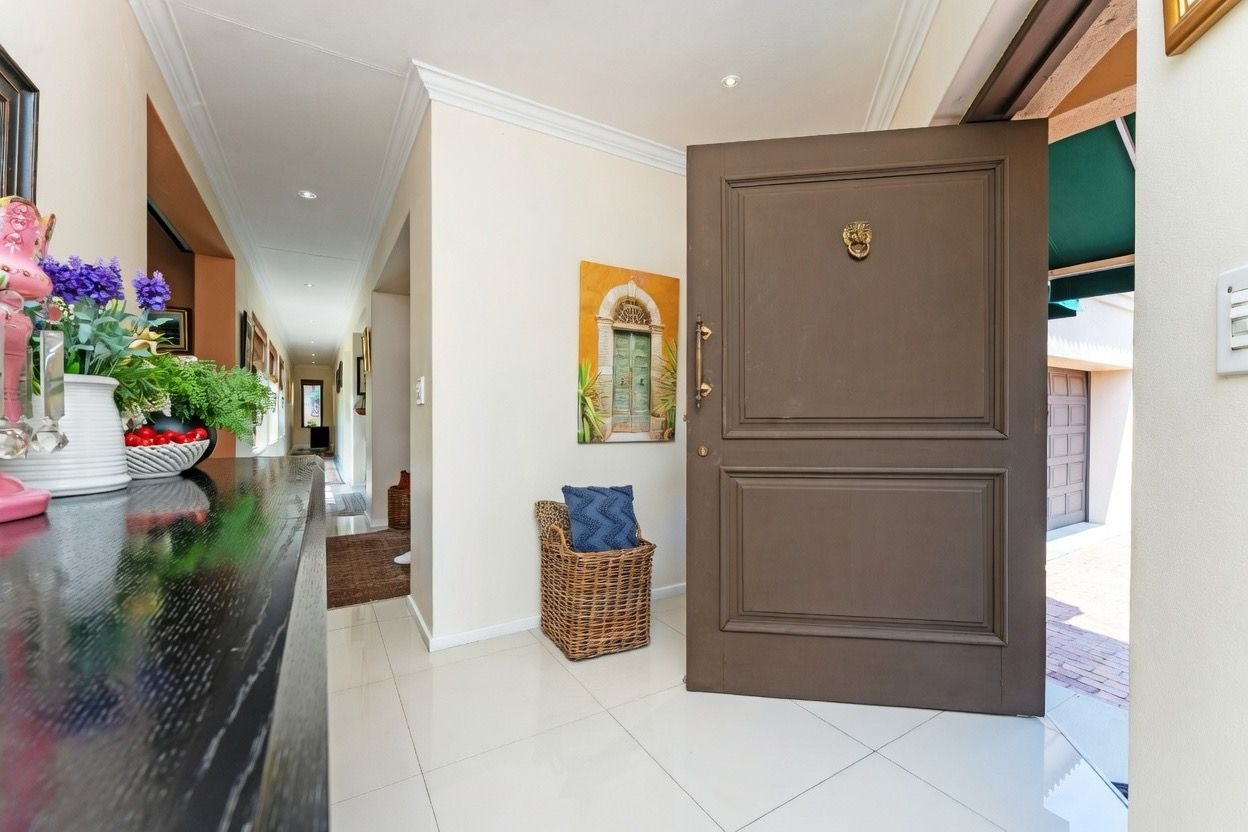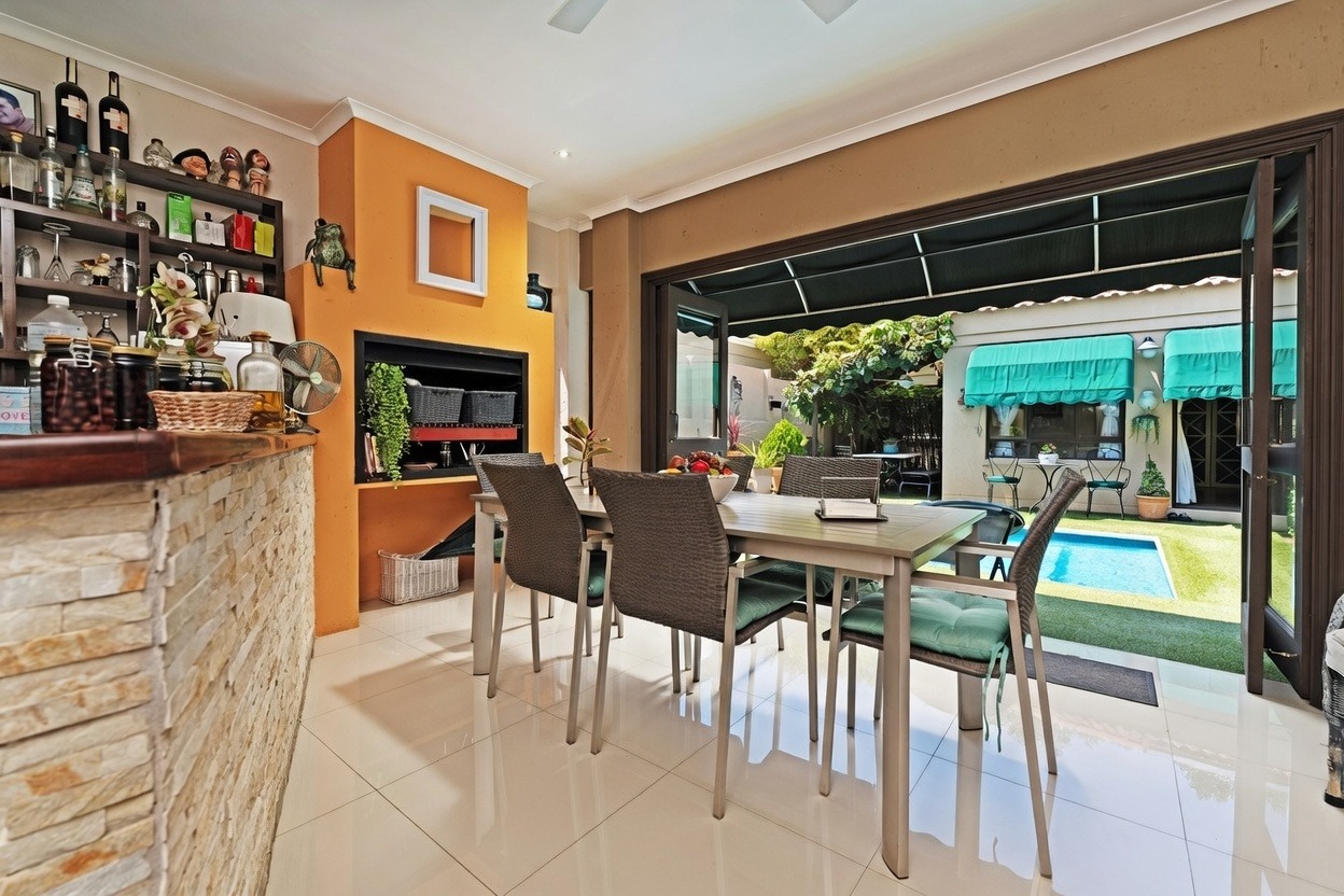 A welcoming entrance hall leads into expansive, light-filled reception areas. The formal lounge, arranged in two spacious sections, features a cosy fireplace. Entertaining continues effortlessly with a fitted bar and enclosed patio with built-in braai and stacking doors, opening onto a tranquil Mediterranean-style backyard oasis. The