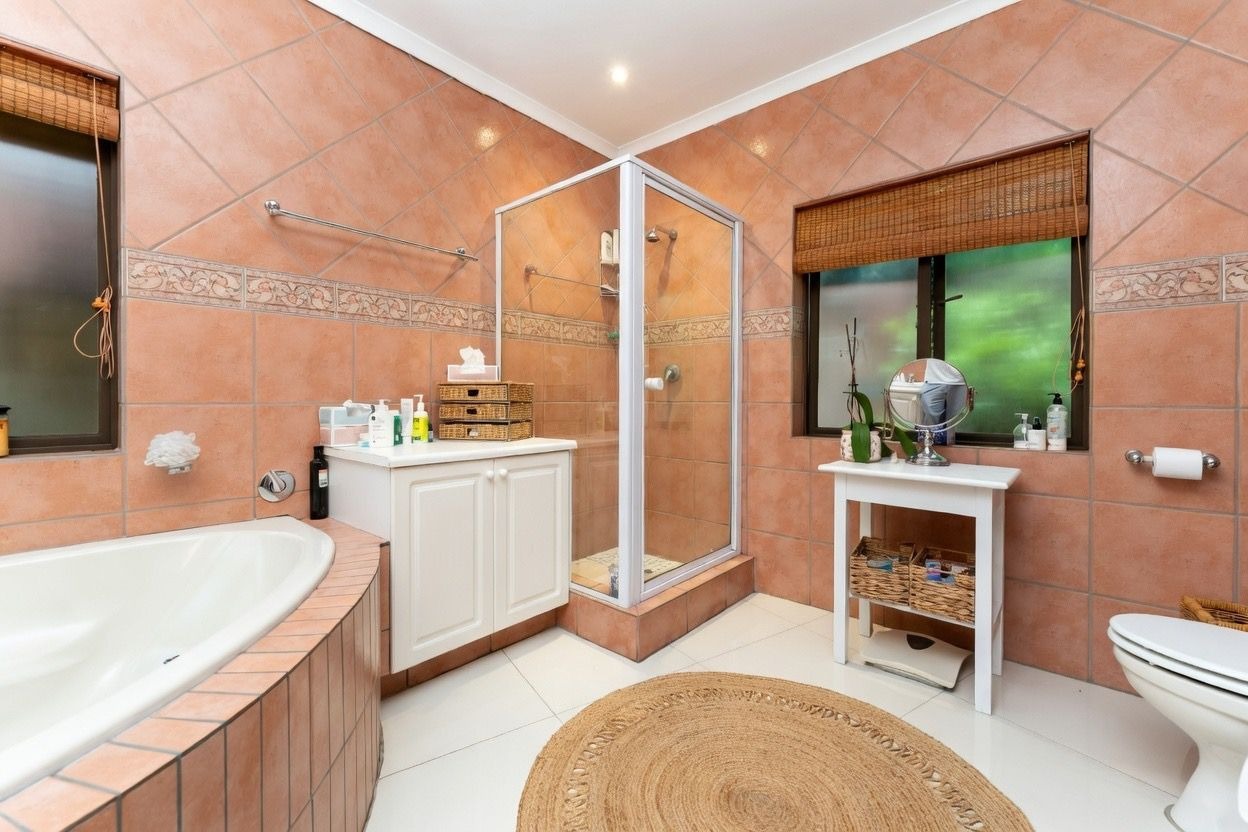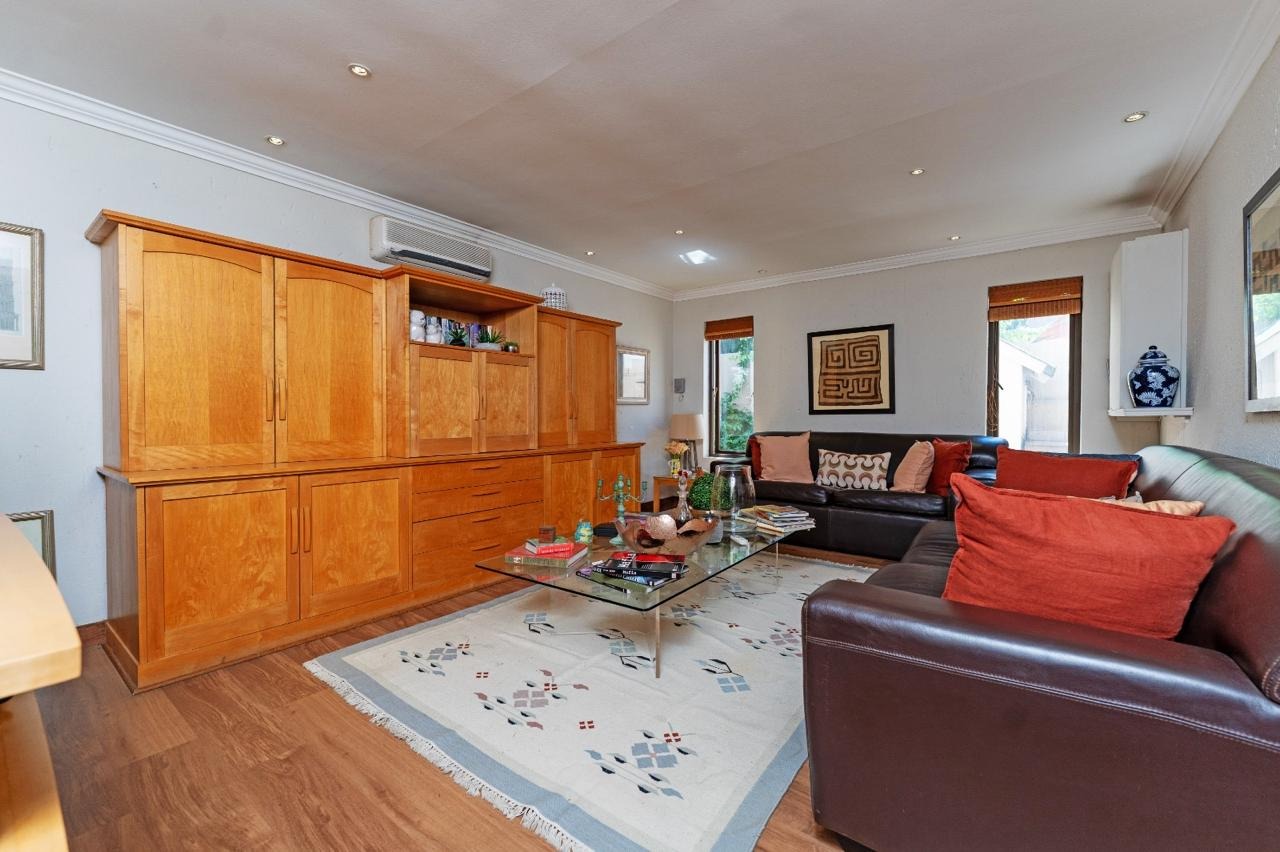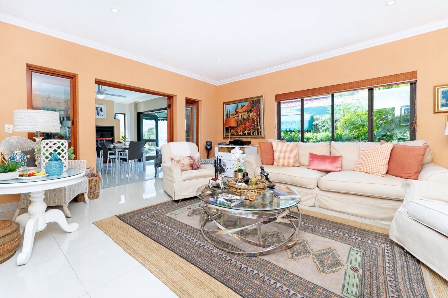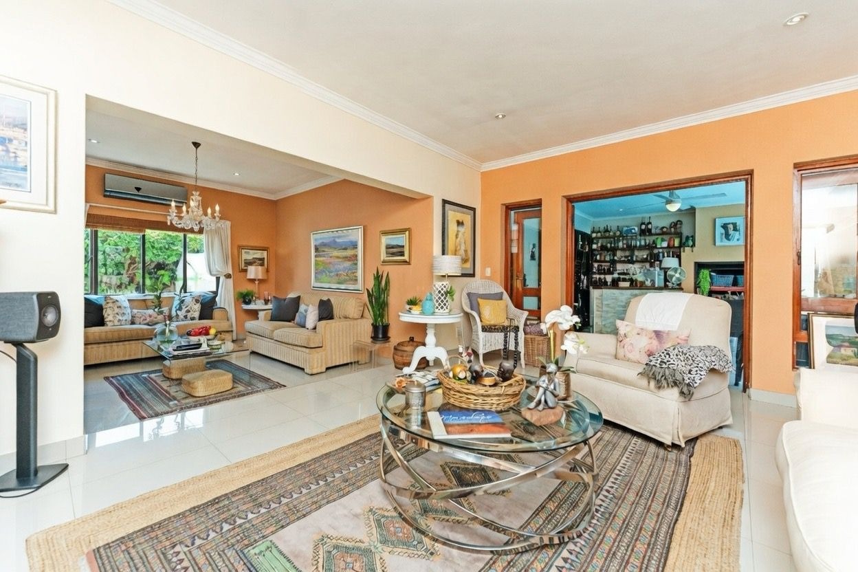 A welcoming entrance hall leads into expansive, light-filled reception areas. The formal lounge, arranged in two spacious sections, features a cosy fireplace. Entertaining continues effortlessly with a fitted bar and enclosed patio with built-in braai and stacking doors, opening onto a tranquil Mediterranean-style backyard oasis. The