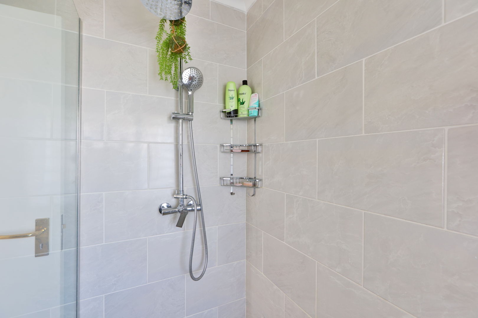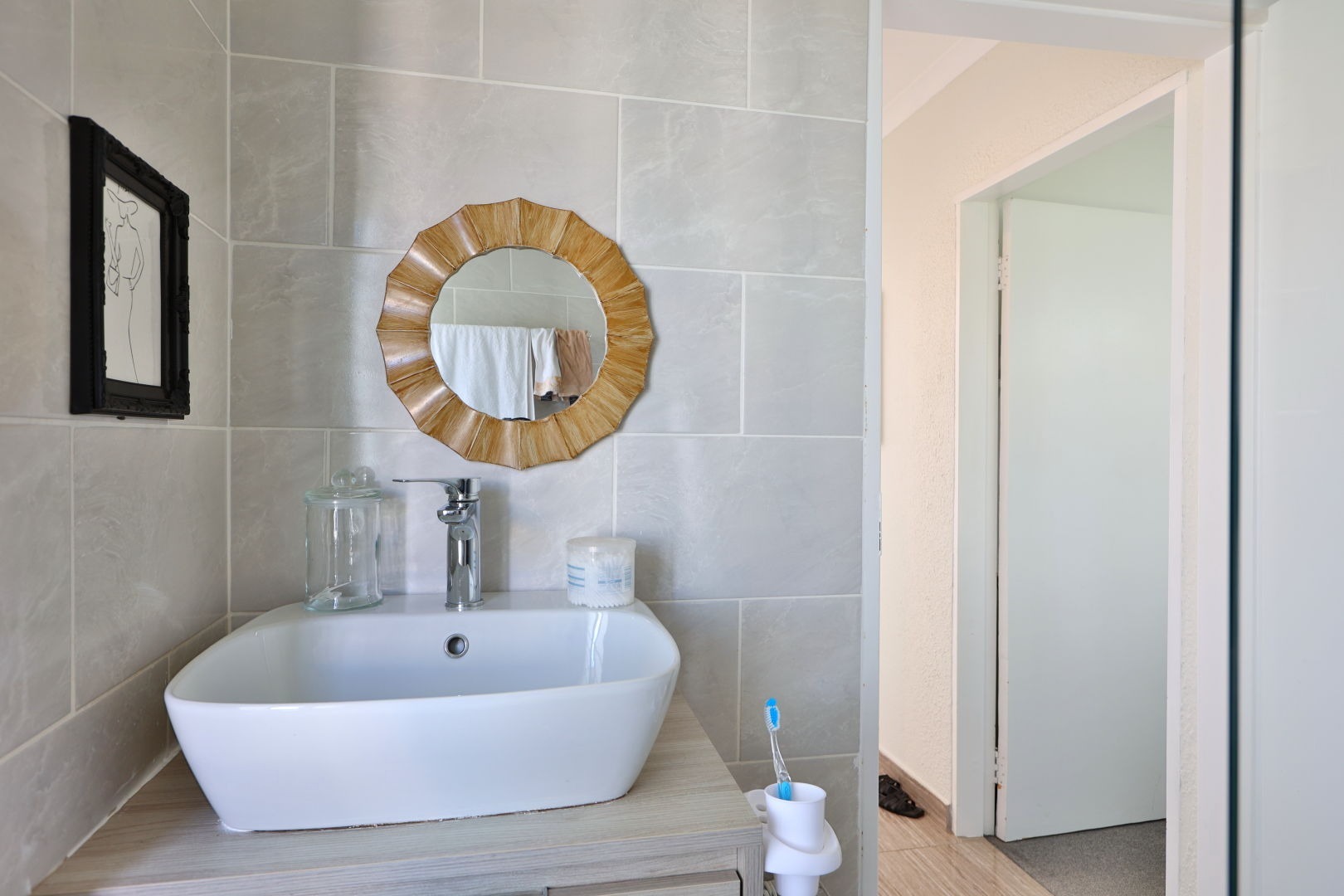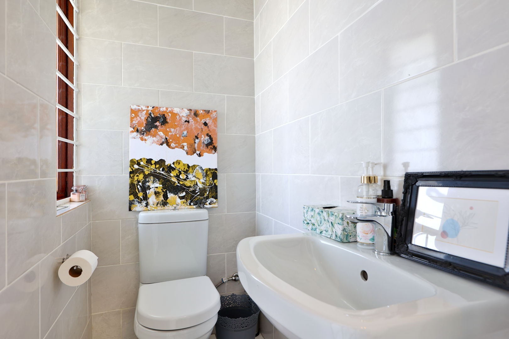The main bedroom is a cozy retreat with built-in cupboards that wrap around the room and a charming built-in vanity. The main bathroom with a walk-in shower is located just opposite the bedroom, with a separate guest loo for added convenience.