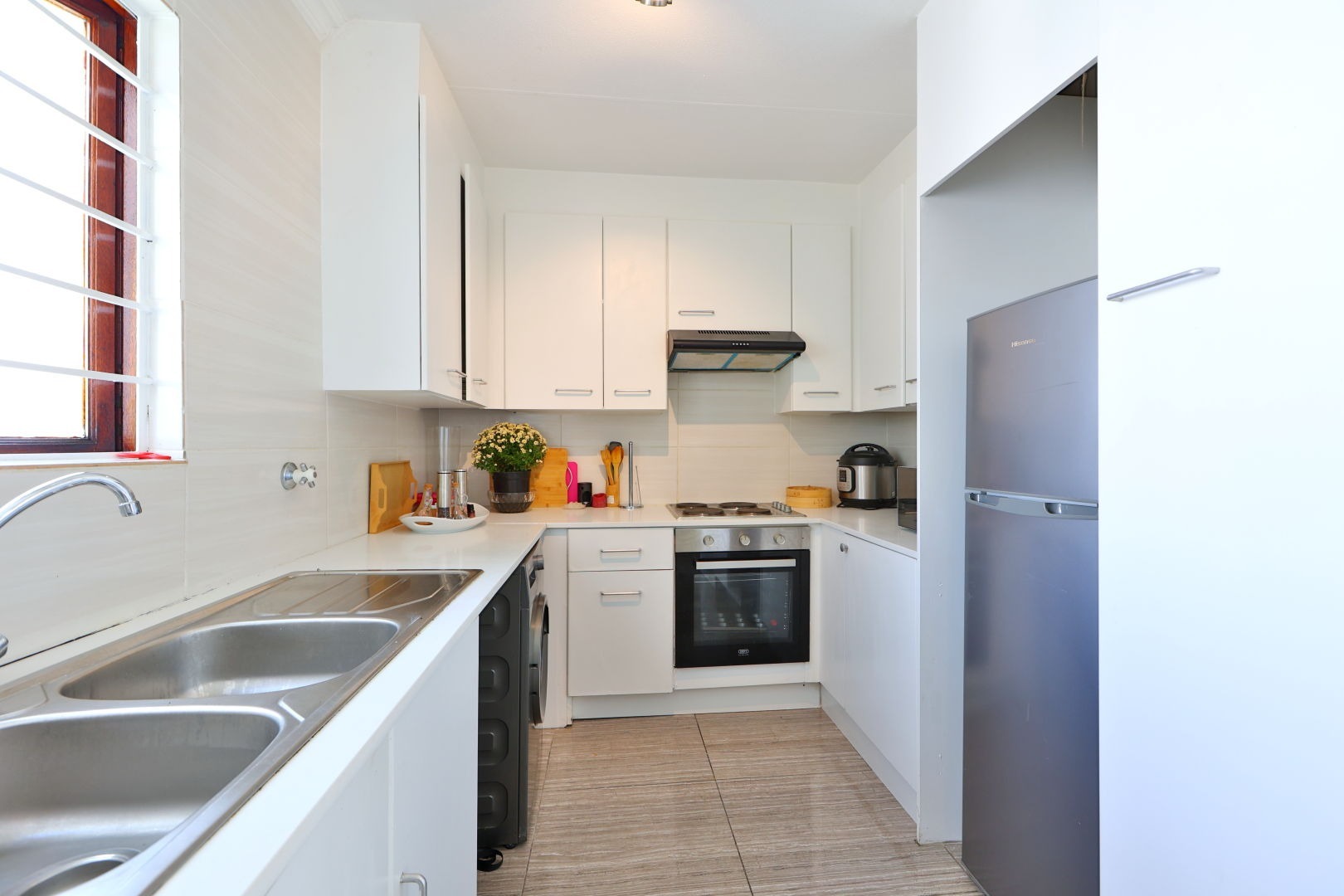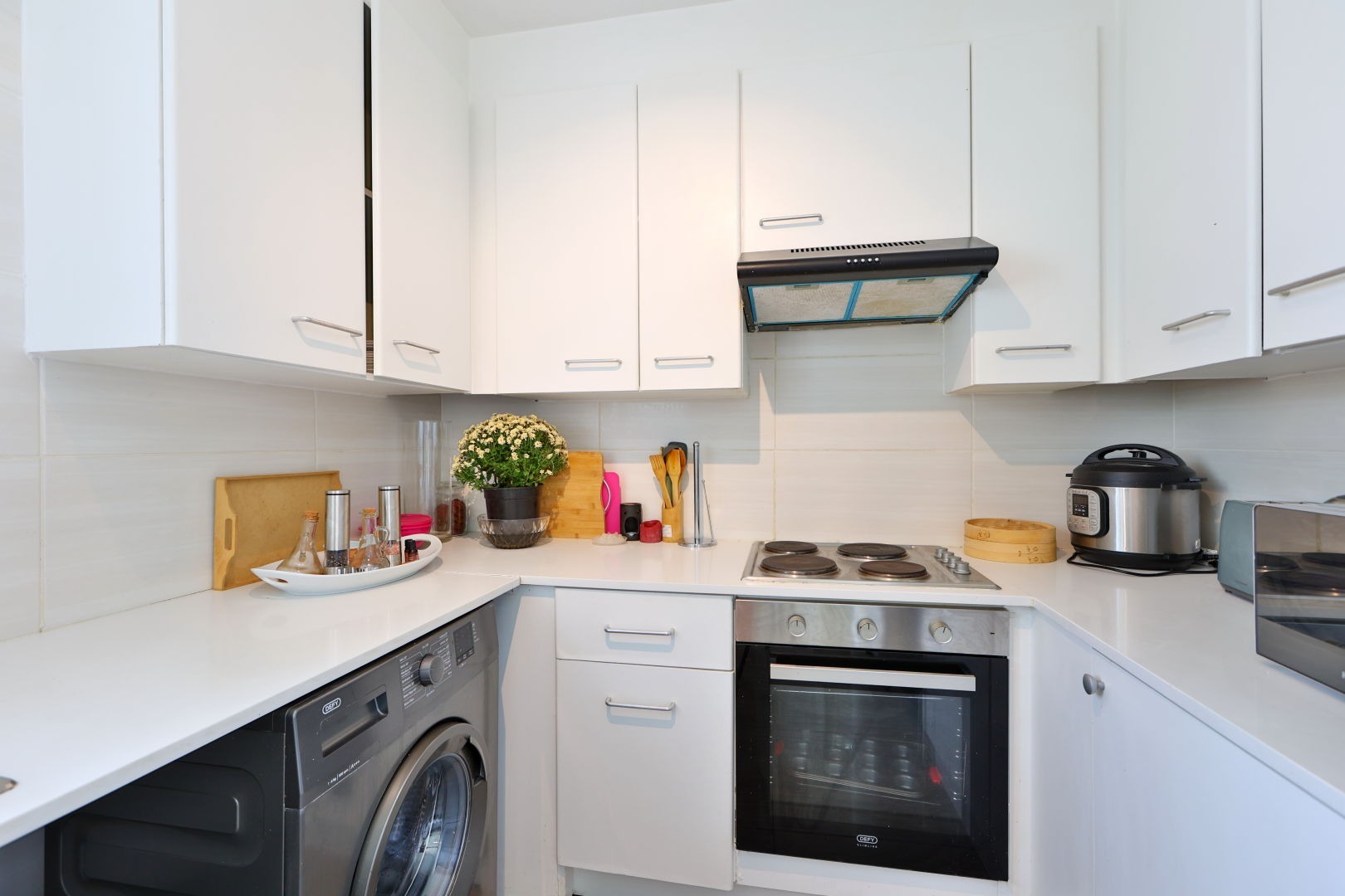 double sink, and space for two under-counter appliances. Cooking is made easy with an oven, stove, and extractor fan.