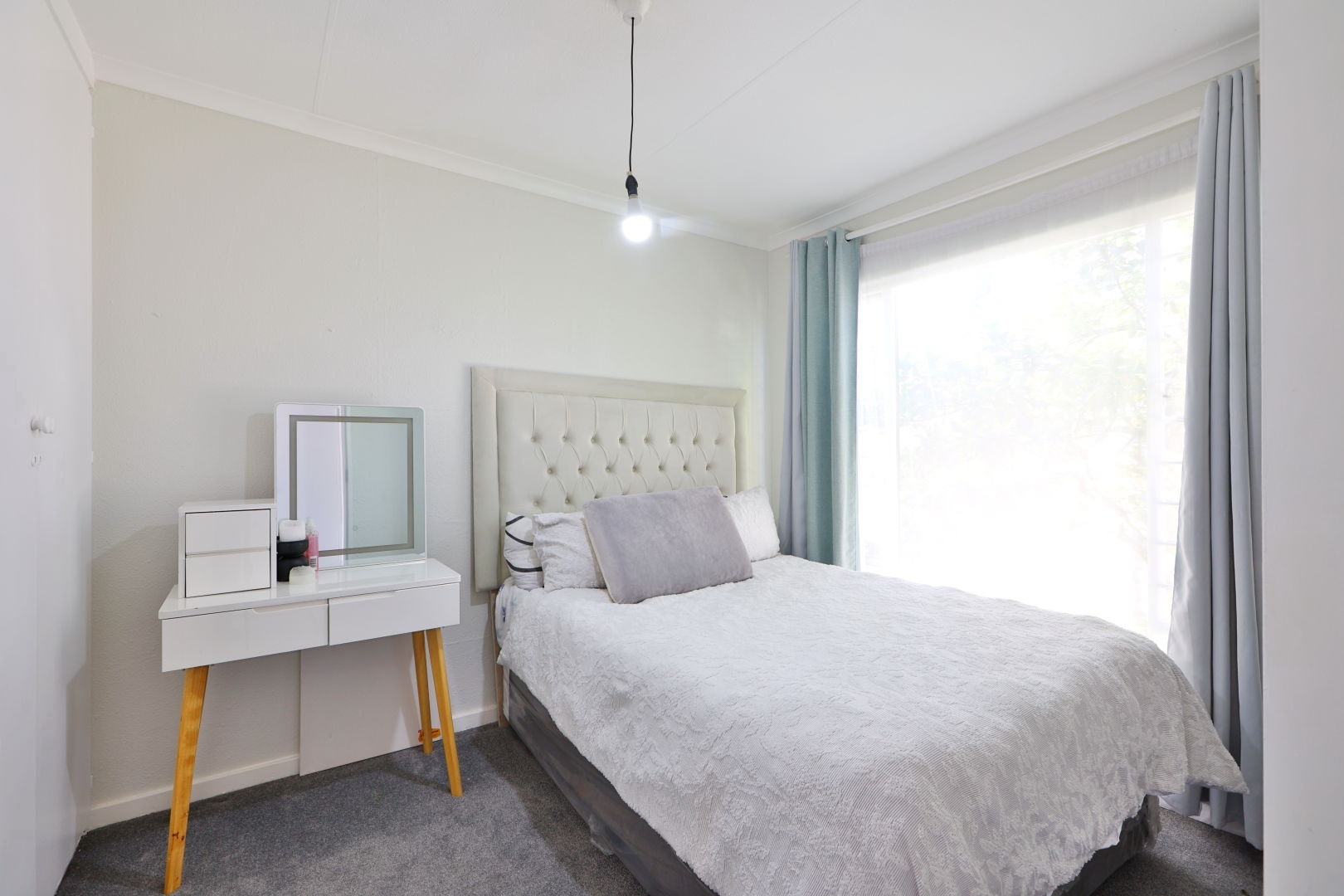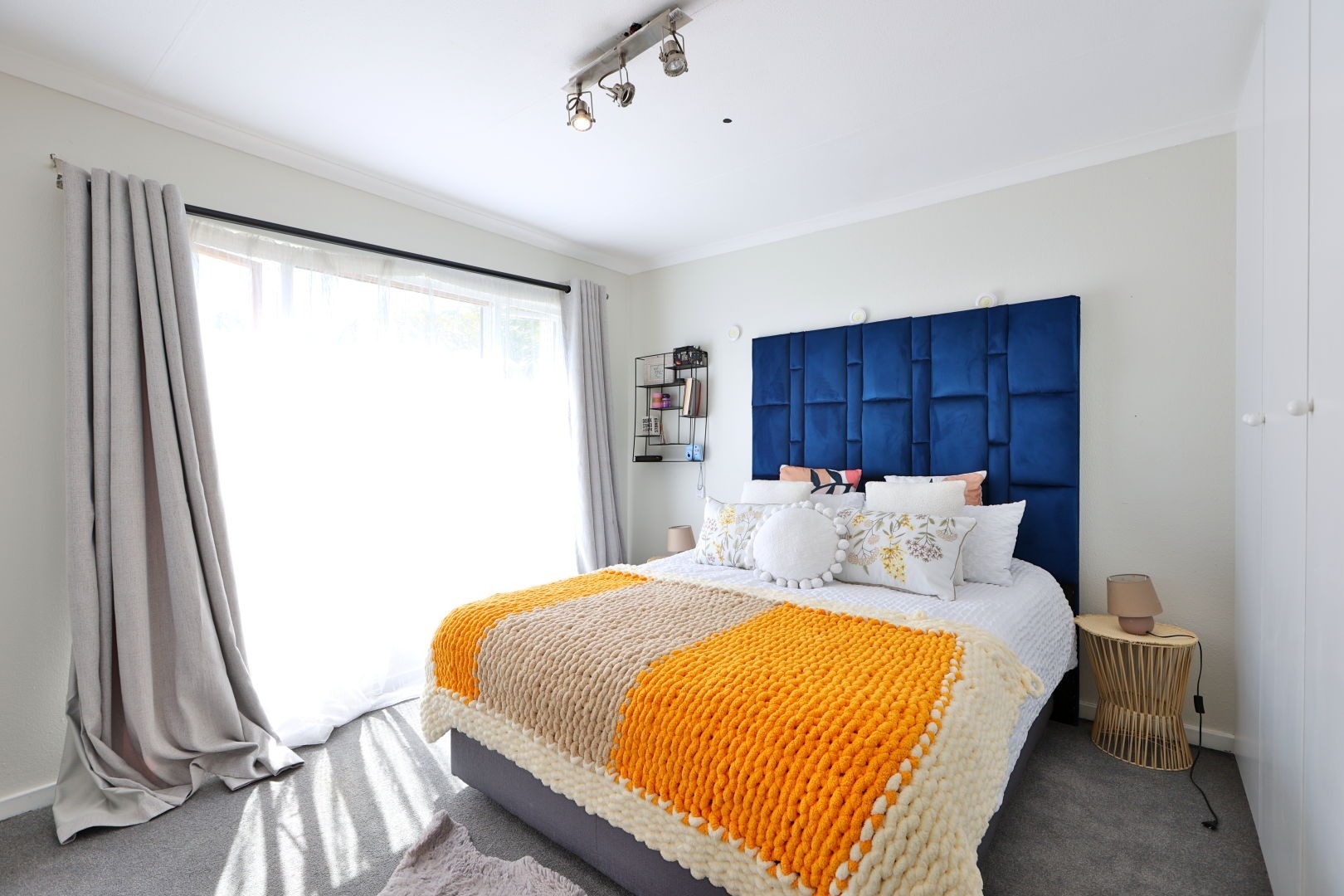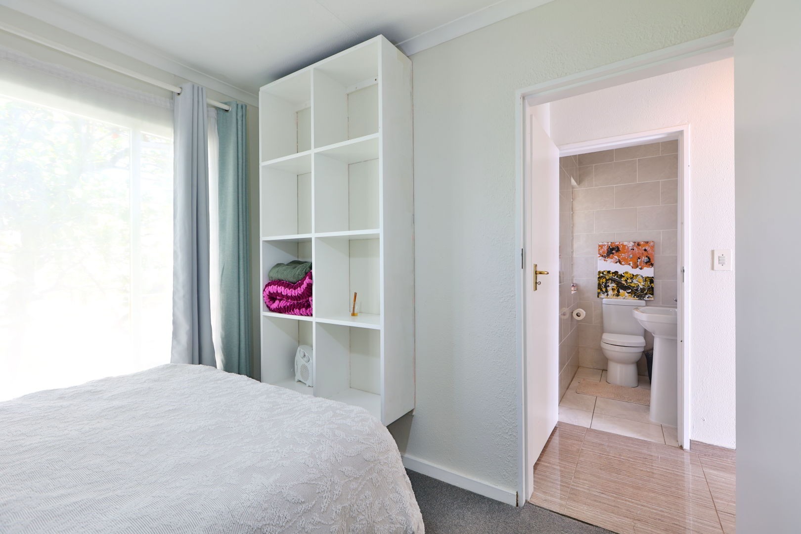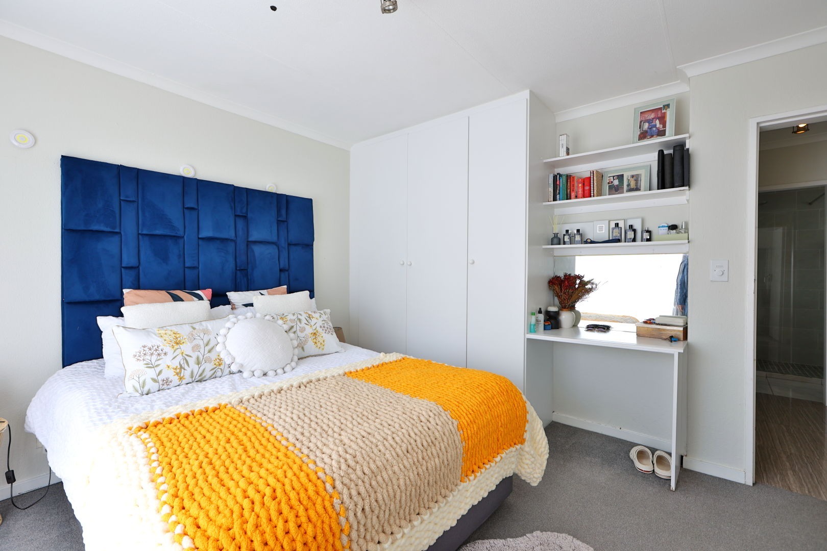 The second bedroom is ideal for guests, a home office, or a creative space — complete with built-in cupboards and a handy extra storage shelf.
