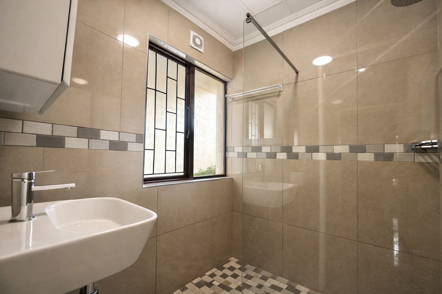 Both bedrooms are spacious and filled with natural light, with tasteful tiled flooring and a calm, neutral finish. The apartment features one well-appointed bathroom, complemented by a separate guest toilet, adding practicality and comfort.