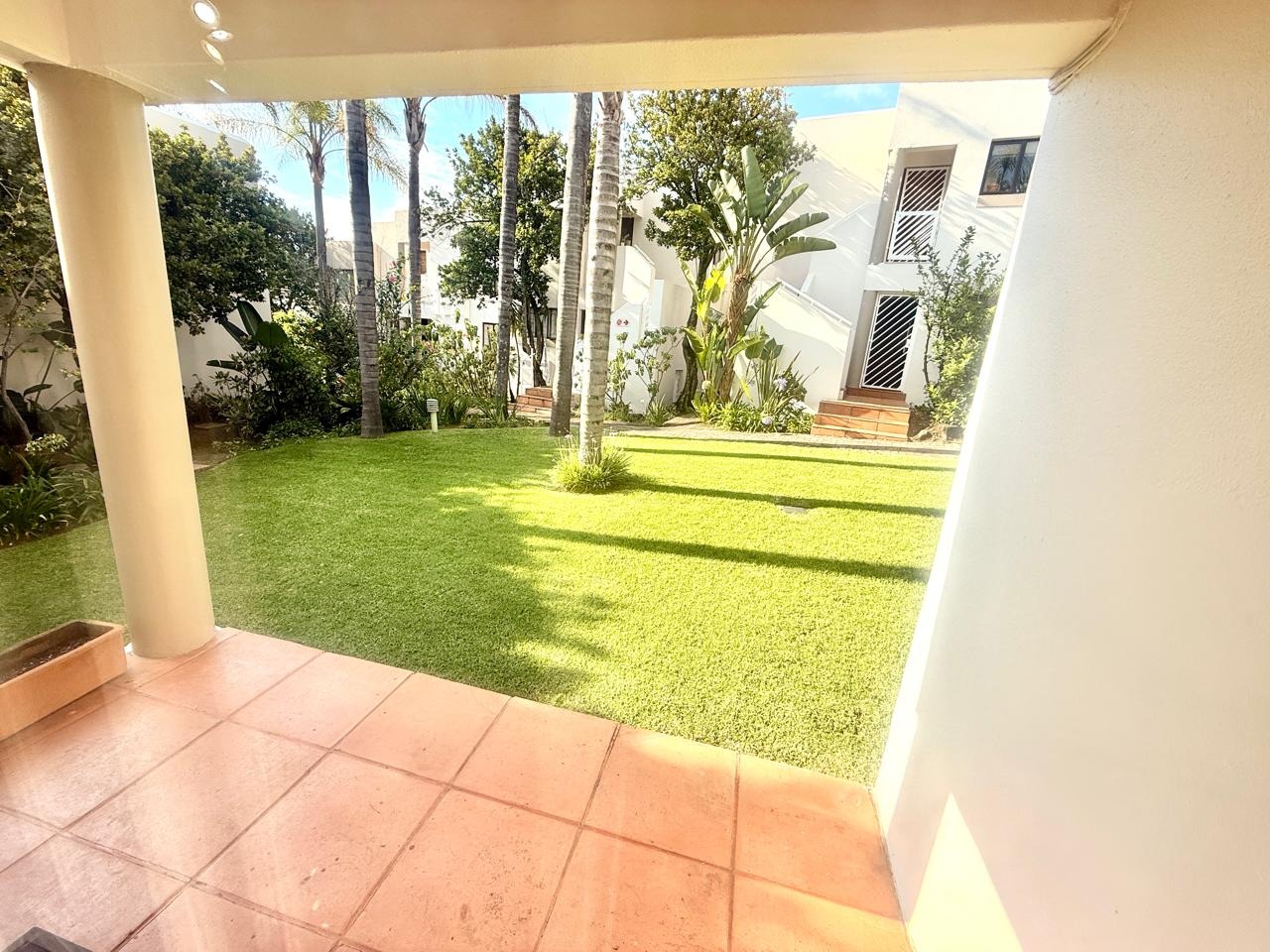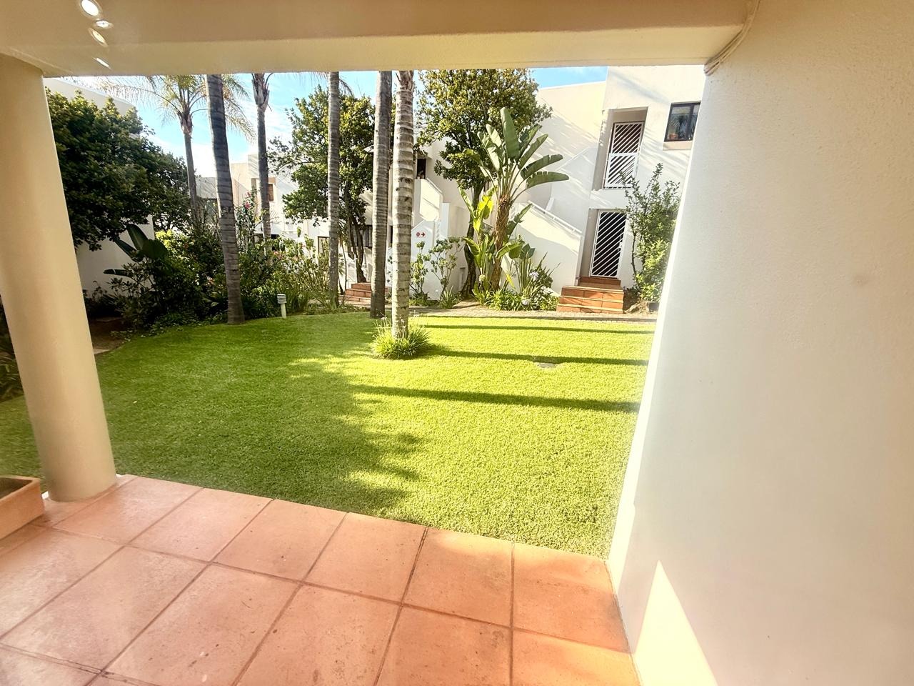 The living and dining area opens onto a covered garden patio that overlooks manicured communal gardens, ideal for quiet mornings, relaxed entertaining, or enjoying the greenery that surrounds the apartment.