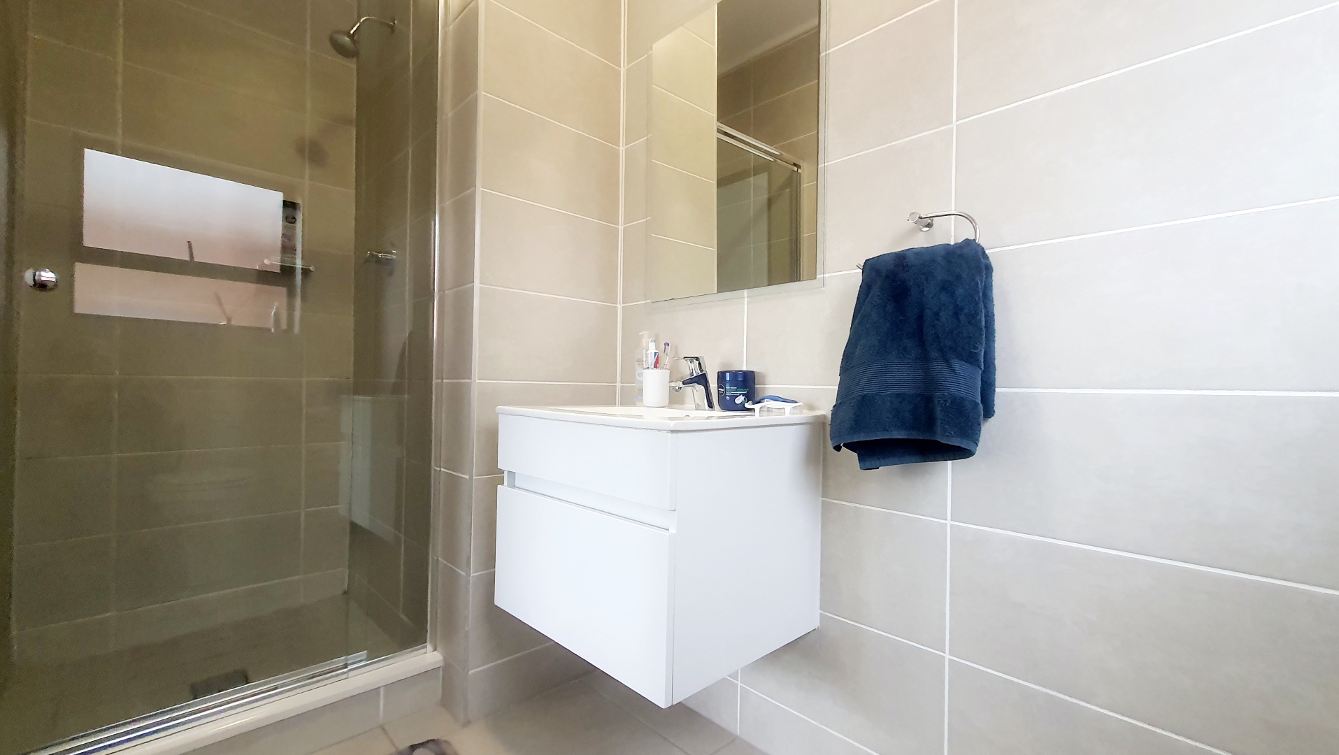 Both bedrooms are comfortably sized, with the main bedroom offering the convenience of an en-suite bathroom. Each bathroom includes a modern shower and vanity.