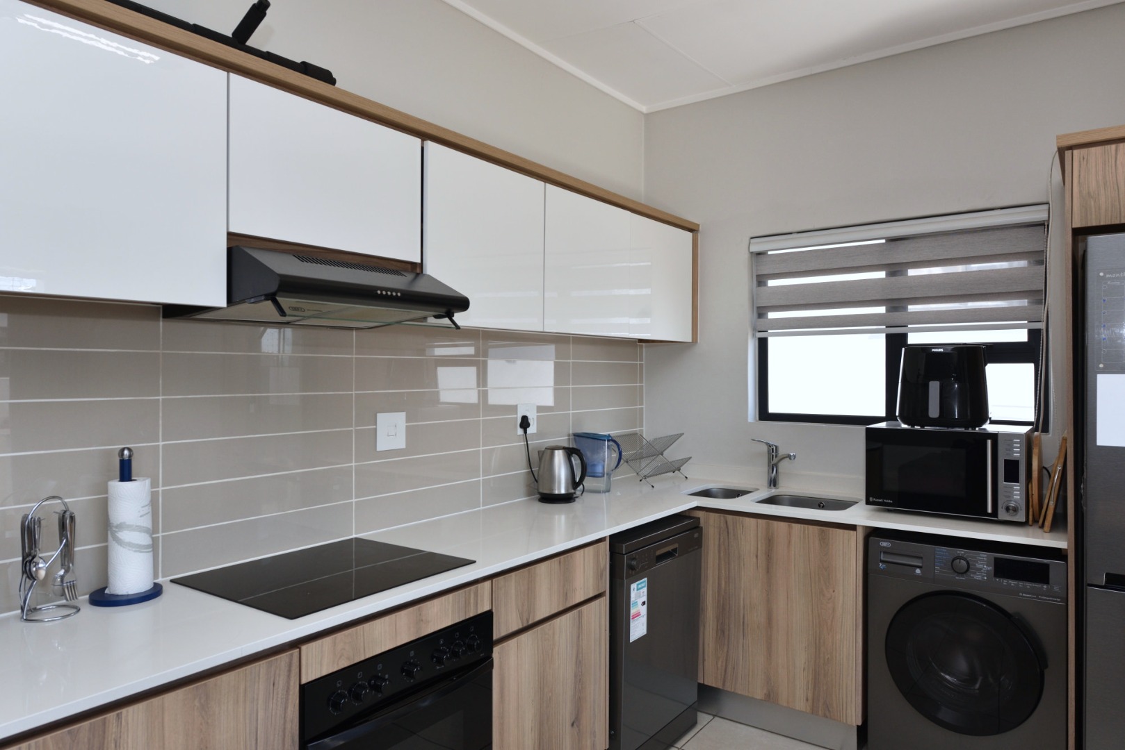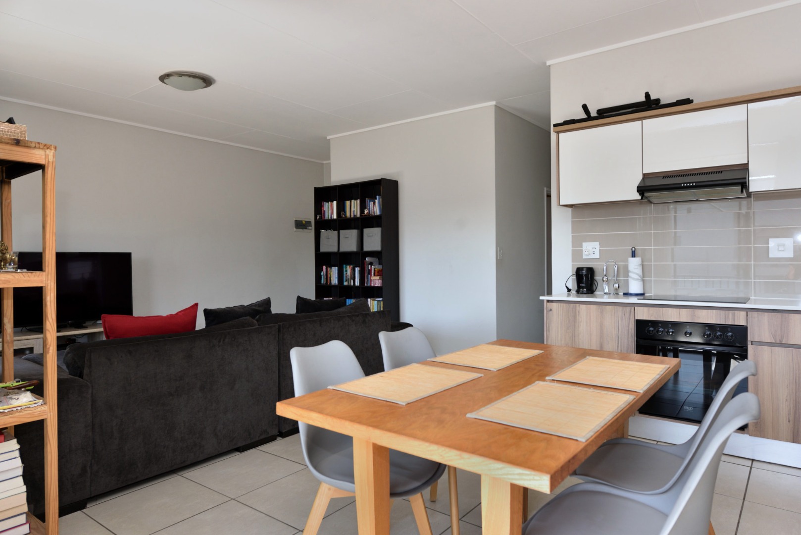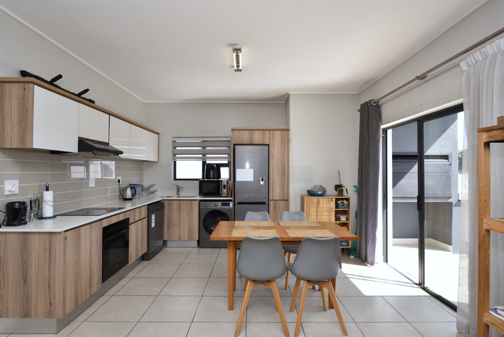 The open-plan kitchen is the heart of the home, featuring Caesarstone countertops, a built-in stove, hob, and extractor, along with premium appliances including a fridge, dishwasher, and washing machine/dryer combo. A central dining area flows effortlessly into the lounge, creating a functional and stylish space that opens up for entertaining or everyday relaxation. Whether hosting friends or enjoying a quiet evening in, this layout offers both comfort and convenience.