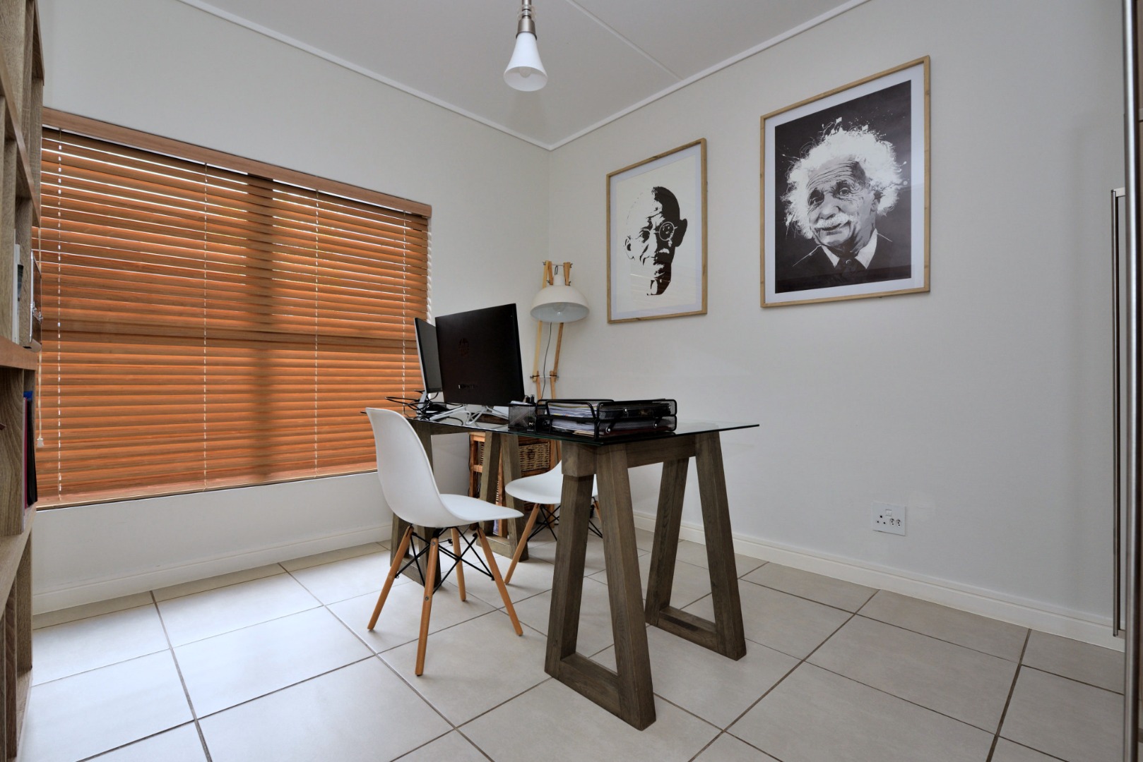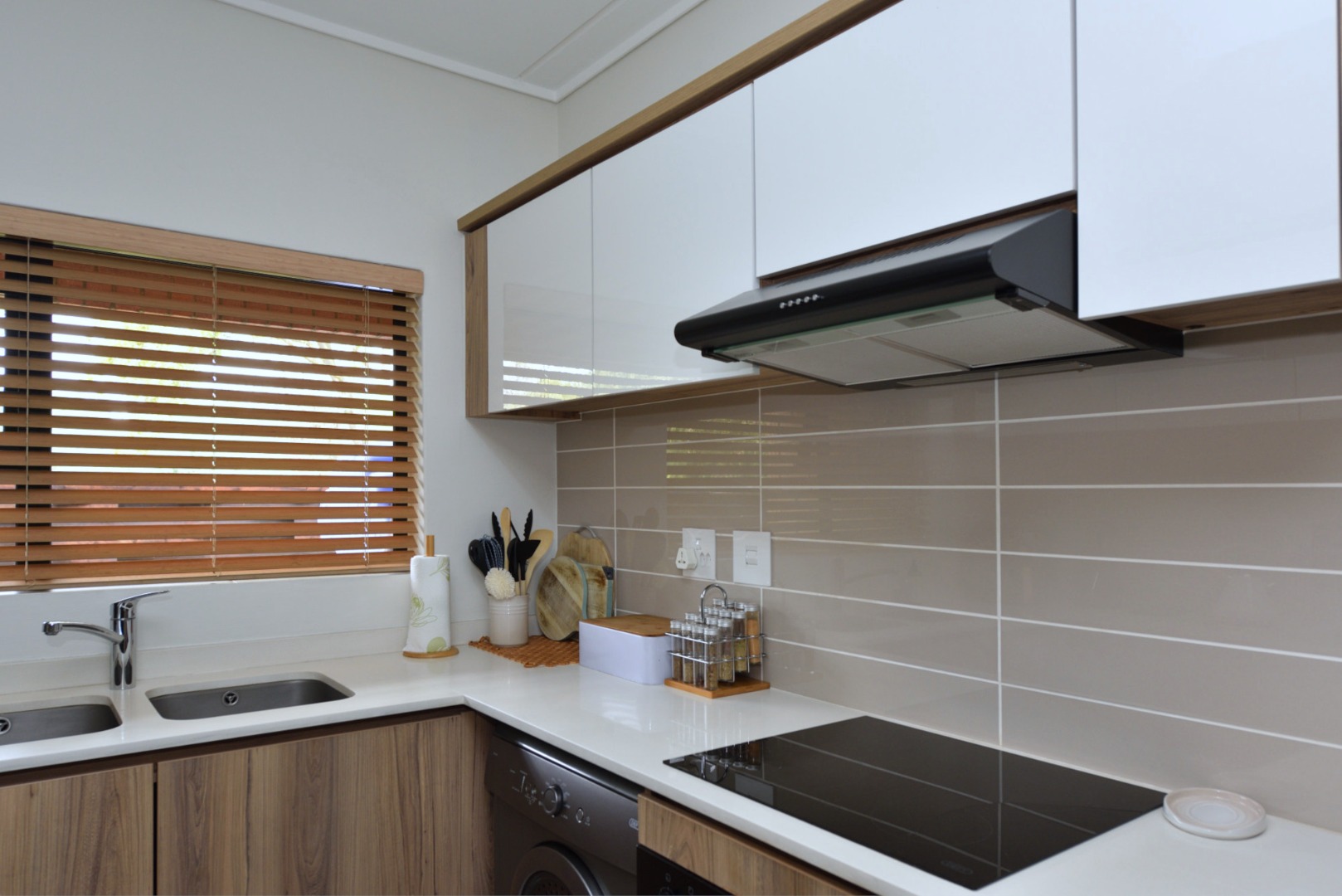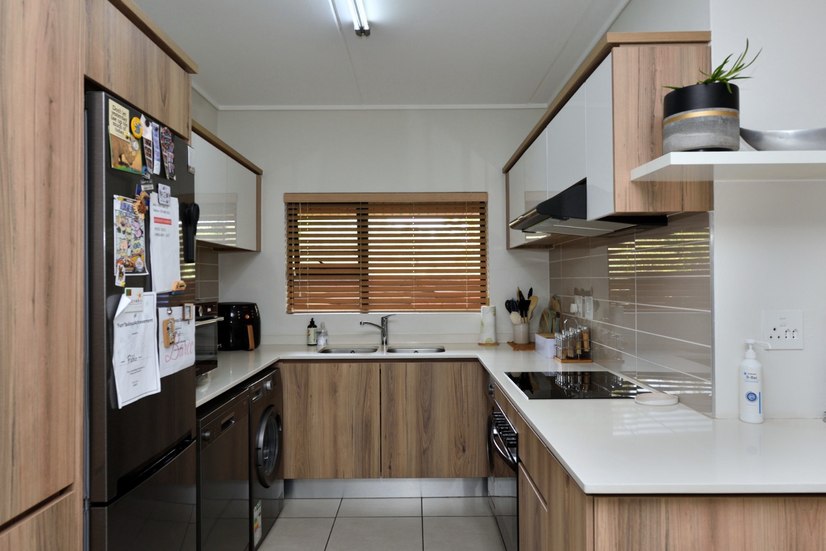 The kitchen is sleek and functional, boasting Caesarstone countertops, an electric hob, oven, and extractor fan, ideal for home cooks and entertainers alike. Included in the sale are the fridge, dishwasher, washing machine and tumble dryer. The living area opens up to a covered patio that extends into a spacious open patio with a cozy fire pit, perfect for evening gatherings. The patio and lounge connection creates a seamless indoor-outdoor living experience that maximizes natural light and space.