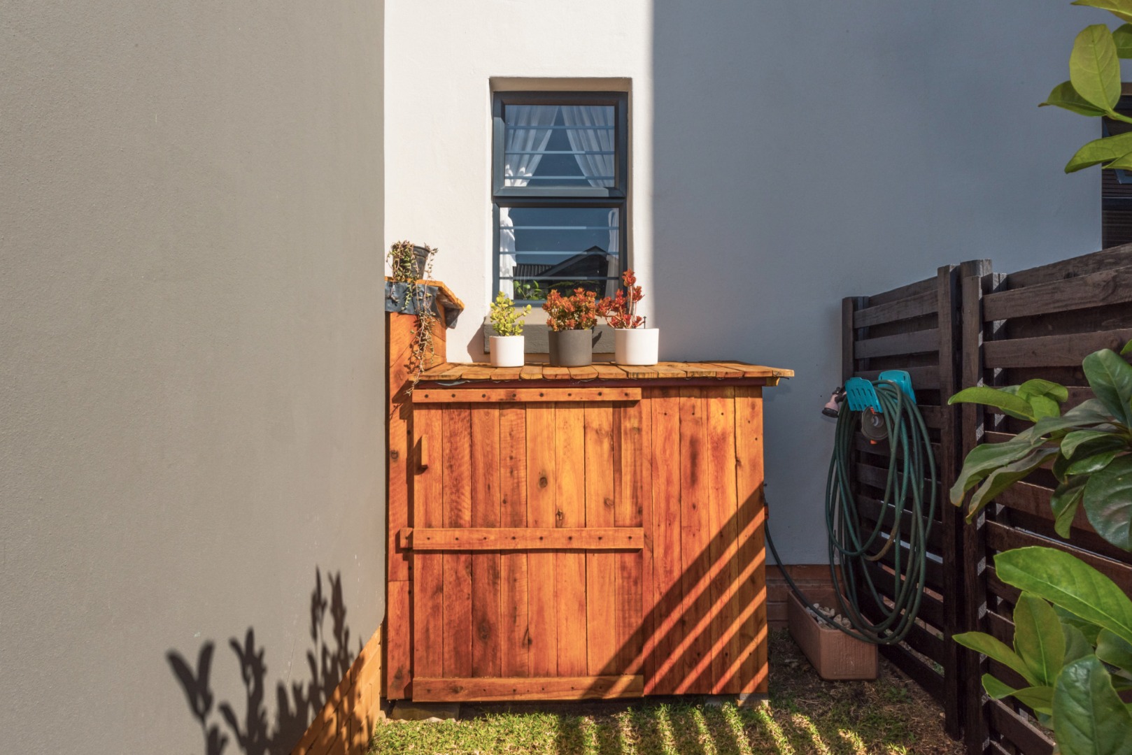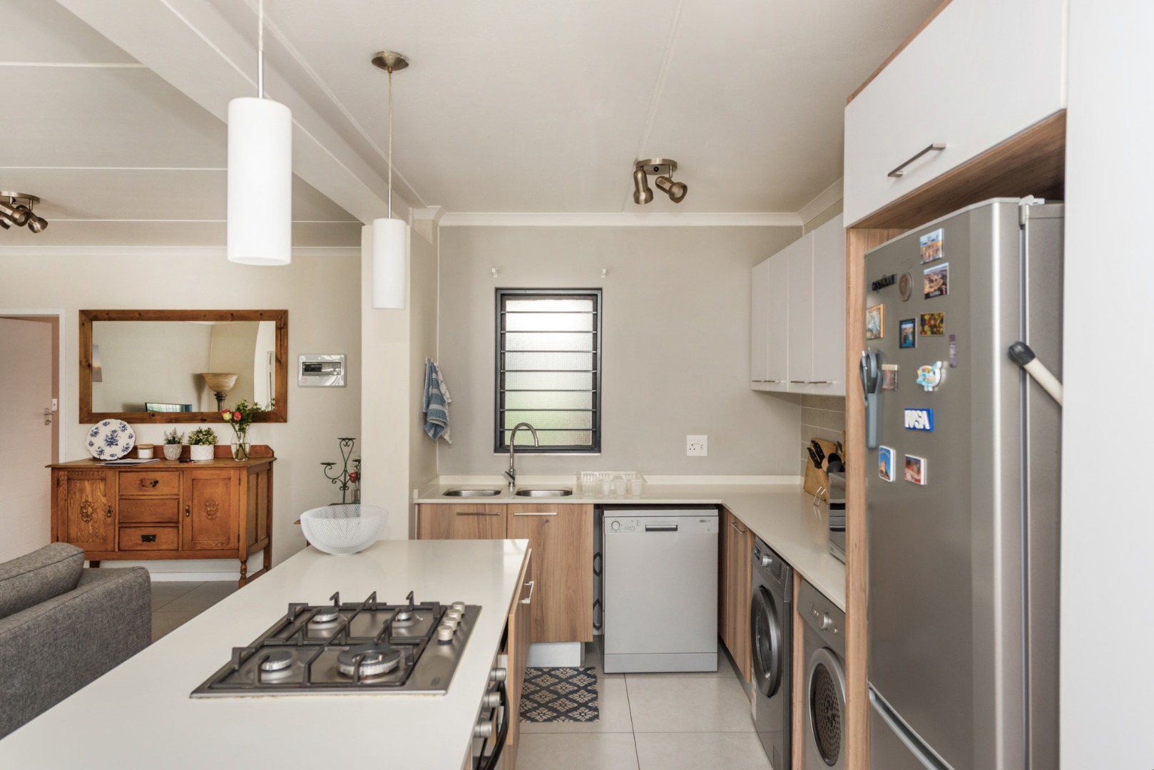 The heart of the home is the beautifully designed open-plan kitchen, finished with sleek Caesarstone countertops and a spacious central island fitted with a gas hob and electric oven. With ample cupboard space, room for three undercounter appliances, and space for a double-door fridge, the kitchen flows effortlessly into the dining area and lounge. From here, a sliding door opens onto the covered patio complete with a built-in gas braai – the perfect spot for entertaining while enjoying the view of your generous garden.