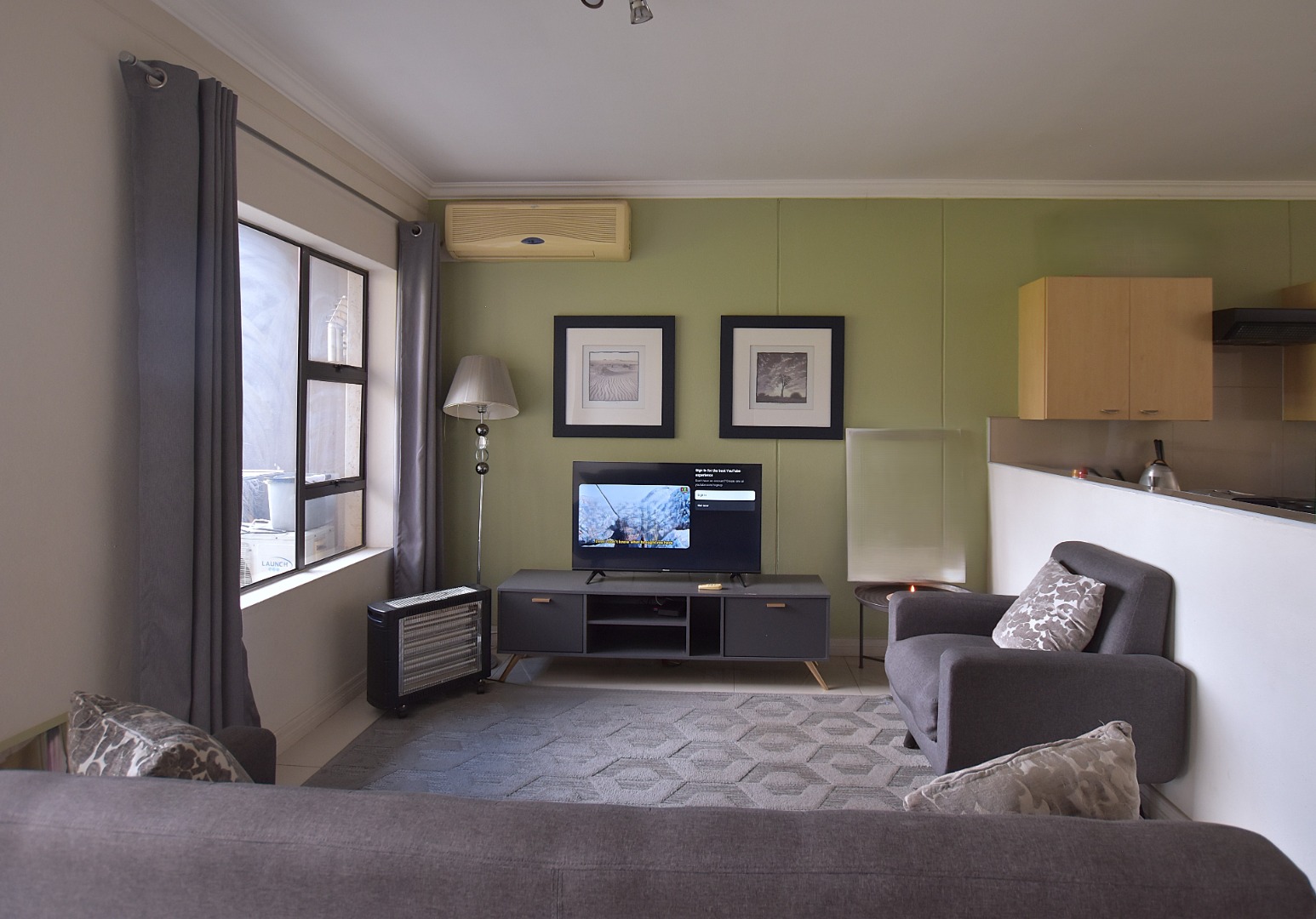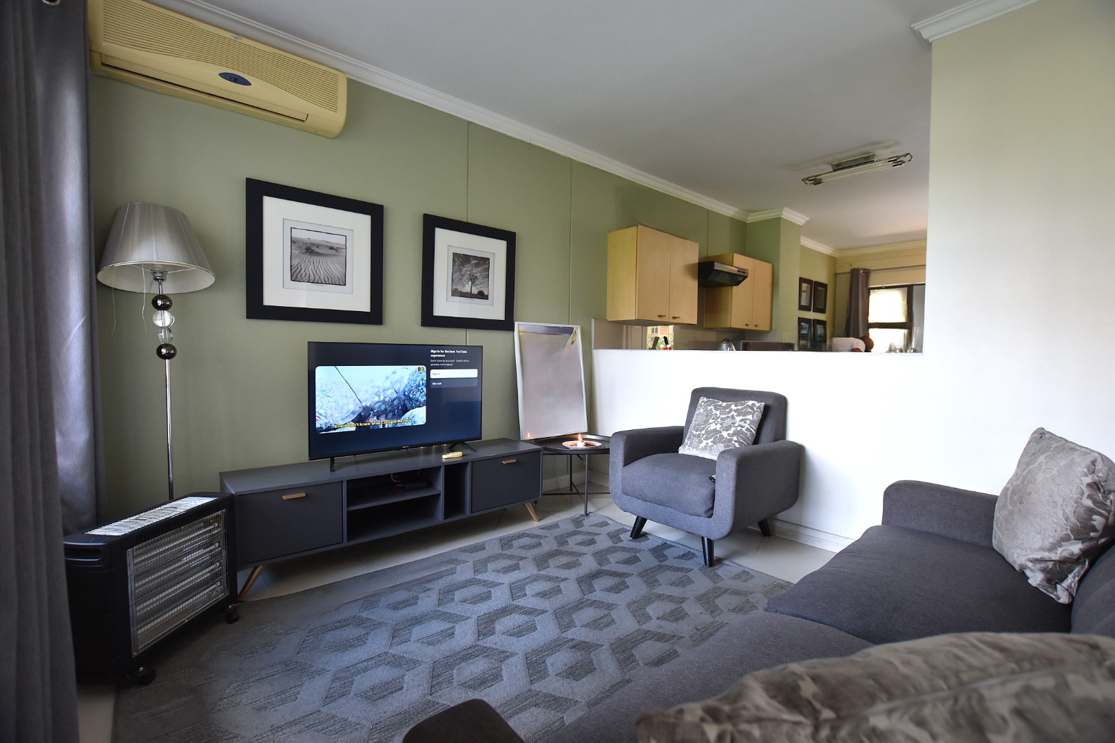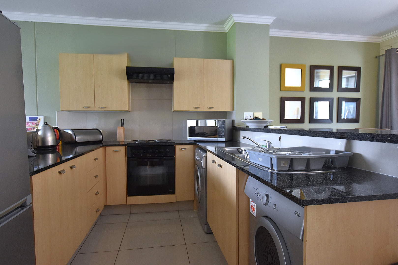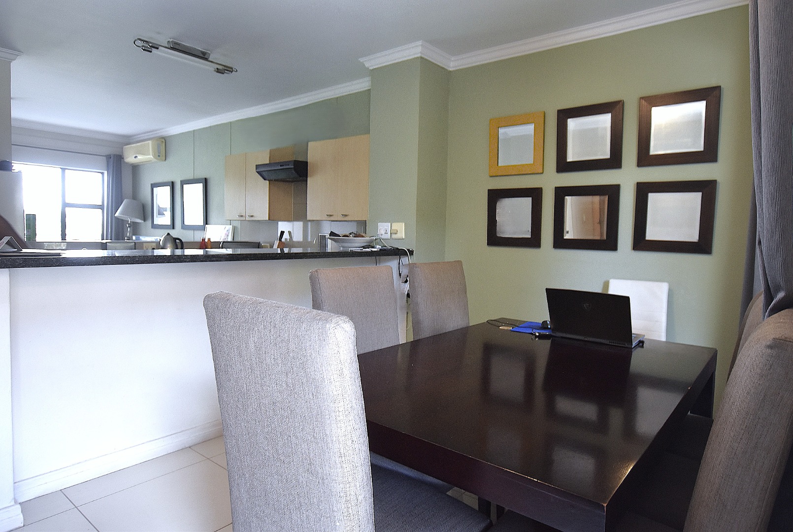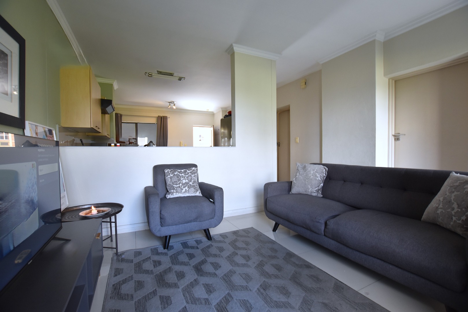 Discover modern living in this inviting 80 sqm apartment, ideally situated within a contemporary building in Morningside, Sandton. The residence boasts a sleek, open-plan design, seamlessly connecting the lounge, dining area, and kitchen. Natural light floods the living spaces, enhanced by a tasteful grey and green colour palette and modern furnishings. The functional kitchen features light wood cabinetry, dark countertops, with space for all appliances, flowing into a dining area .