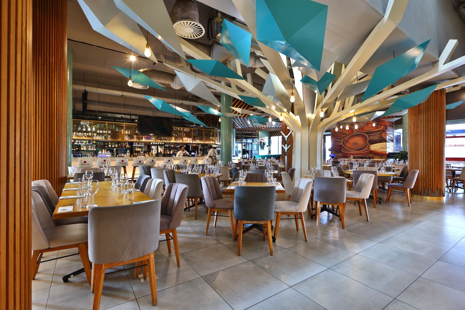 Stylish restaurant with indoor and outdoor dining, including Godfather and Bowled