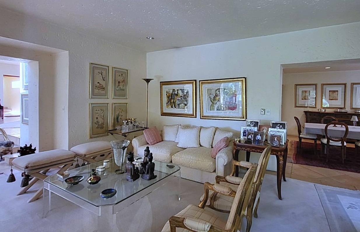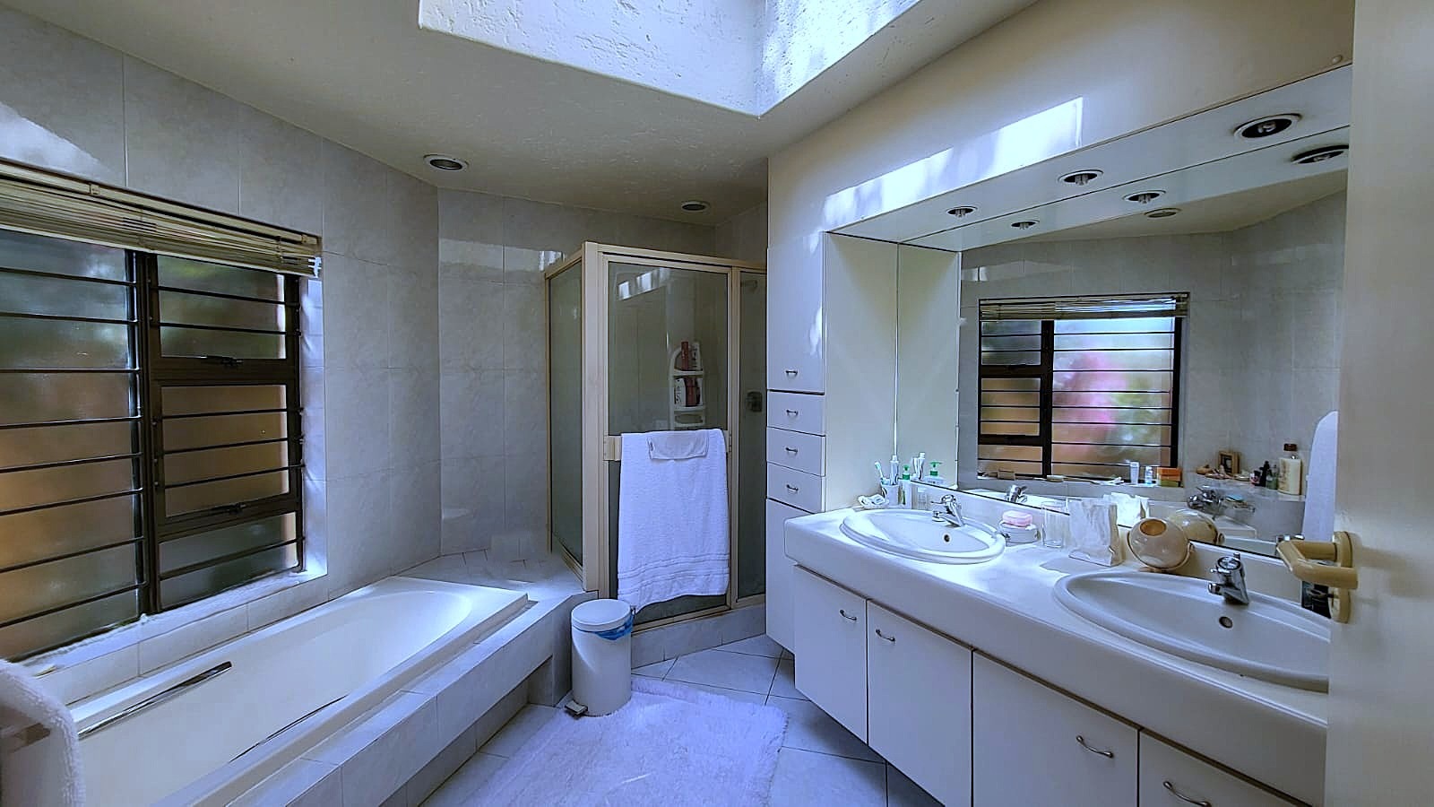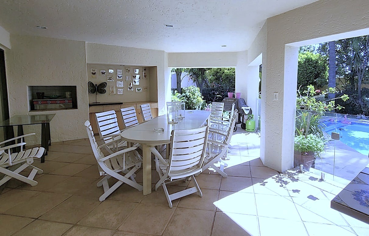 Step outside to discover a private oasis, perfect for outdoor living and entertaining. The property features a large swimming pool surrounded by a lush, mature tropical garden with an irrigation system. Expansive covered patios offer multiple areas for dining and relaxation, complete with a built-in barbecue station.
