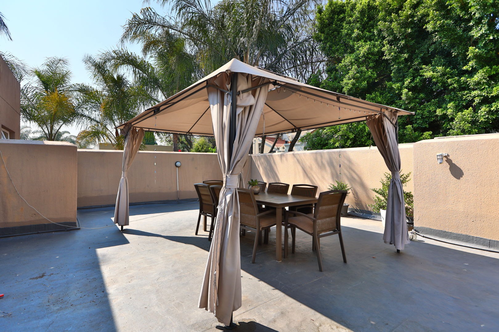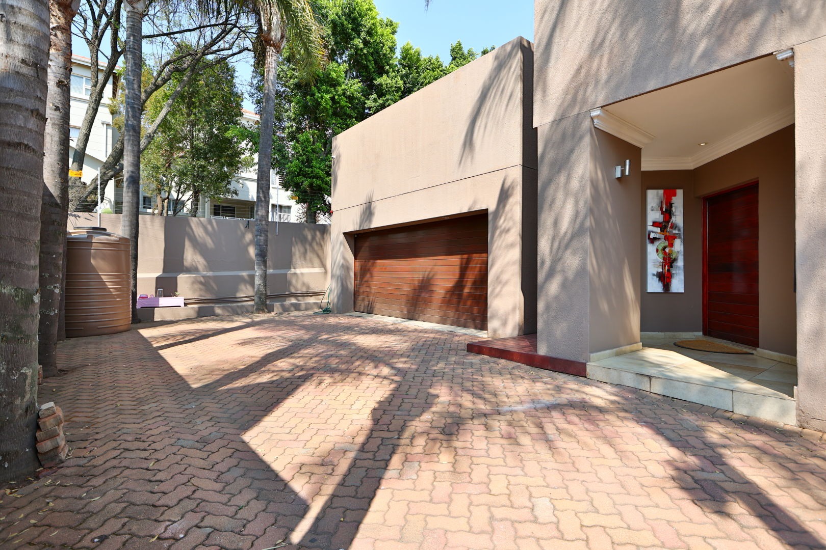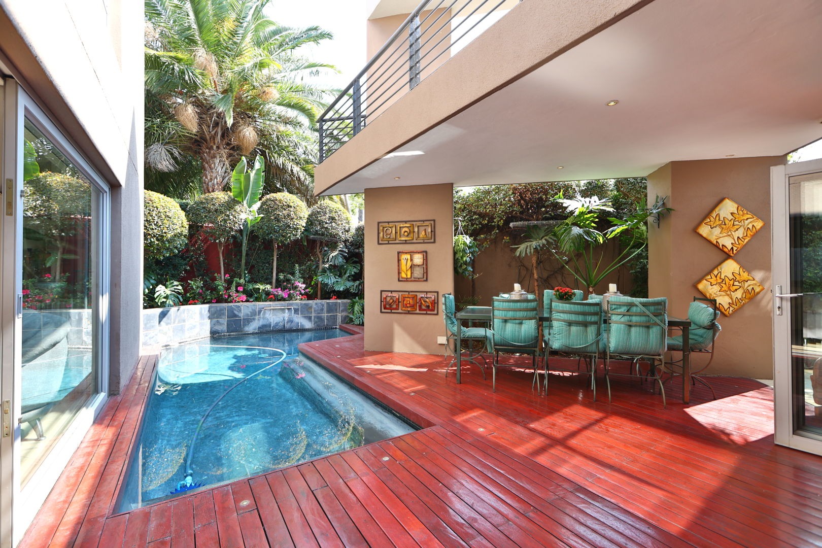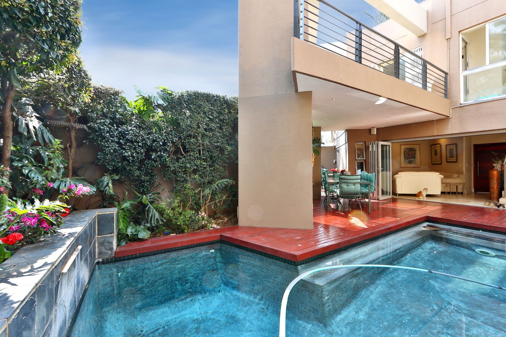 Discover this modern 3-bedroom, 2.5-bathroom home situated within a secure complex in Morningside, Sandton. The property boasts excellent kerb appeal with its contemporary design and a welcoming entrance hall featuring a modern tiled staircase with stainless steel railing. Inside, the open-plan living areas, including two lounges and a dining room, flow seamlessly, enhanced by large sliding doors that invite natural light and connect to the outdoors. The modern kitchen is a highlight, equipped with a large island, integrated stovetop, stainless steel appliances, contemporary cabinetry, and a pantry, perfect for culinary enthusiasts. Step outside to a private oasis featuring a dipping pool, wooden deck, and an intimate outdoor dining area amidst lush greenery, ideal for relaxation and entertaining. The home also includes a balcony and two garages. For comfort, air conditioning and a fireplace are provided, alongside a guest toilet and a dedicated family TV room. Security is paramount with 24-hour security, an access gate, security post, and electric fencing, ensuring peace of mind. This home is also equipped for sustainable living with fibre connectivity, a battery inverter, solar panels, and water tanks. Situated in the sought-after Morningside suburb of Sandton, this property offers convenient access to urban amenities within a secure complex setting. Key Features: * 3 Bedrooms, 2.5 Bathrooms * Open-Plan Living Areas * Modern Kitchen with Pantry * Private Dipping Pool & Deck * 2 Garages * Air Conditioning & Fireplace * Fibre Ready * Solar Panels & Inverter * 24-Hour Security Complex * Pets Allowed