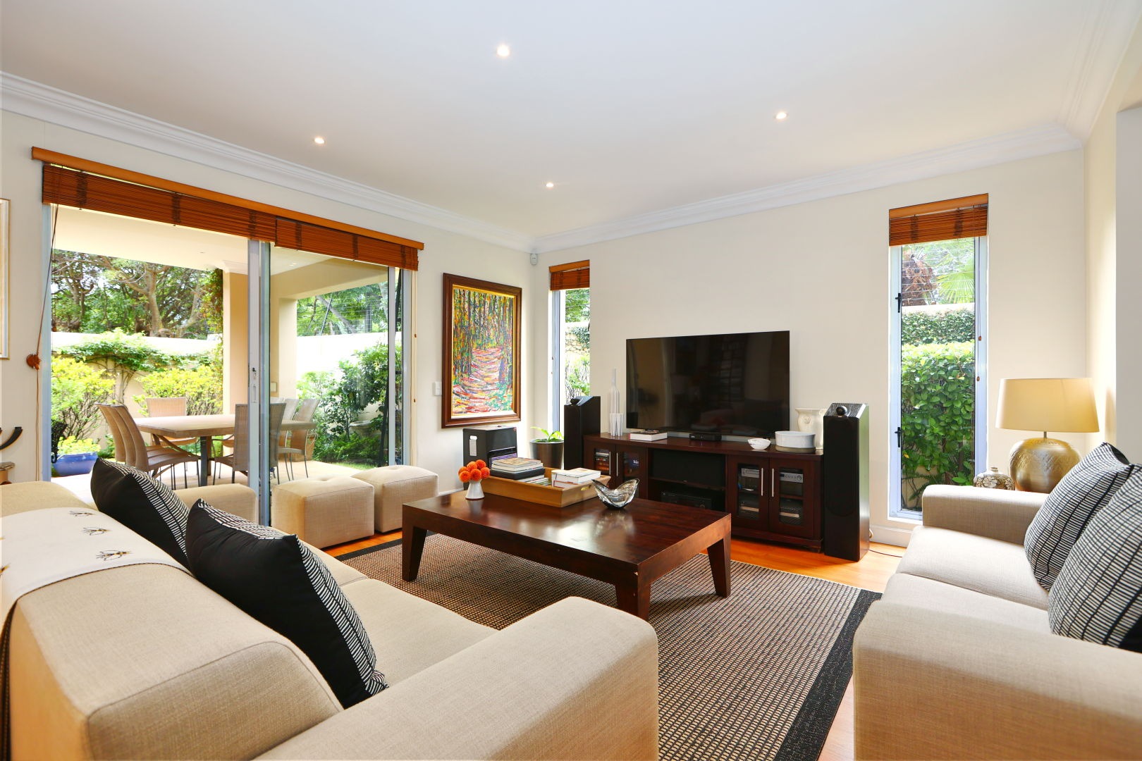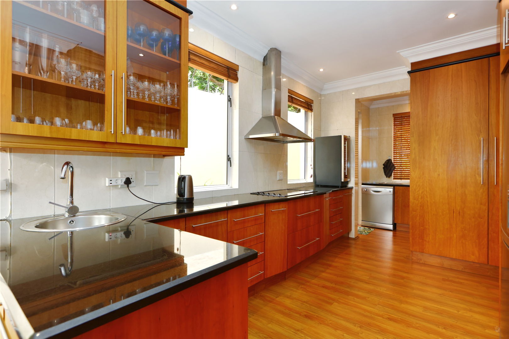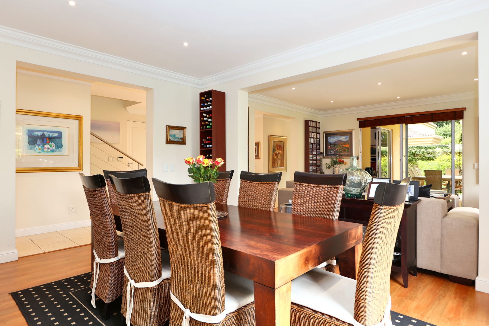 Step inside to discover an expansive open-plan design with double volume high ceilings throughout this home. Two sophisticated lounges and a dedicated dining area flow effortlessly, adorned with gleaming wooden floors, elegant crown moulding, and recessed lighting. Large sliding doors invite abundant natural light and provide seamless access to the private outdoor patio and garden, perfect for entertaining. The gourmet kitchen is a culinary delight, boasting extensive warm wooden cabinetry, sleek black countertops, and integrated stainless steel appliances, all bathed in natural light from generous windows. The kitchen comes with a gorgeous cosy breakfast nook for family feasting or company and a separate scullery.