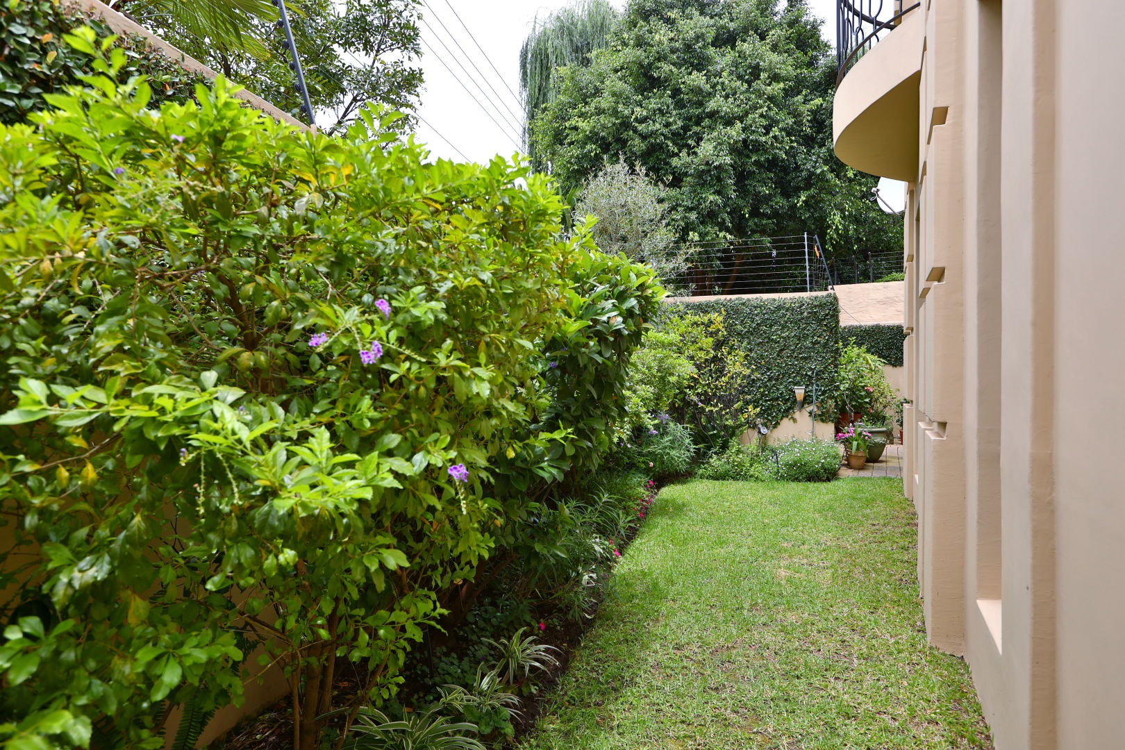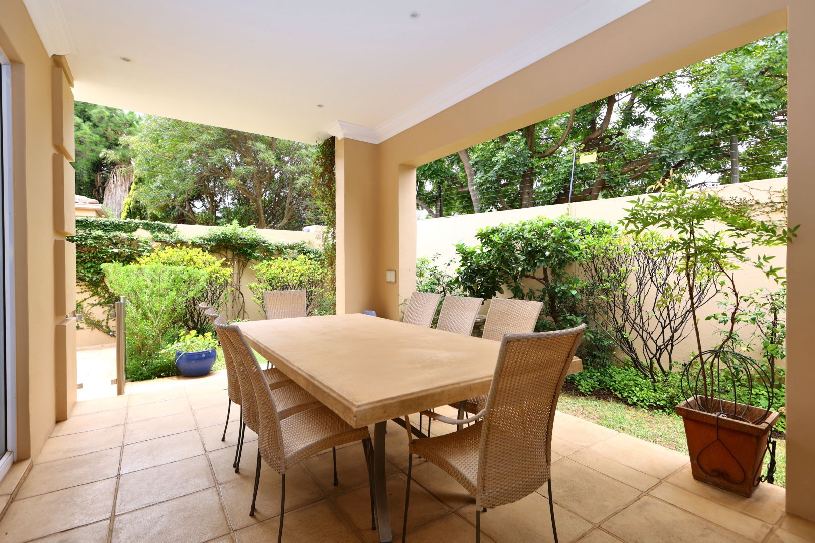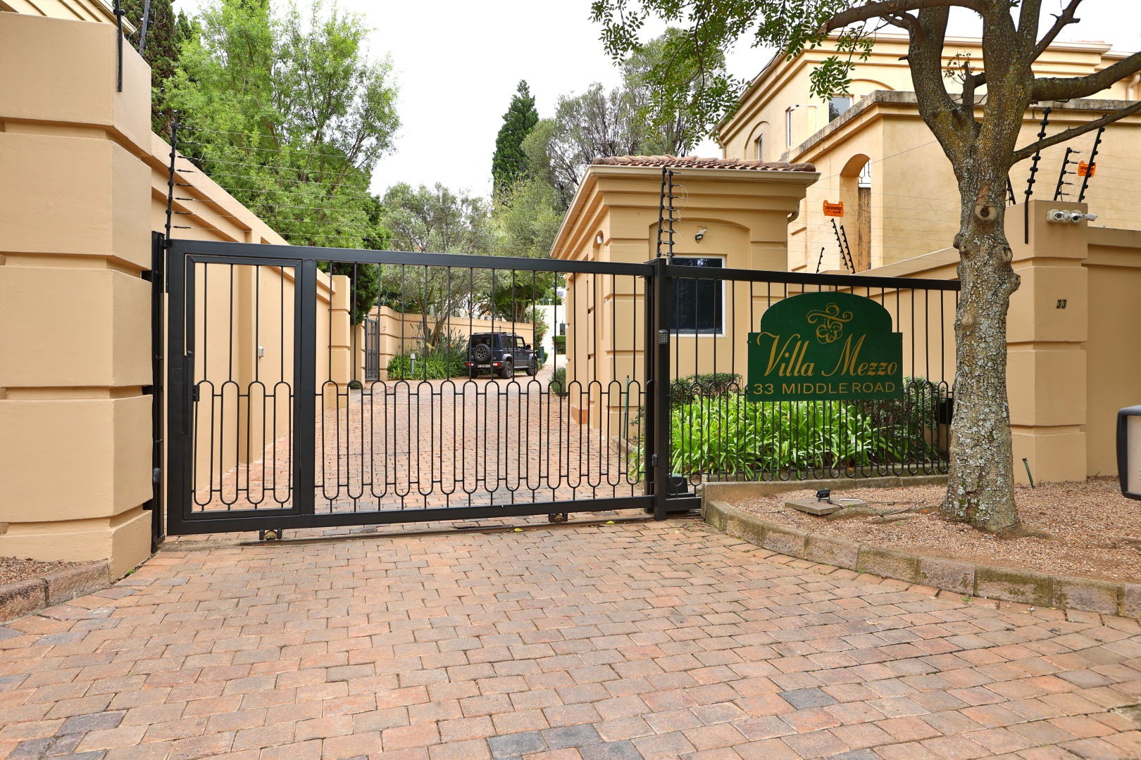 Nestled within a prestigious gated community in Sandton's coveted Morningside, this exquisite well-maintained residence immediately captivates with its refined kerb appeal. A warm, inviting exterior, complemented by a distinguished wooden garage door and a meticulously paved brick driveway, sets a tone of understated elegance. Lush, manicured landscaping and mature evergreen trees frame the property, ensuring privacy and a serene welcome. This secure small niche complex offers peace of mind, a hallmark of luxury living in South Africa.