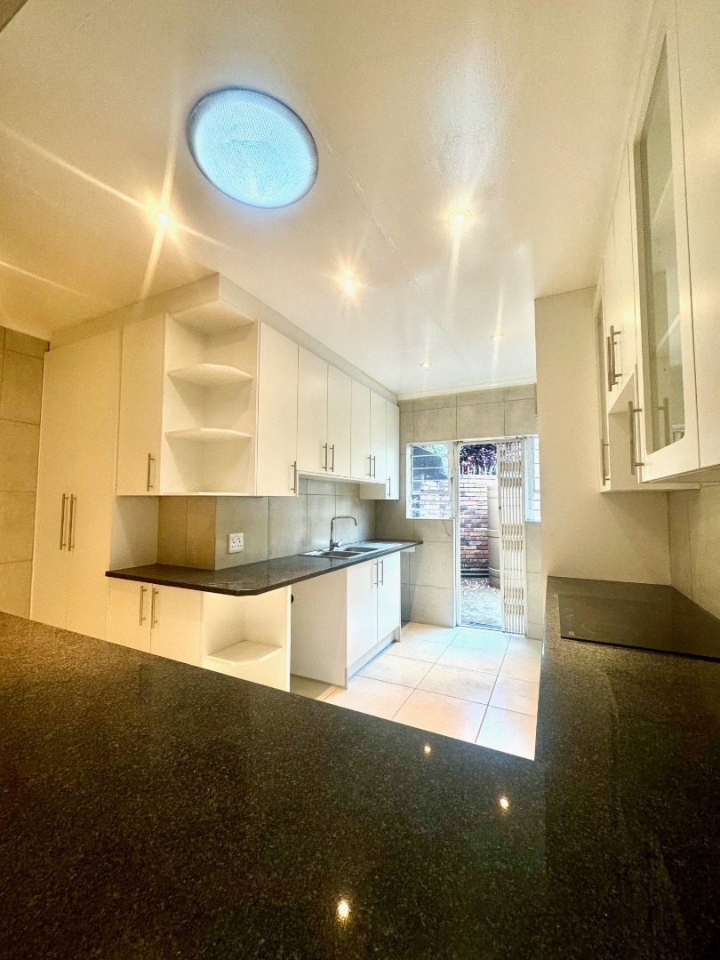 Presenting an exceptional residential opportunity within a secure subperb in the esteemed Morningside suburb of Sandton. This meticulously designed property spans a generous 150.00 sqm under roof, situated on a 200.00 sqm erf, offering a sophisticated lifestyle for discerning homeowners. The interior boasts an open-plan configuration, seamlessly integrating the lounge, dining room, and a contemporary kitchen. The kitchen is a focal point, featuring sleek white cabinetry, dark granite countertops, ample storage, and modern appliances, complemented by a skylight and recessed lighting for an inviting ambiance. Tiled flooring extends throughout the primary living areas, ensuring both elegance and ease of maintenance.
