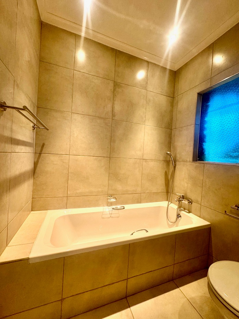 The residence comprises three well-proportioned bedrooms and two bathrooms, including a private en-suite for enhanced comfort and privacy. Neutral wall finishes provide a versatile canvas for personal customisation, while built-in cupboards offer practical storage solutions. Natural light permeates the living spaces through large windows and sliding doors, many of which are equipped with security grilles for peace of mind.