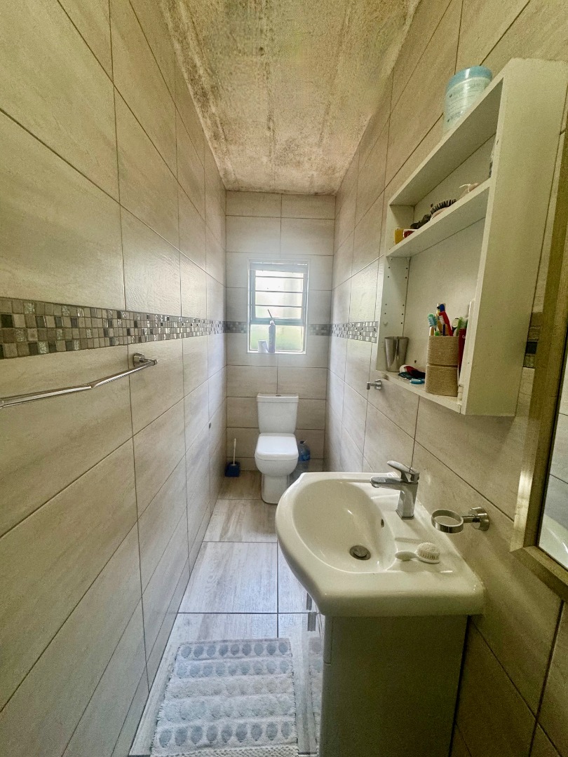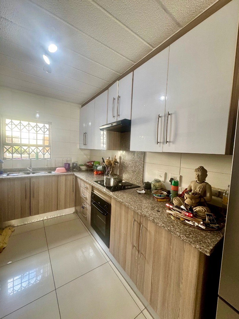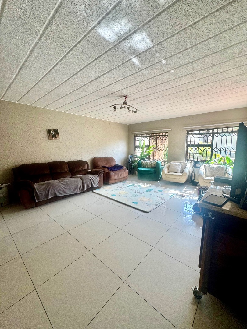 The interior features an intelligently designed open-plan layout, encompassing a spacious lounge, dining room, and family TV room, facilitating versatile living. A modern kitchen, appointed with contemporary cabinetry, integrated oven and stovetop, and ample storage, complements the tiled flooring. Three well-proportioned bedrooms, each with laminate wood flooring and natural light, are served by two bathrooms (main en-suite), both fully tiled with modern fixtures.