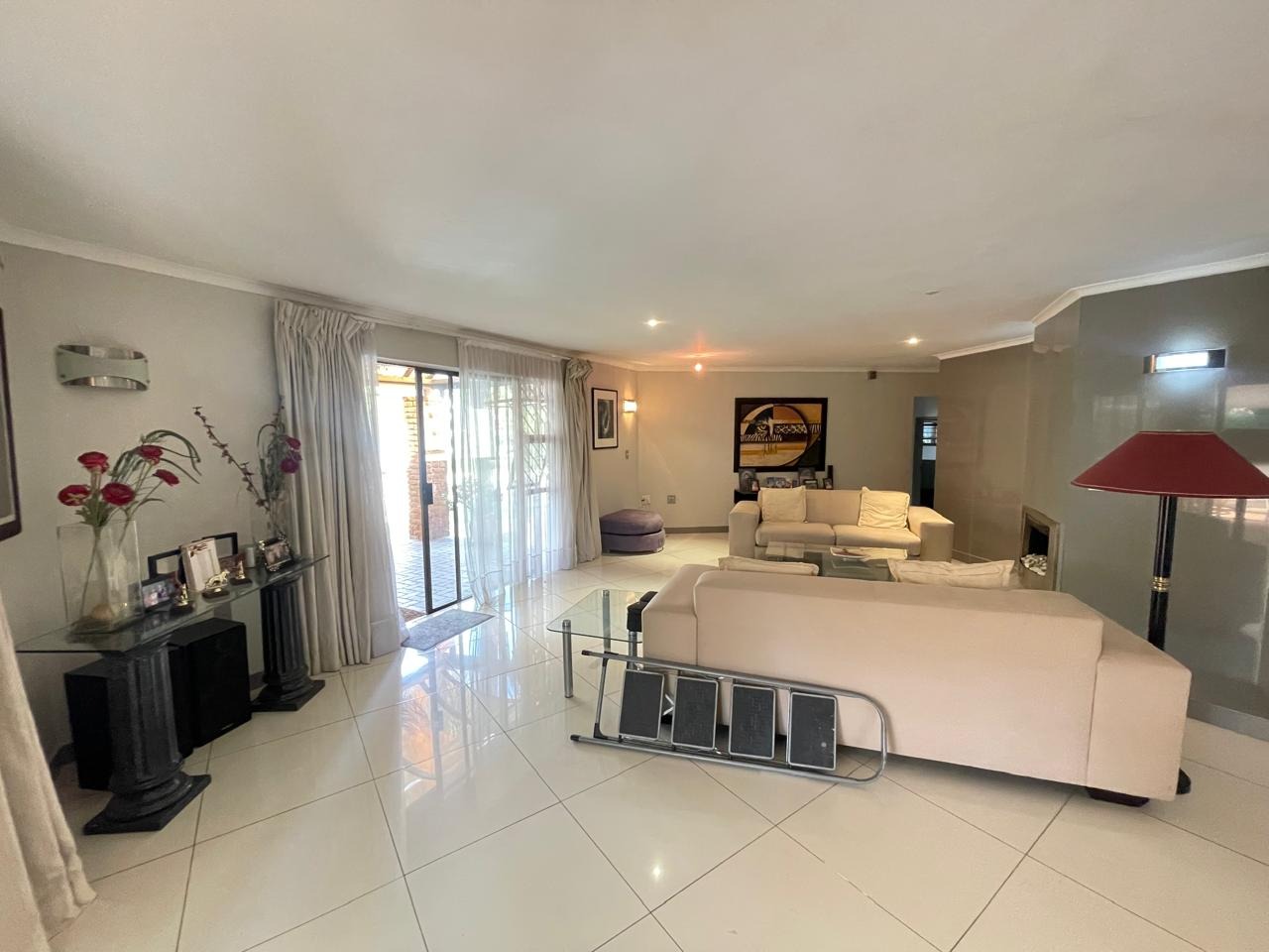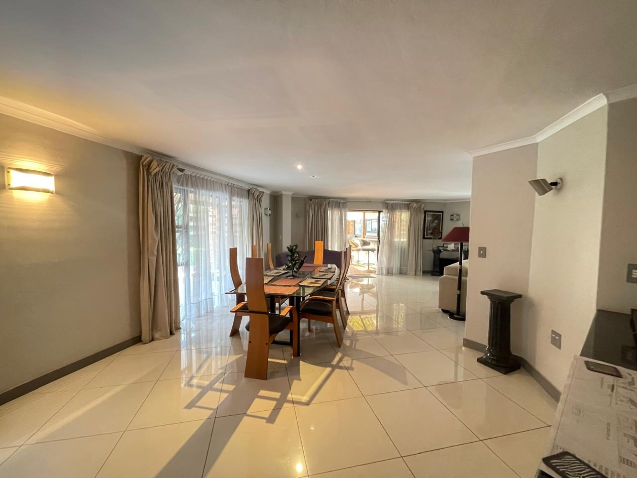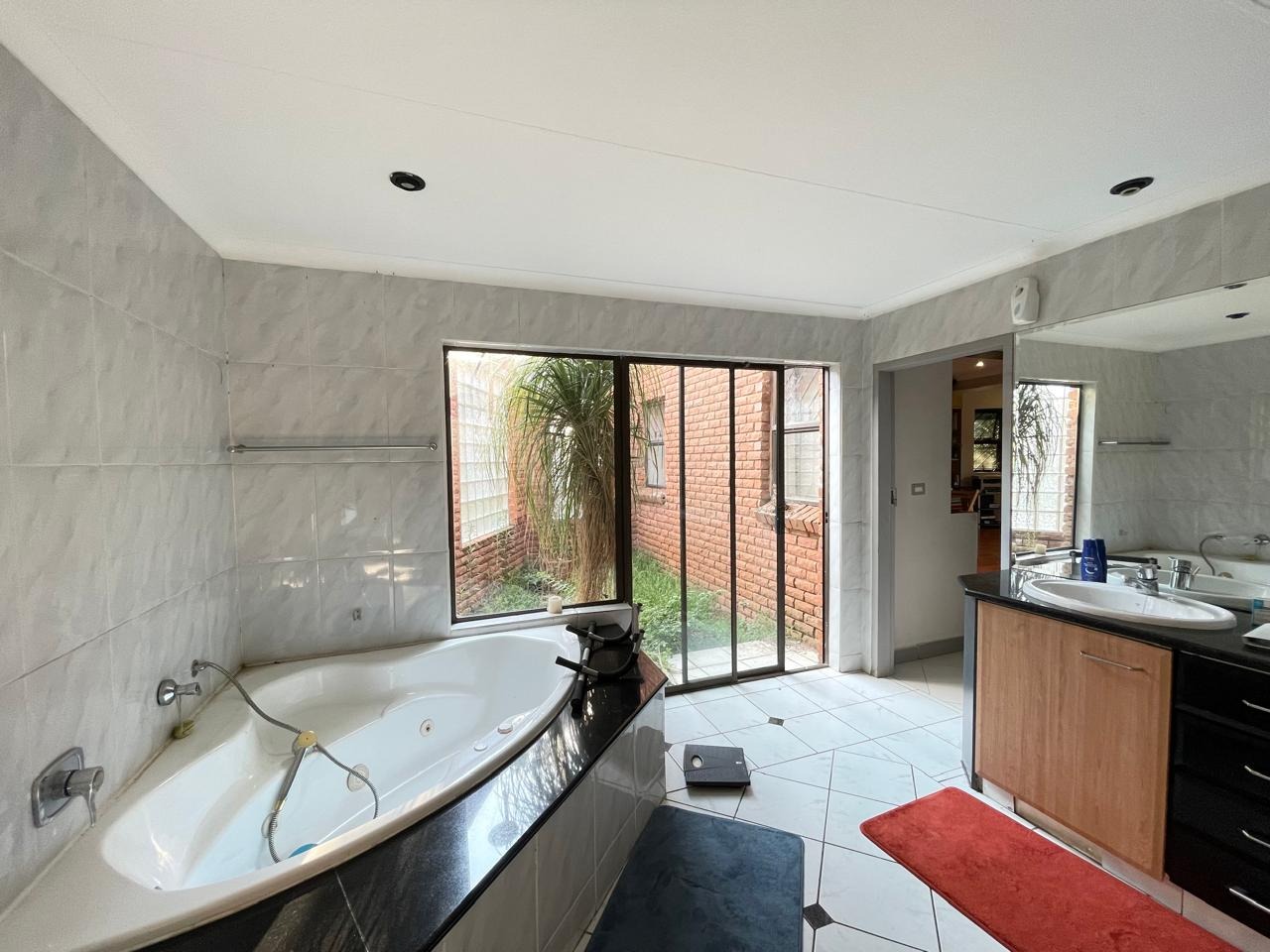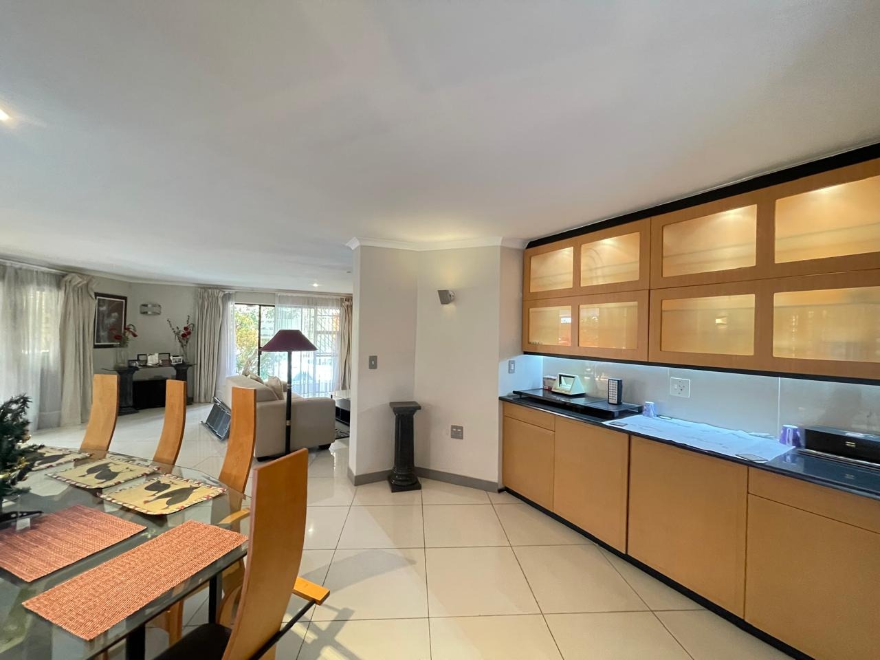 Set in a highly secure and peaceful boomed-off neighborhood, this exceptional home offers an abundance of space, comfort, and elegant indoor-outdoor living. Upon entering, you are welcomed by a spacious open-plan lounge, dining, and reception area that forms the heart of the home. The east wing features three generously sized bedrooms with ample built-in cupboards, serviced by two well-appointed bathrooms. A large, well-equipped kitchen with extensive cupboard space and a separate scullery completes this wing, ideal for comfortable family living.