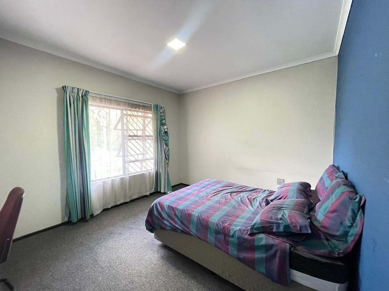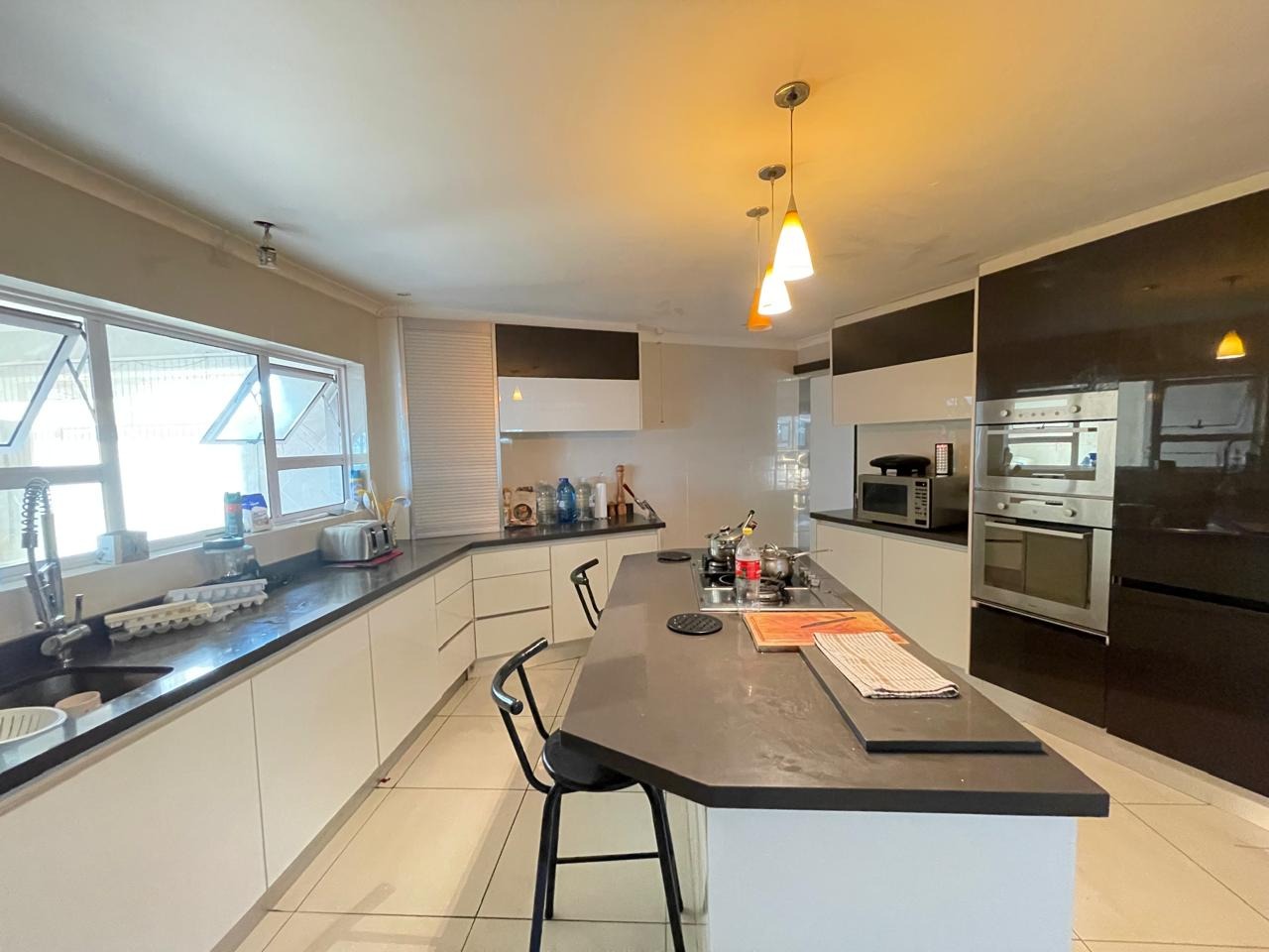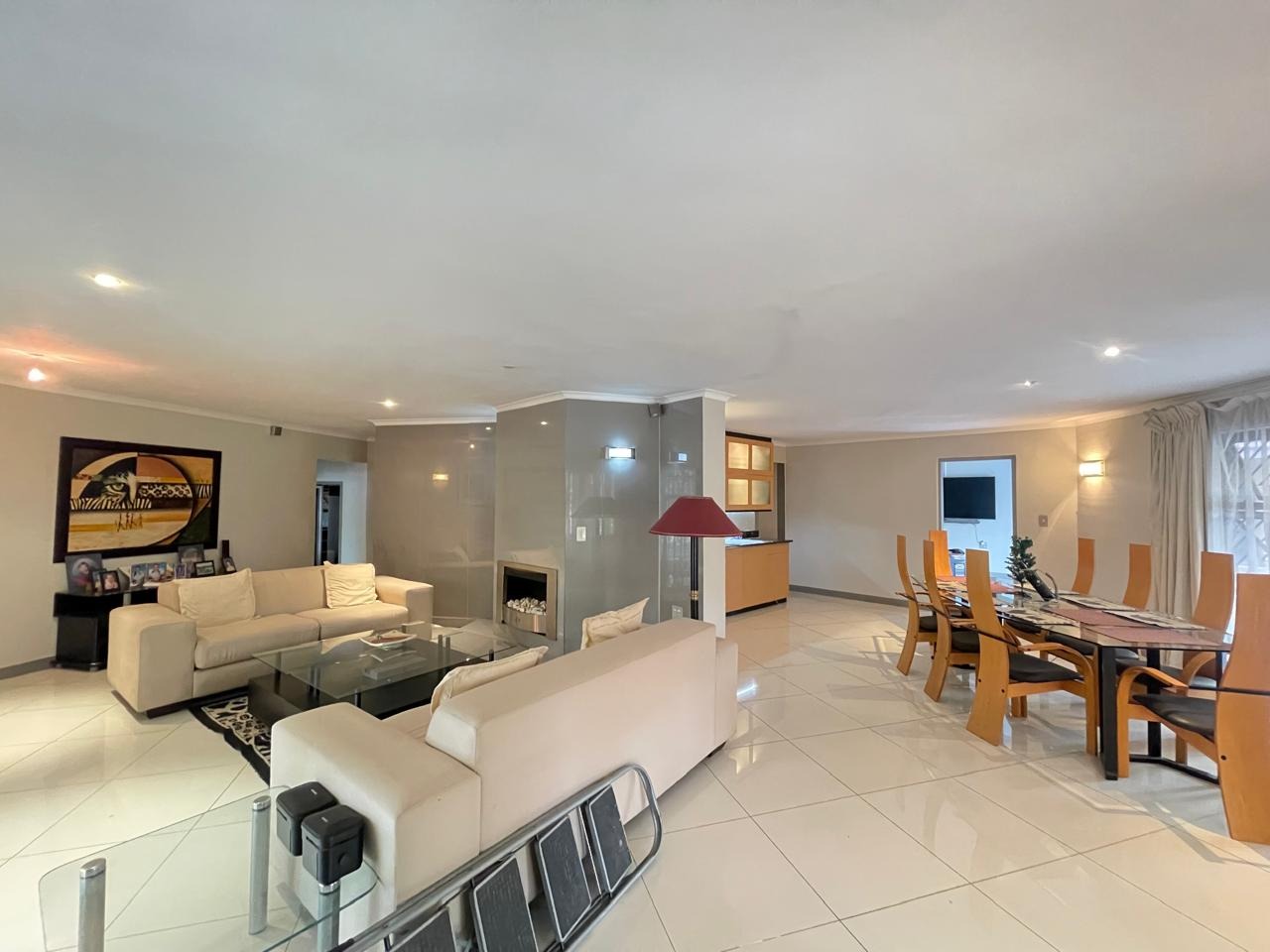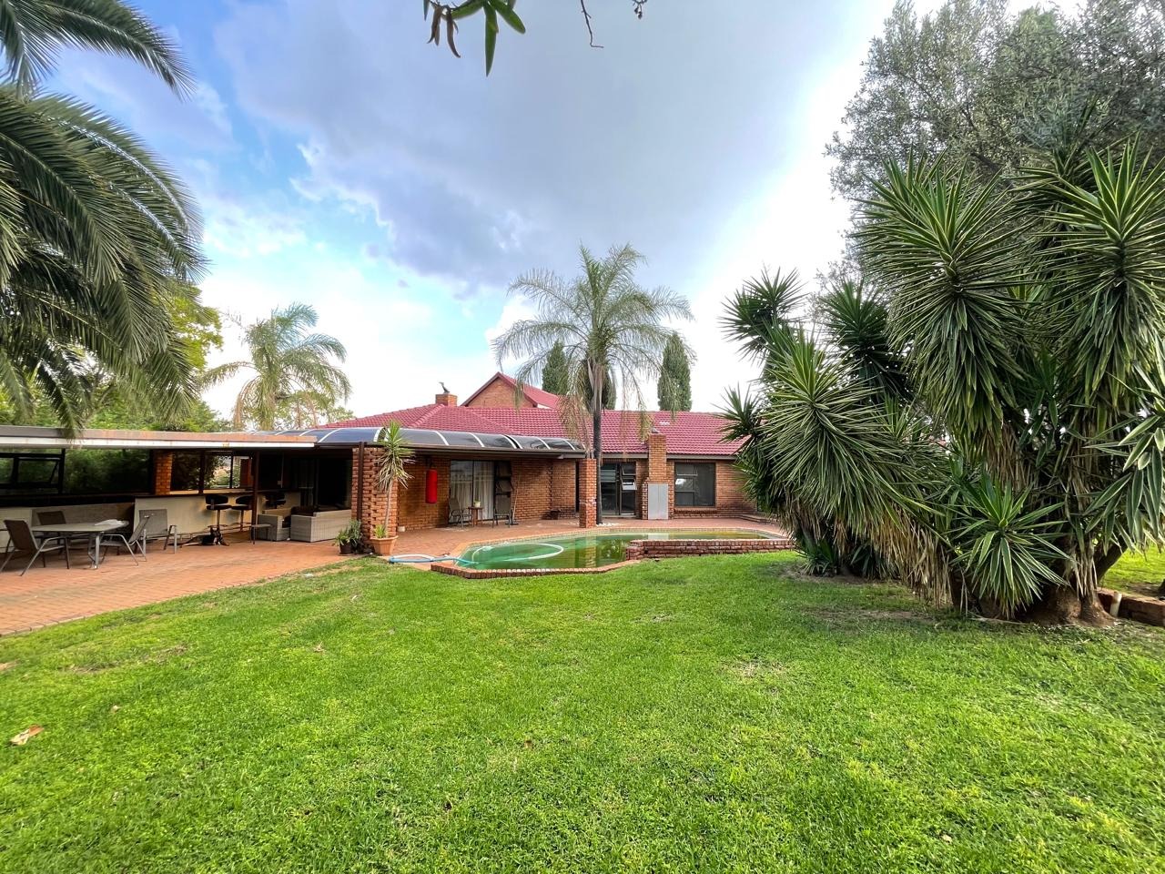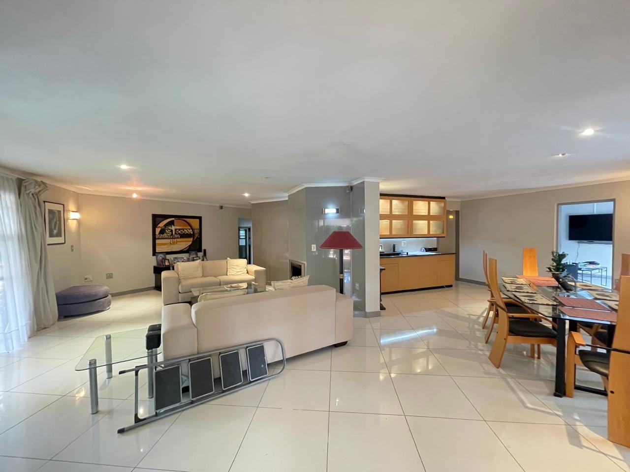 Set in a highly secure and peaceful boomed-off neighborhood, this exceptional home offers an abundance of space, comfort, and elegant indoor-outdoor living. Upon entering, you are welcomed by a spacious open-plan lounge, dining, and reception area that forms the heart of the home. The east wing features three generously sized bedrooms with ample built-in cupboards, serviced by two well-appointed bathrooms. A large, well-equipped kitchen with extensive cupboard space and a separate scullery completes this wing, ideal for comfortable family living.