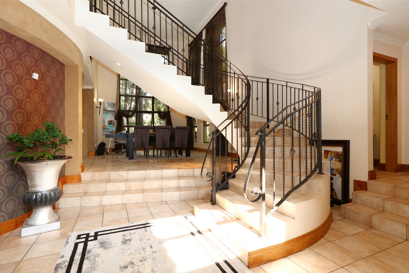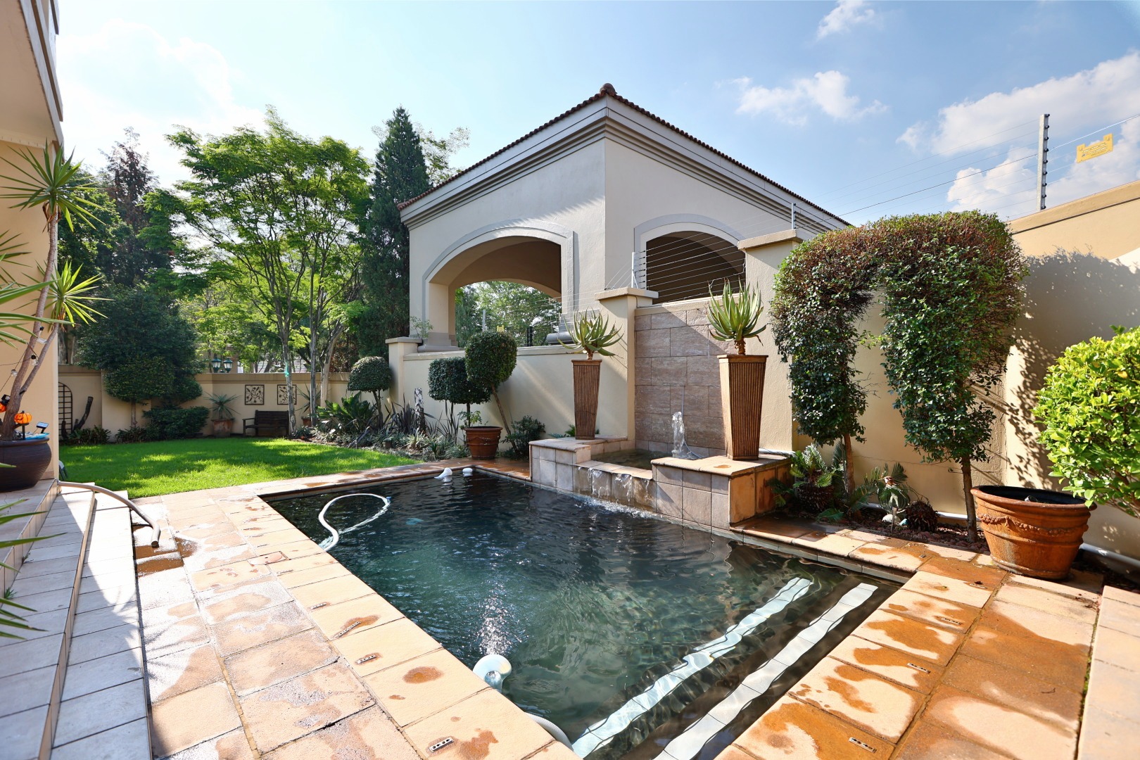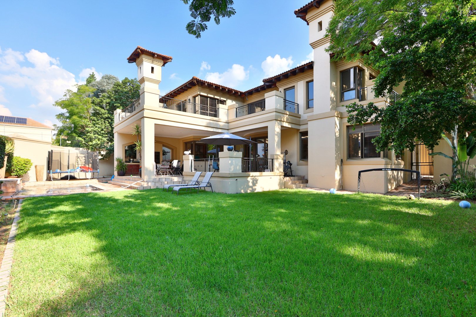 At the heart of the home, a beautiful reception area leads effortlessly onto a covered entertainment space, complete with built-in braai facilities, perfect for hosting unforgettable gatherings. This area overlooks a sparkling pool and meticulously landscaped, pet-friendly gardens, giving your family, including your pets, the space and freedom to truly feel at home.