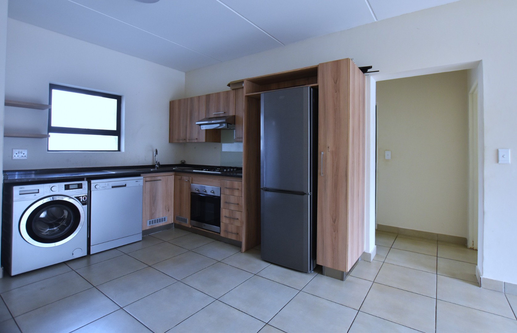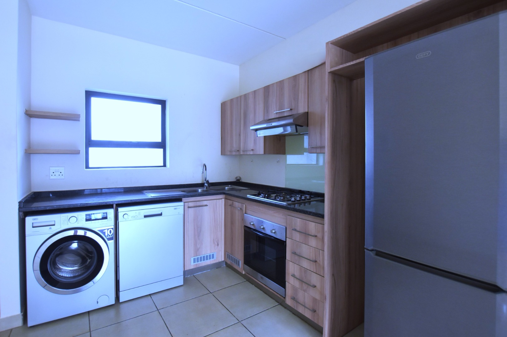 The modern kitchen, consist plenty cupboard space, double sink, granite counter tops, space for a refrigerator, 2 under countertop appliances, stove with Gas hob and extractor fan.