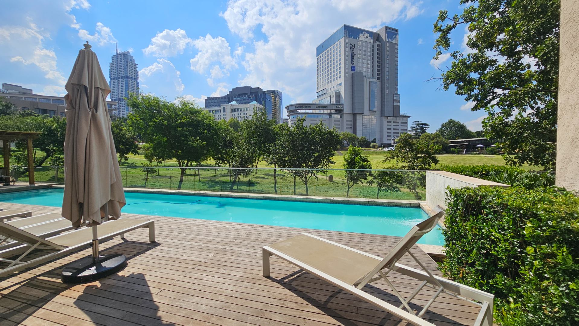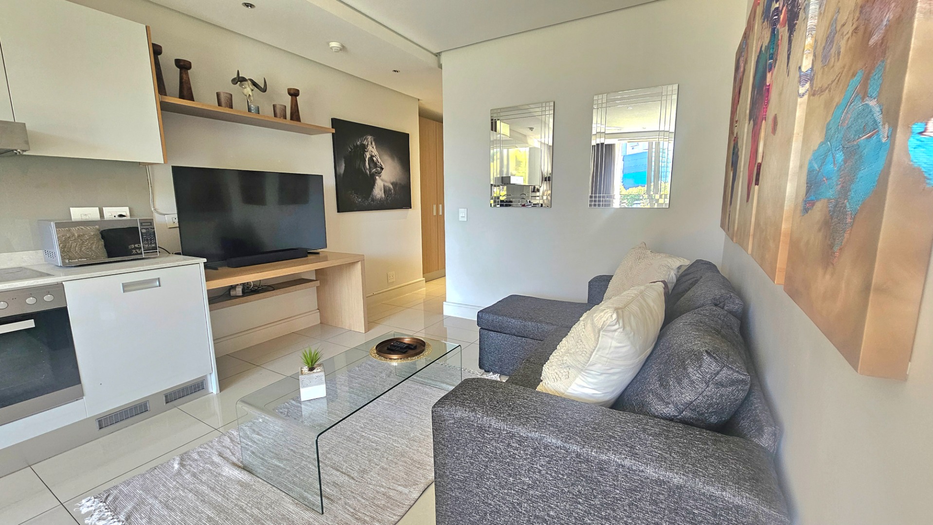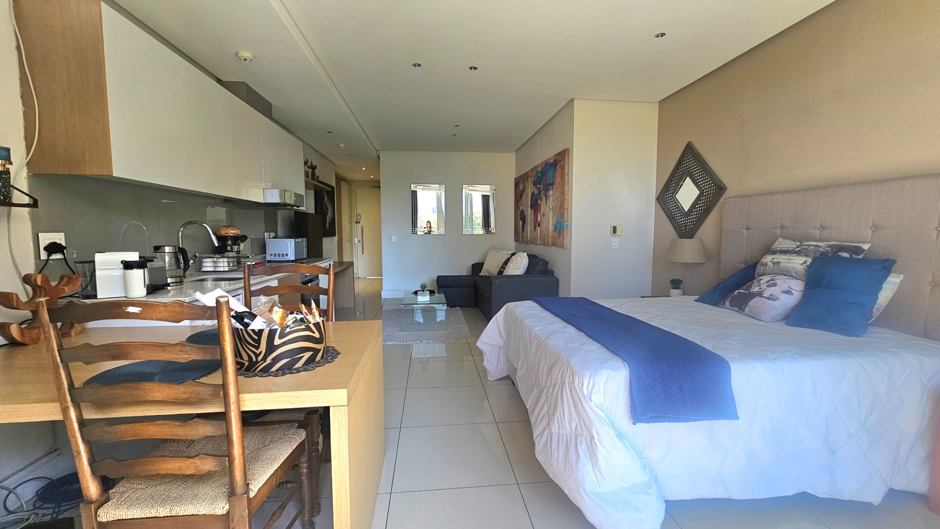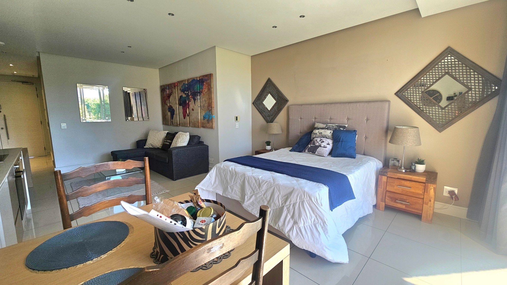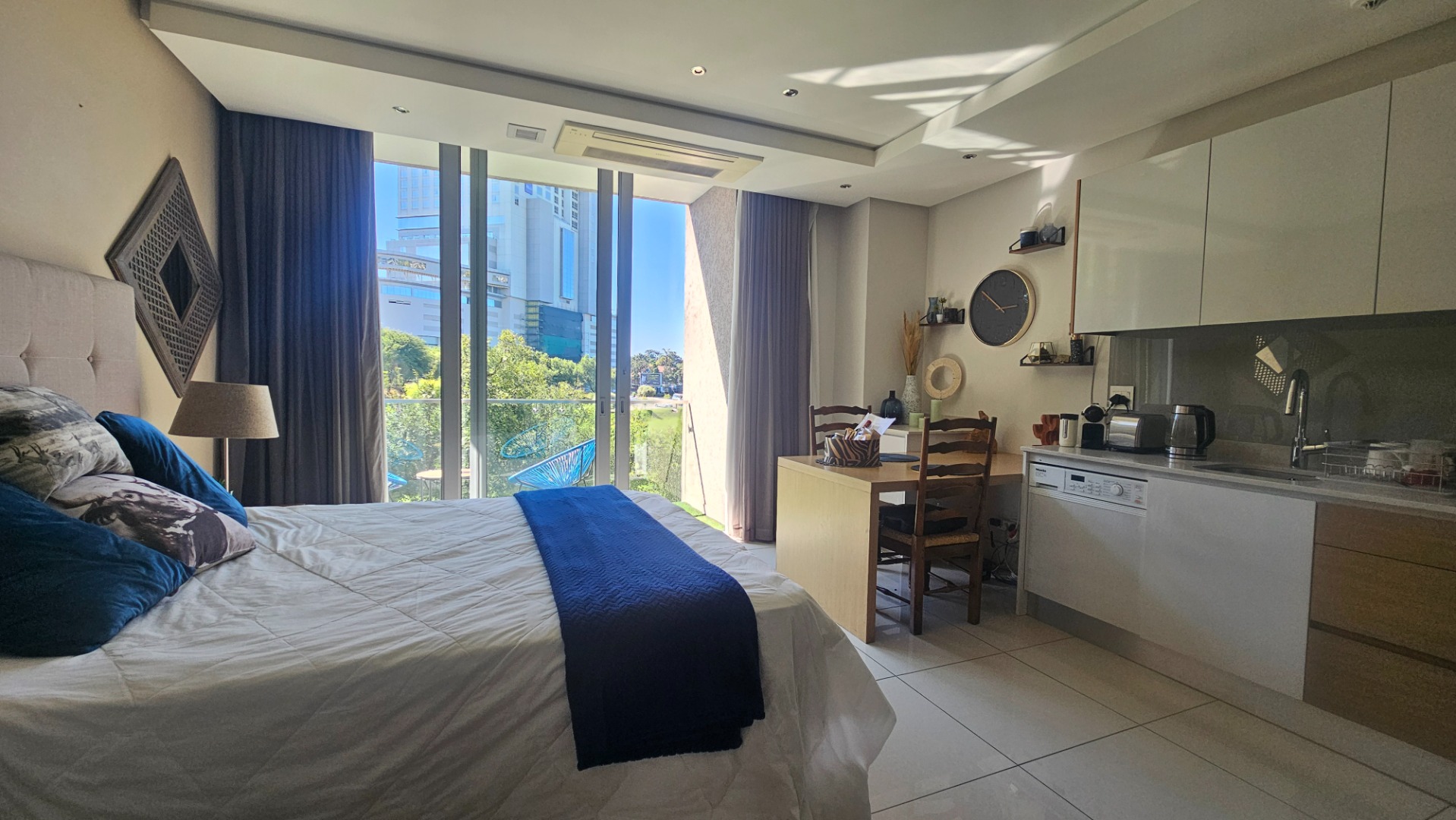 Discover an exquisite urban sanctuary within the prestigious Sandton Central, offering a sophisticated lifestyle for the discerning individual. This meticulously designed studio apartment epitomises modern luxury, boasting an open-plan layout that seamlessly integrates living, dining, and sleeping areas. Upon entry, be greeted by sleek tiled flooring and an abundance of natural light streaming through expansive sliding glass doors, leading to a private balcony that presents serene green views of Mushroom Park.