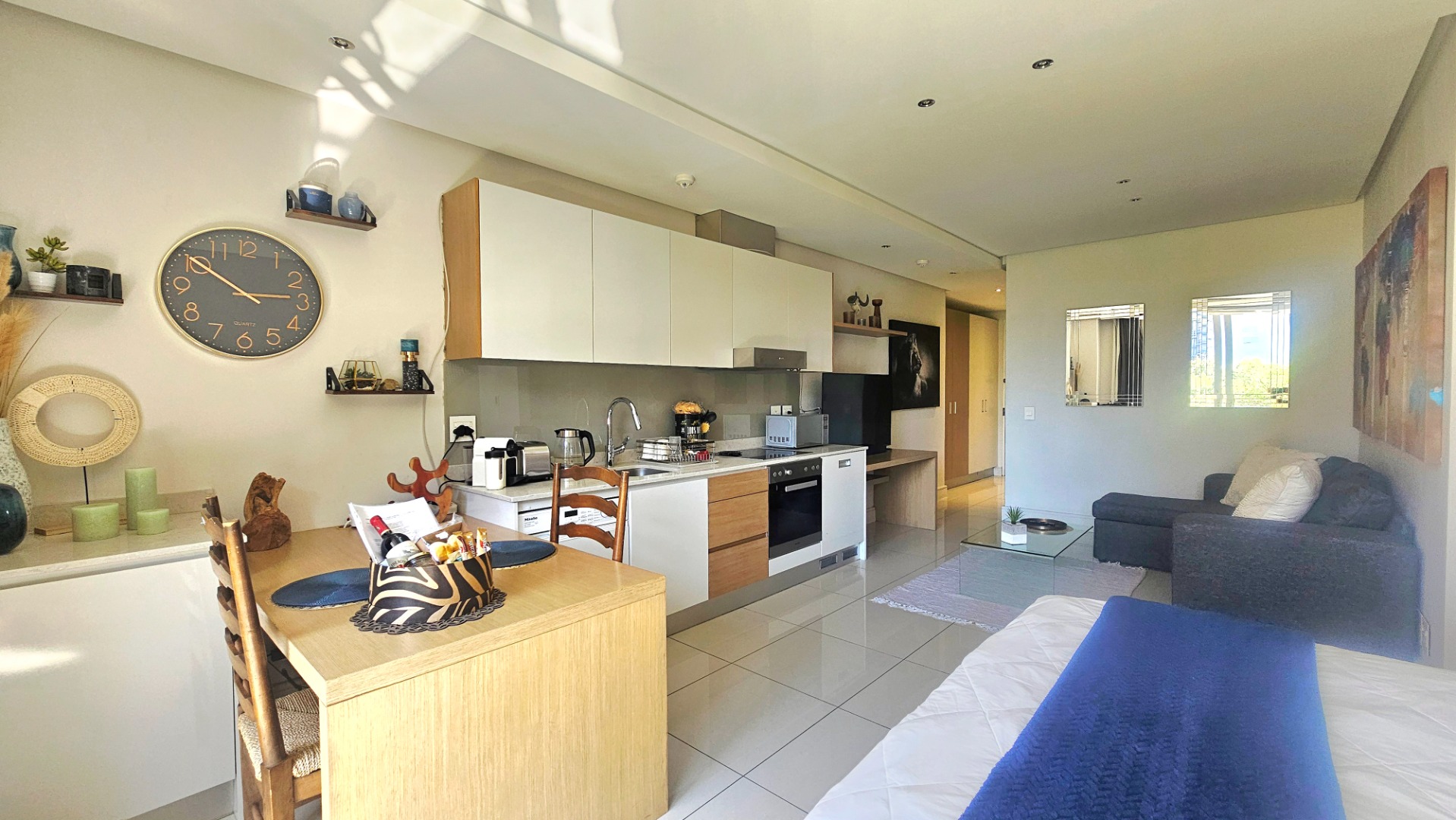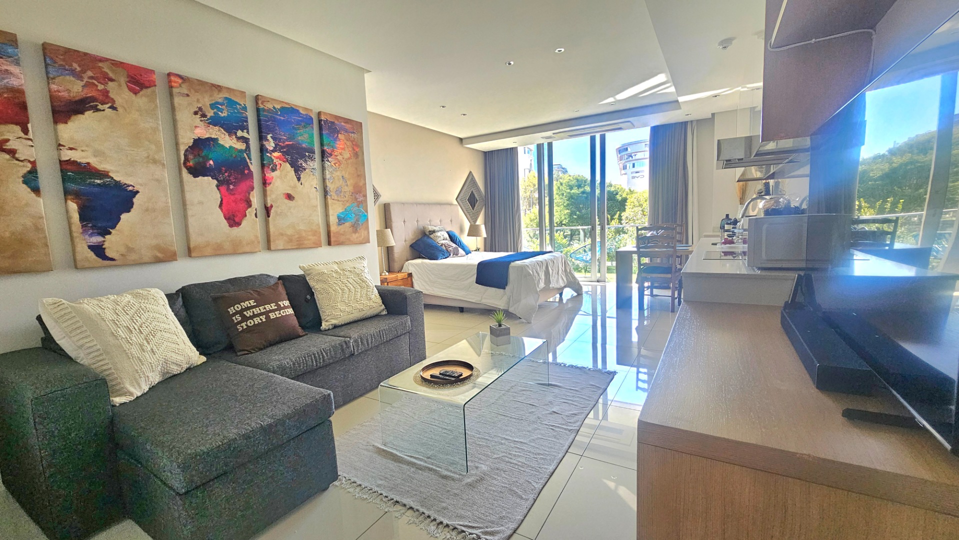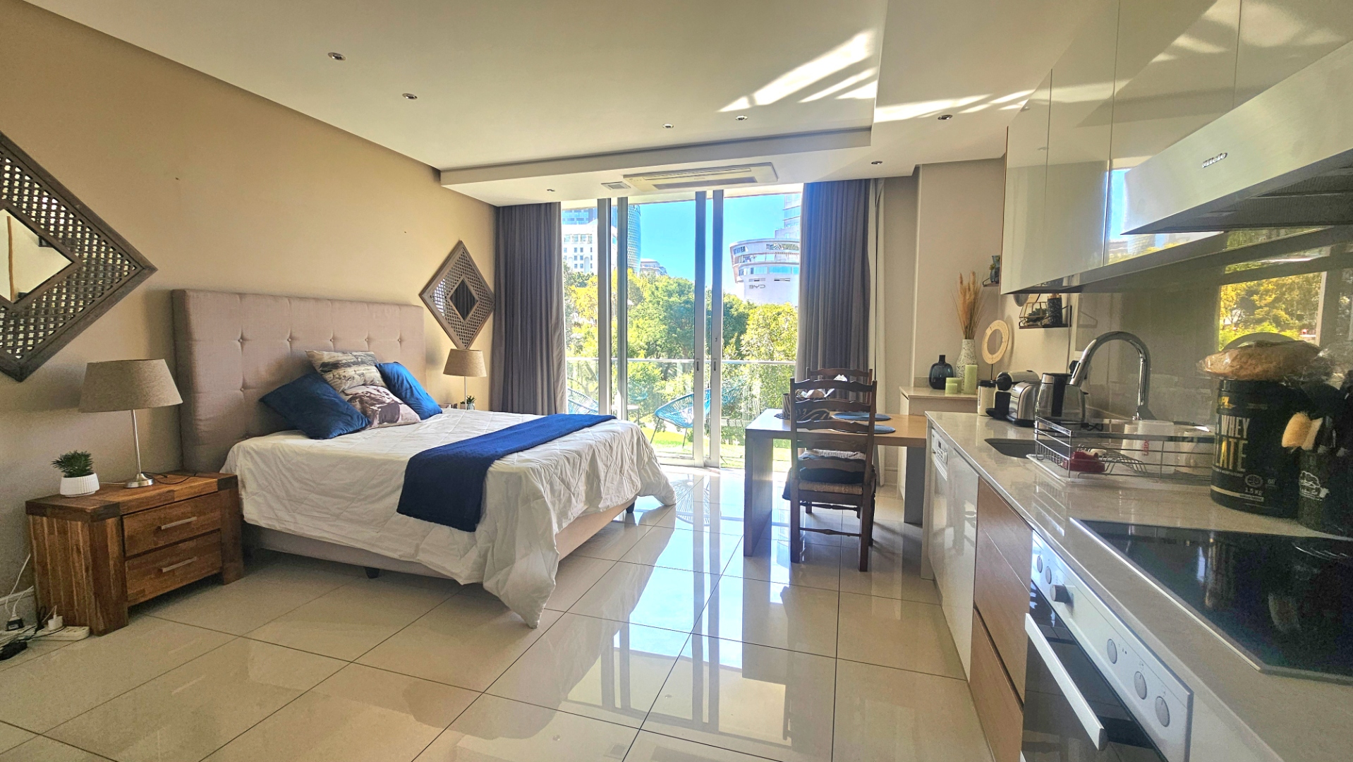 Discover an exquisite urban sanctuary within the prestigious Sandton Central, offering a sophisticated lifestyle for the discerning individual. This meticulously designed studio apartment epitomises modern luxury, boasting an open-plan layout that seamlessly integrates living, dining, and sleeping areas. Upon entry, be greeted by sleek tiled flooring and an abundance of natural light streaming through expansive sliding glass doors, leading to a private balcony that presents serene green views of Mushroom Park.
