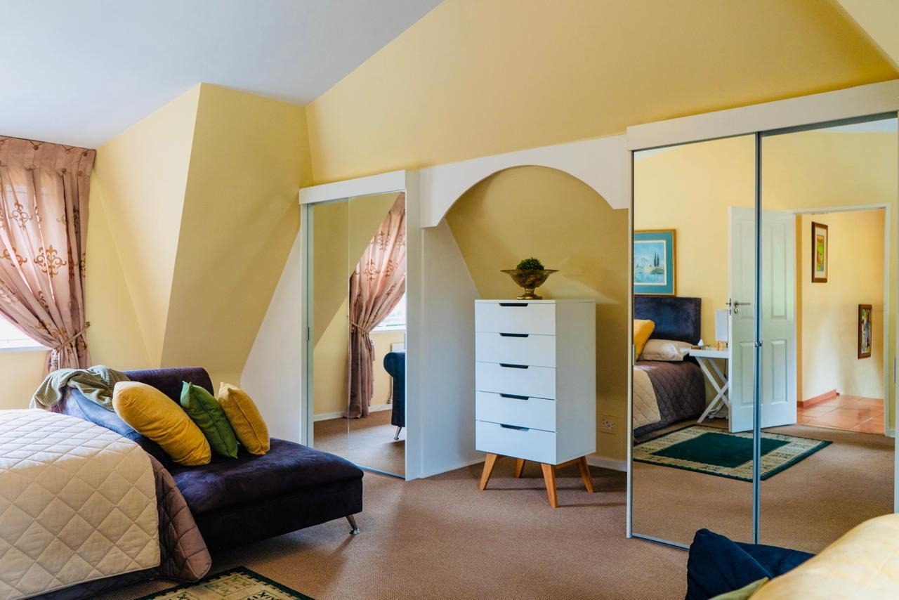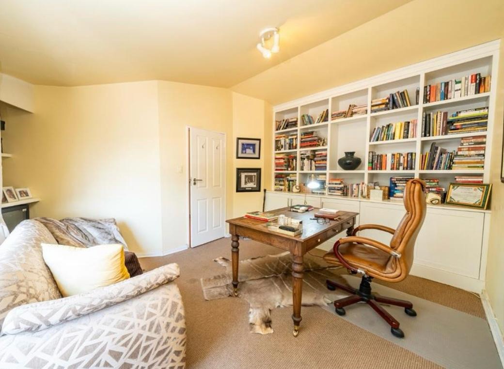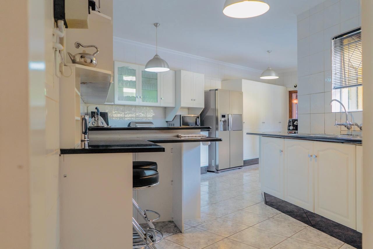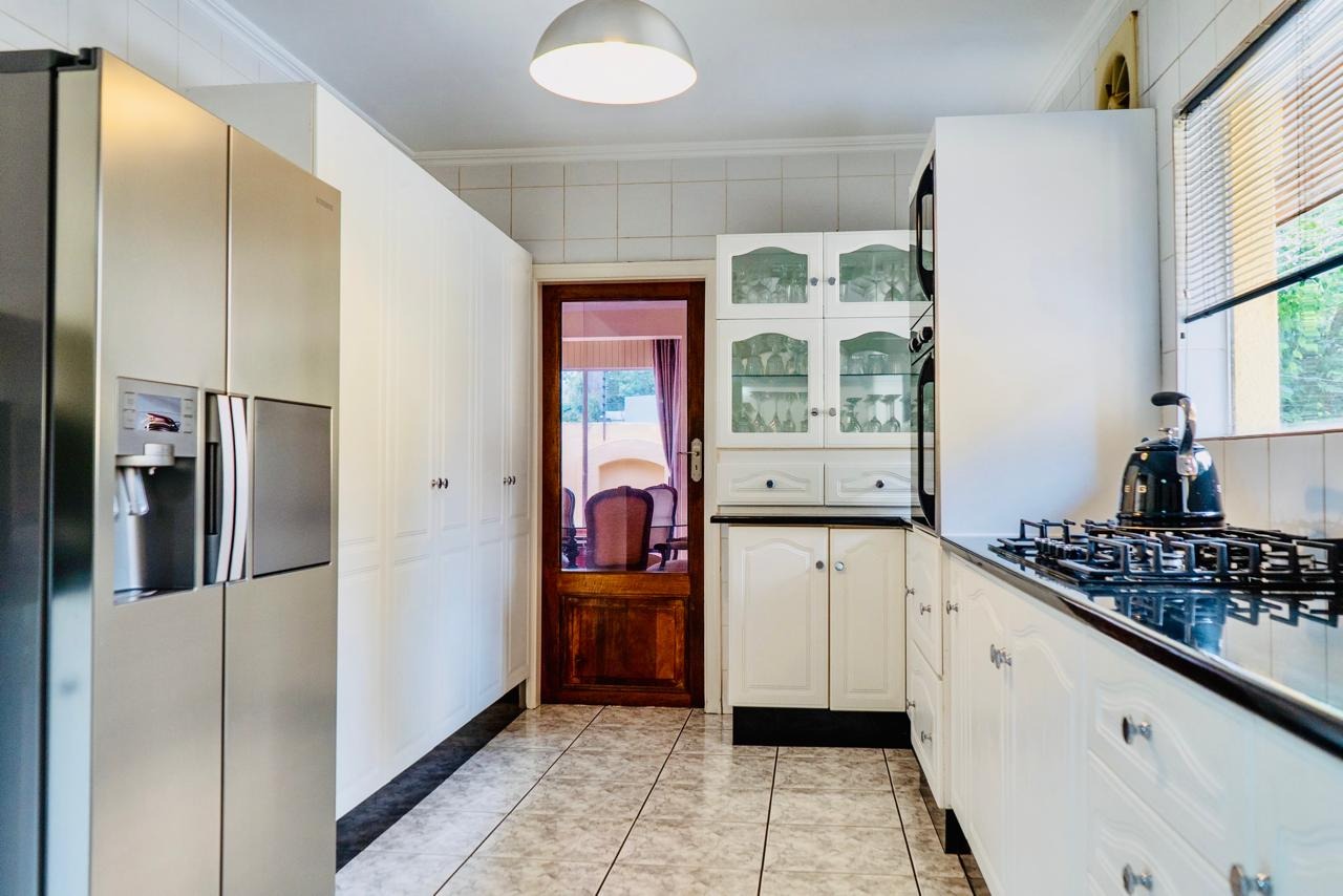 Step inside to an expansive entrance hall that sets the tone for the home's elegant flow. The interior boasts two spacious lounges and a dedicated dining room, each bathed in natural light from large windows, creating an inviting ambiance for both intimate gatherings and grand entertaining. Architectural details, including decorative ceiling molding and an ornate fireplace, add a touch of timeless charm. A dedicated study provides a quiet sanctuary for work or contemplation. The heart of the home, a well-appointed kitchen, features extensive white cabinetry, contrasting dark countertops, a functional breakfast bar, and modern stainless steel appliances, including a gas hob, catering to culinary enthusiasts. A unique, custom-built wine cellar, elegantly integrated beneath the staircase, offers a connoisseur's delight.