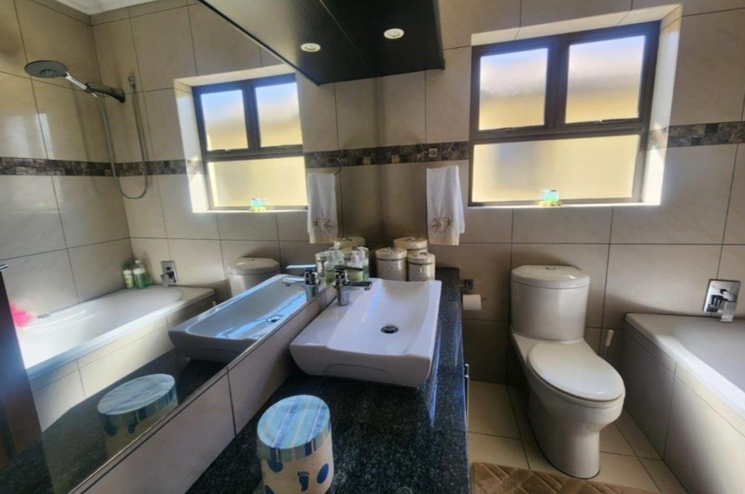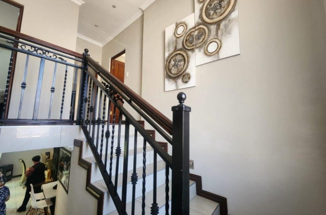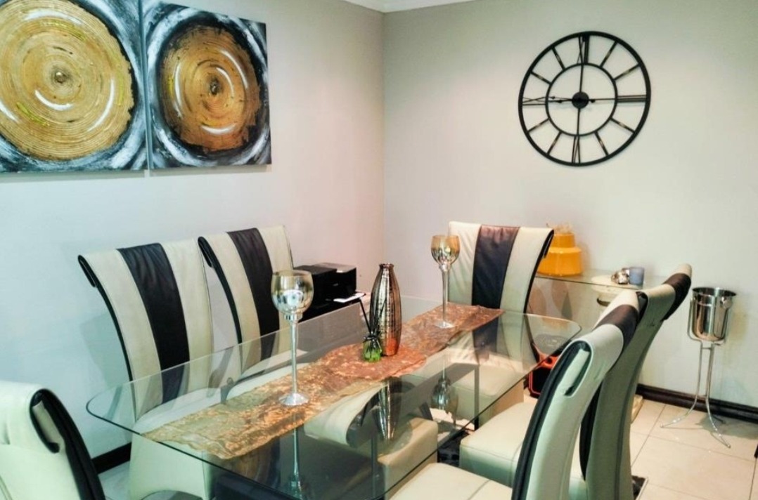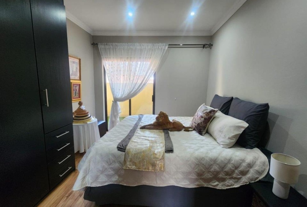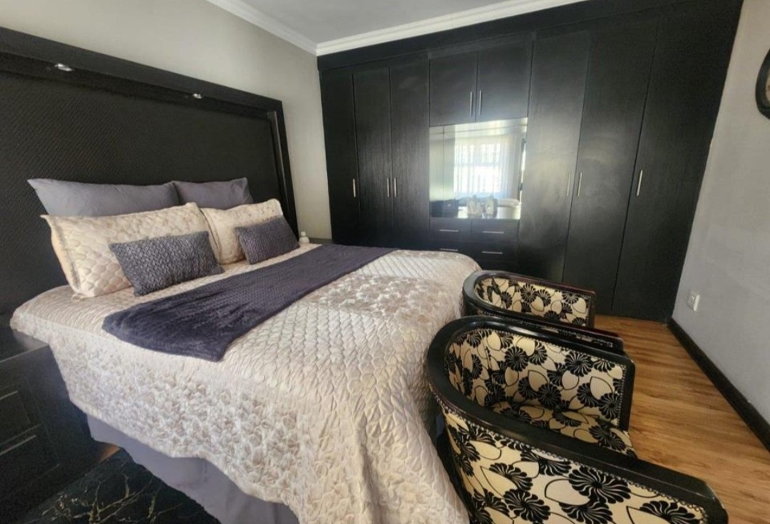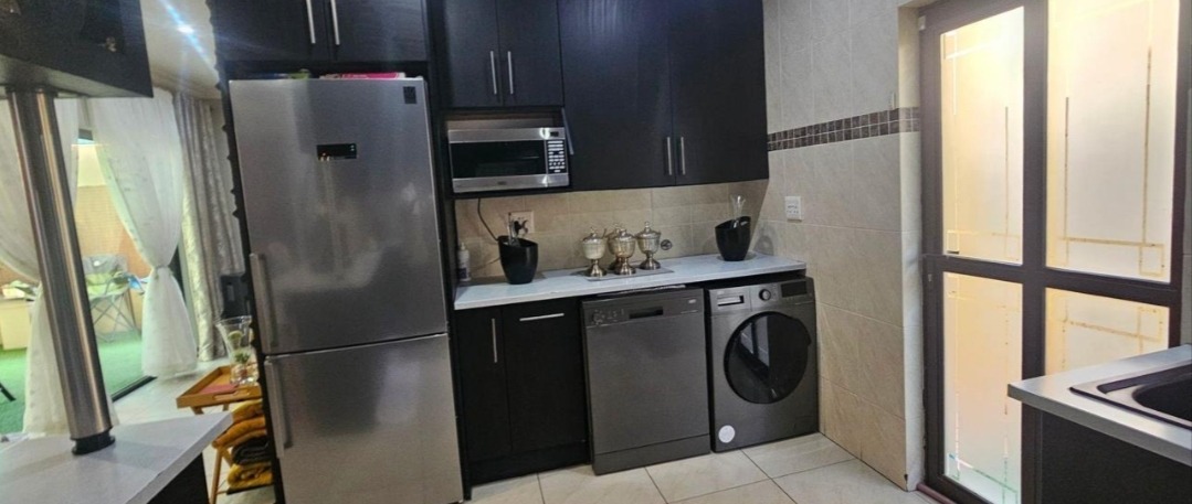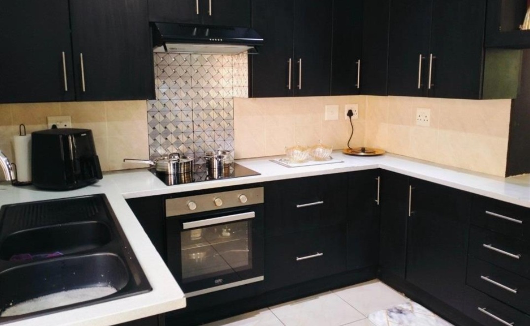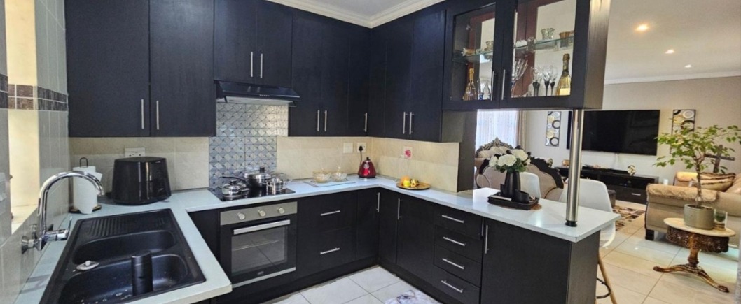 Come check out this modern, two-story home in Selcourt! It boasts a clean, light-colored exterior with dark-framed windows, letting in loads of natural light. The paved front area and covered entrance offer a neat, low-maintenance vibe, while tropical palm trees add lovely curb appeal. Step inside to a spacious living area with modern tiled floors and big windows, perfect for relaxing. The bright dining room is great for family meals. The kitchen is super sleek with black cabinetry, white countertops, and integrated appliances. A stylish tiled backsplash and handy breakfast bar make it a real hub for open-plan living. Upstairs, discover three comfy bedrooms, including one with its own ensuite bathroom. The main bedroom features a fantastic built-in wardrobe system with a vanity area, offering ample storage. All bathrooms are neatly tiled, with modern vanities and a bathtub with a shower. Outside, a fantastic covered patio area awaits, perfect for entertaining. It includes a dedicated dining space, a cool hanging chair, and a built-in braai for those lekker South African get-togethers. Artificial turf keeps things low-maintenance, and with two parking spaces, convenience is key. This lovely home is nestled in Selcourt, a friendly Springs suburb. It's a great spot for comfortable living, offering a nice community feel. Key Features: * 3 Bedrooms, 3 Bathrooms (1 ensuite) * Modern, open-plan kitchen with black cabinetry * Spacious living and dining areas * Covered entertainment patio with built-in braai * Modern tiled flooring throughout * Large built-in wardrobes * Two parking spaces * Stylish staircase