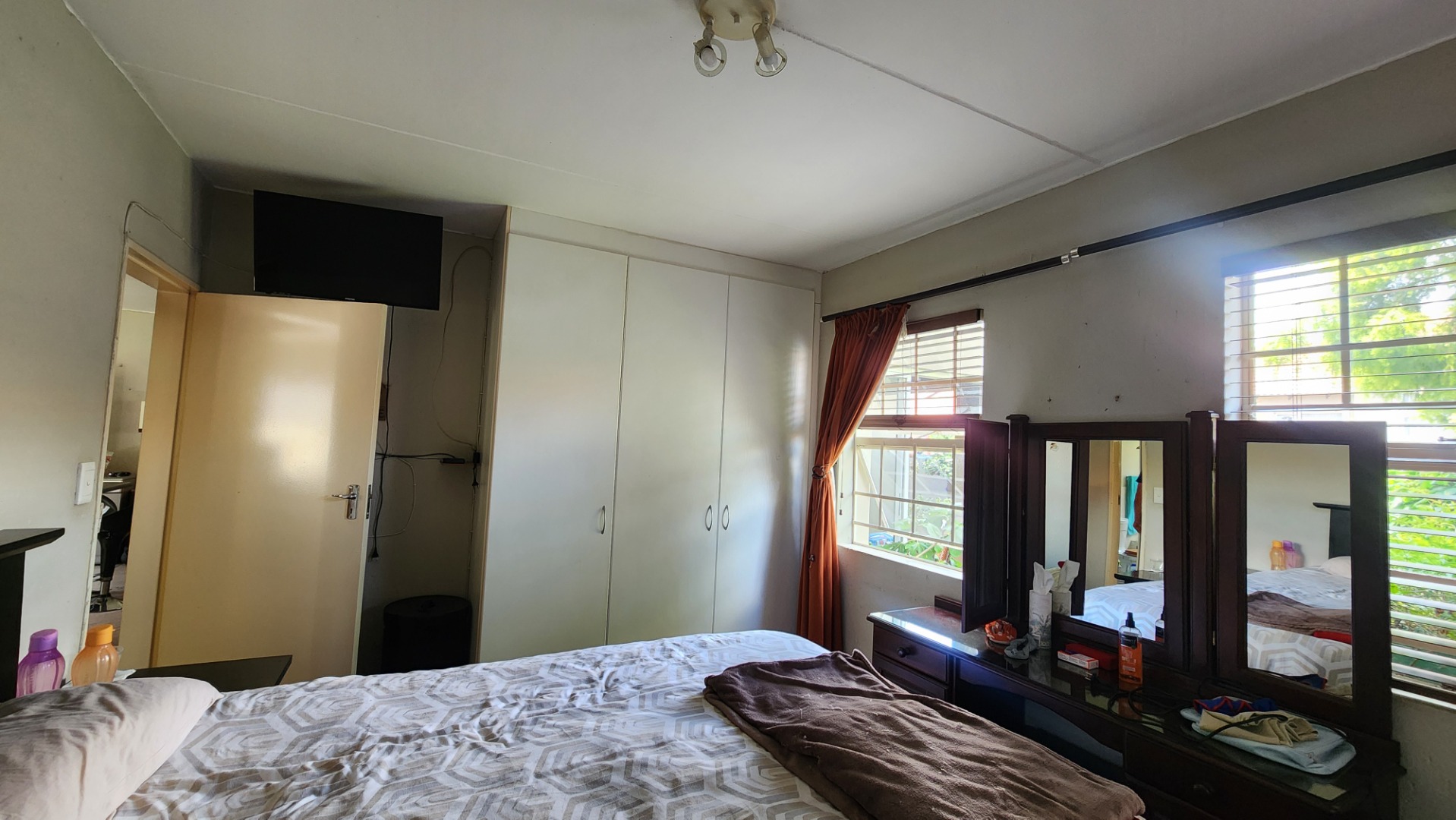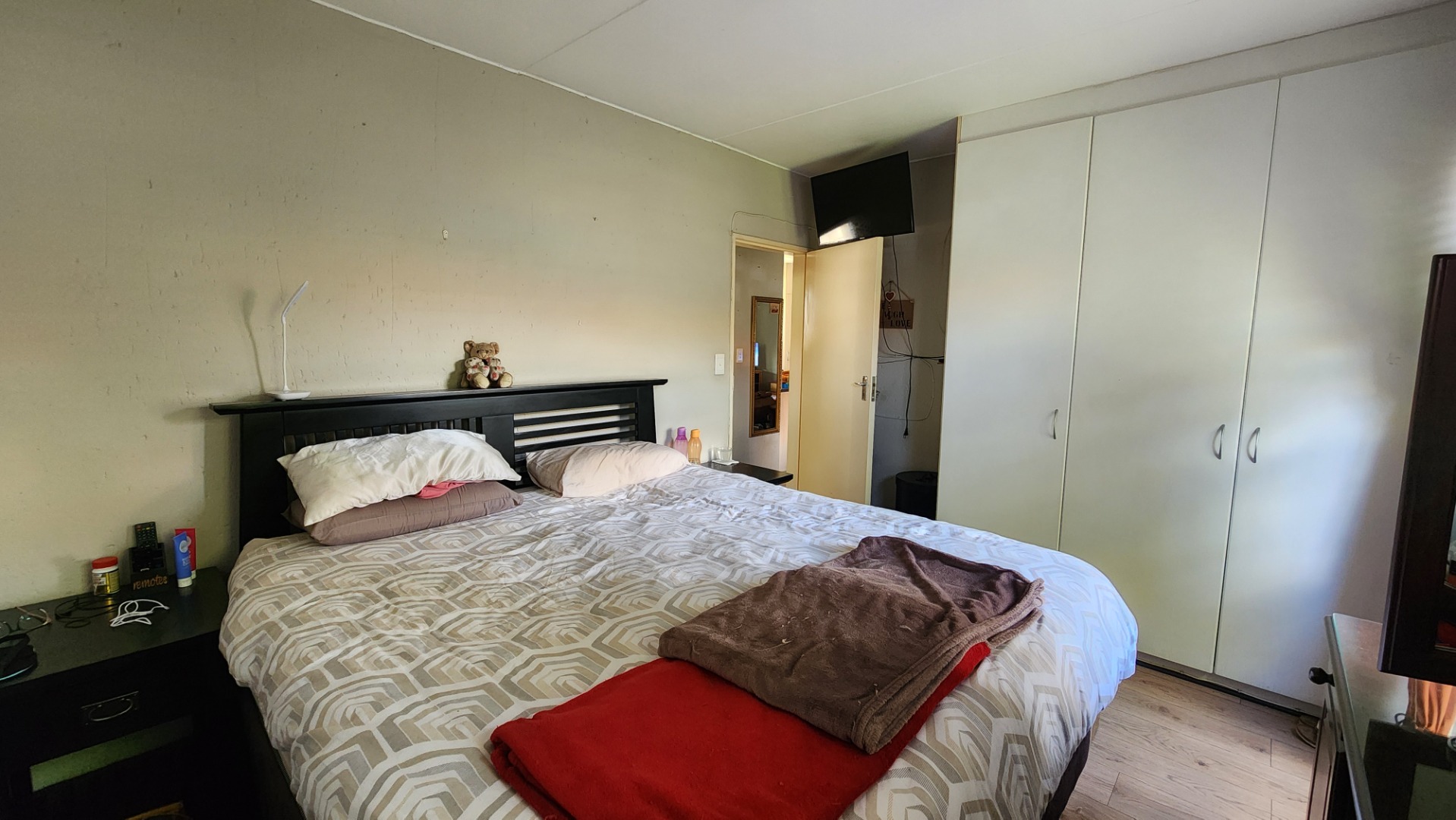 Main bedroom with laminated flooring, built-in cupboards, and space for a king-size bed