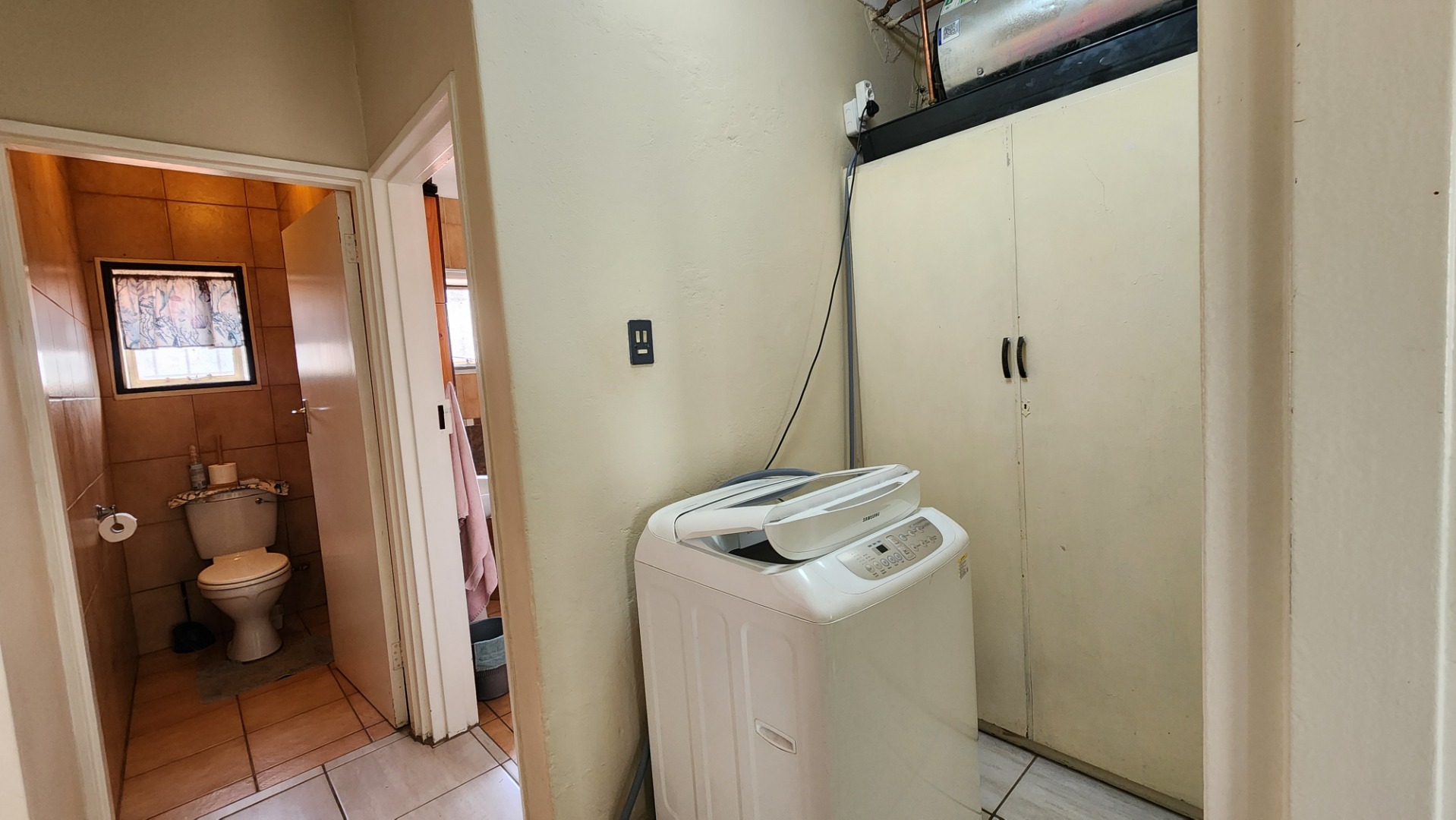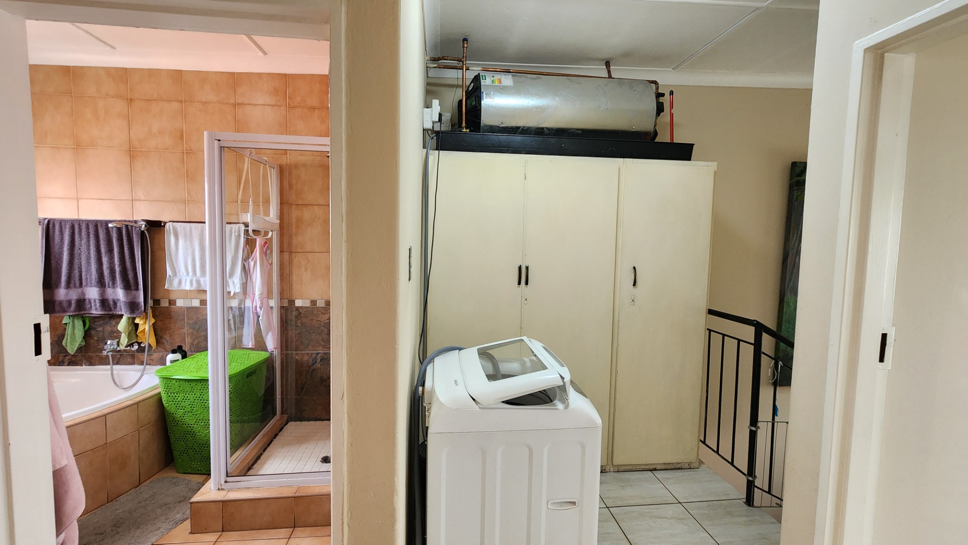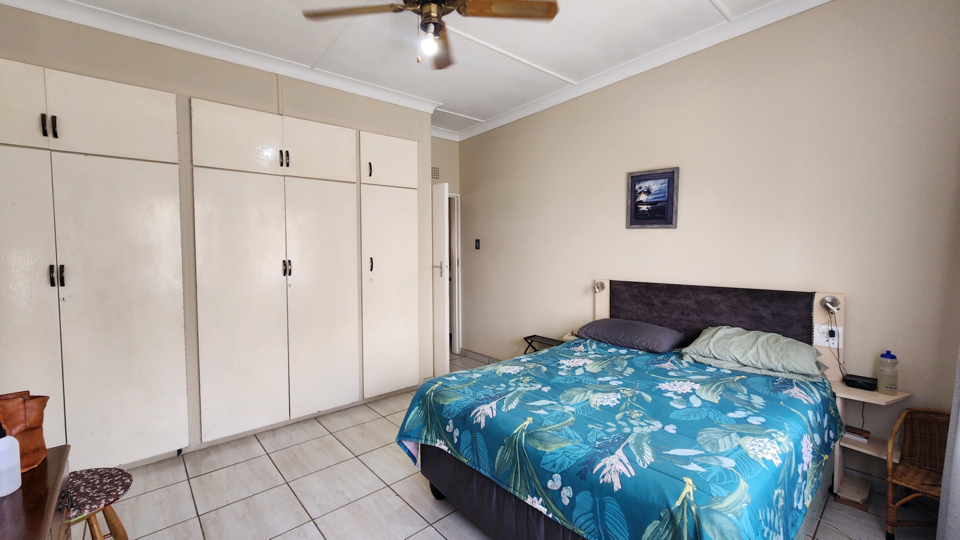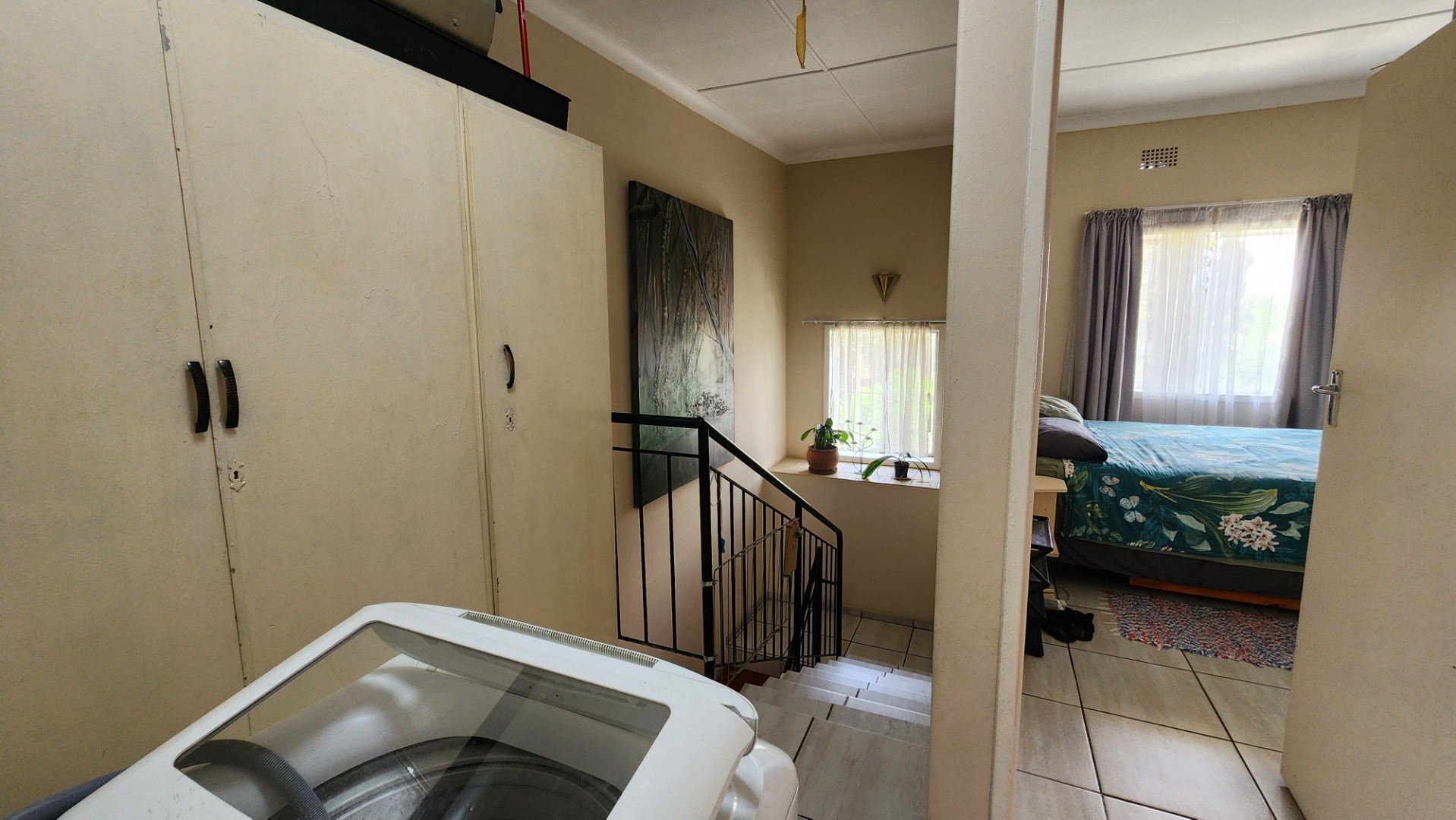 Two bedrooms with built-in cupboards, tiled floors, ceiling fan, and large windows. The second bedroom is suitable for double bunk beds. There is a separate toilet and a full bathroom with bath and shower (no toilet). A linen cupboard is located on the landing, and the washing machine is conveniently situated upstairs.