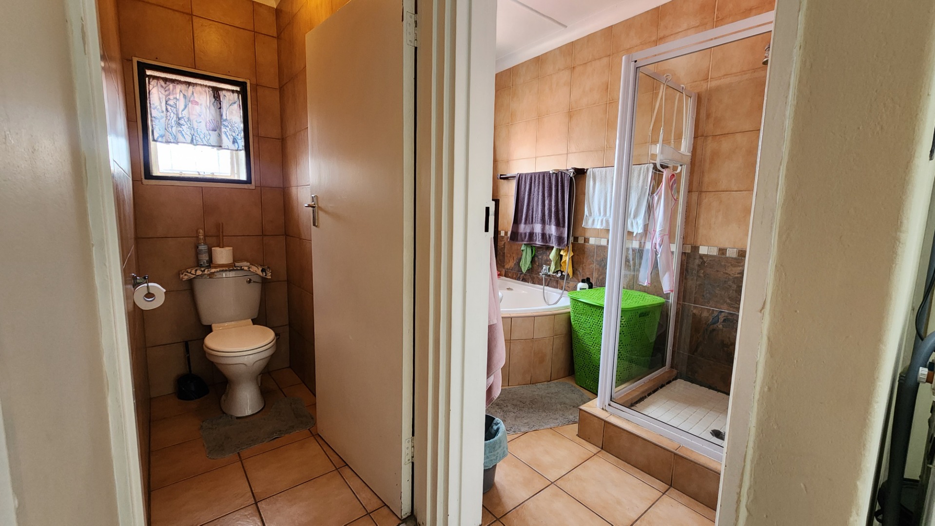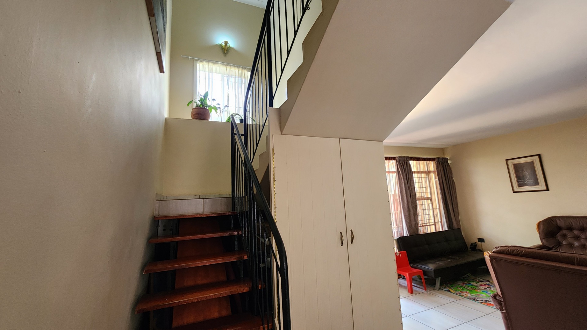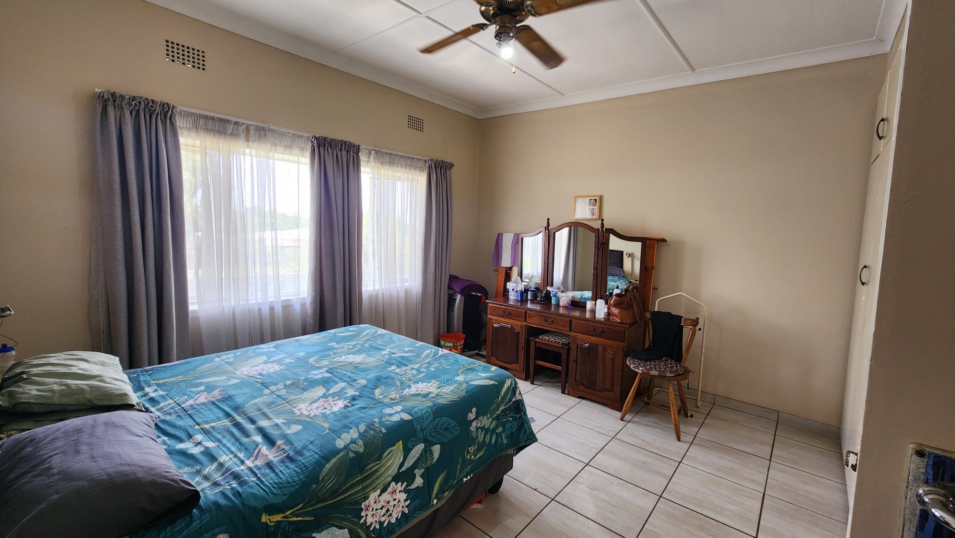 Two bedrooms with built-in cupboards, tiled floors, ceiling fan, and large windows. The second bedroom is suitable for double bunk beds. There is a separate toilet and a full bathroom with bath and shower (no toilet). A linen cupboard is located on the landing, and the washing machine is conveniently situated upstairs.