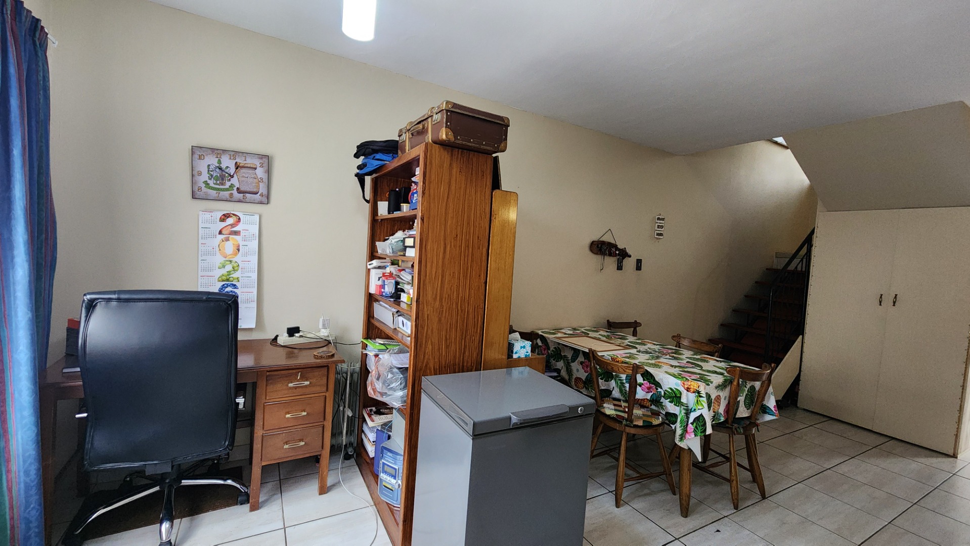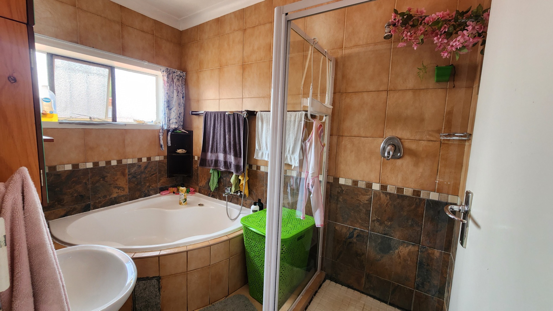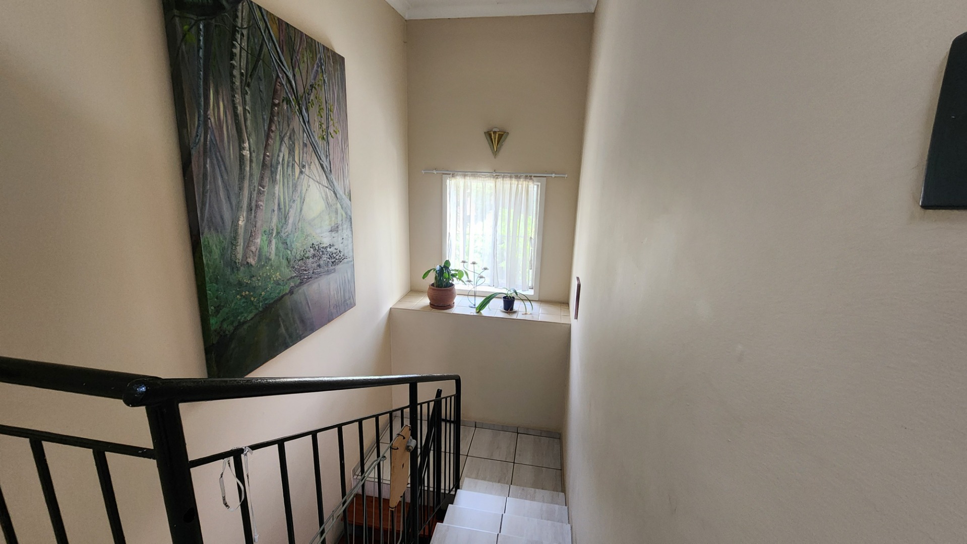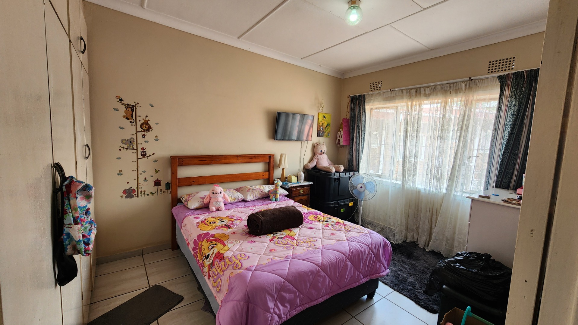 Two bedrooms with built-in cupboards, tiled floors, ceiling fan, and large windows. The second bedroom is suitable for double bunk beds. There is a separate toilet and a full bathroom with bath and shower (no toilet). A linen cupboard is located on the landing, and the washing machine is conveniently situated upstairs.