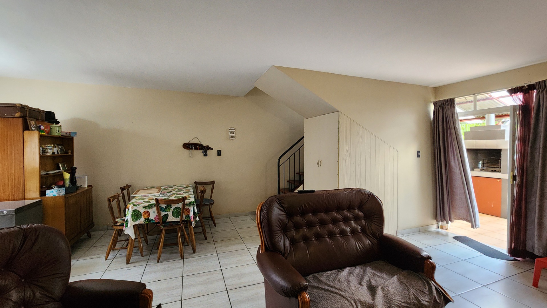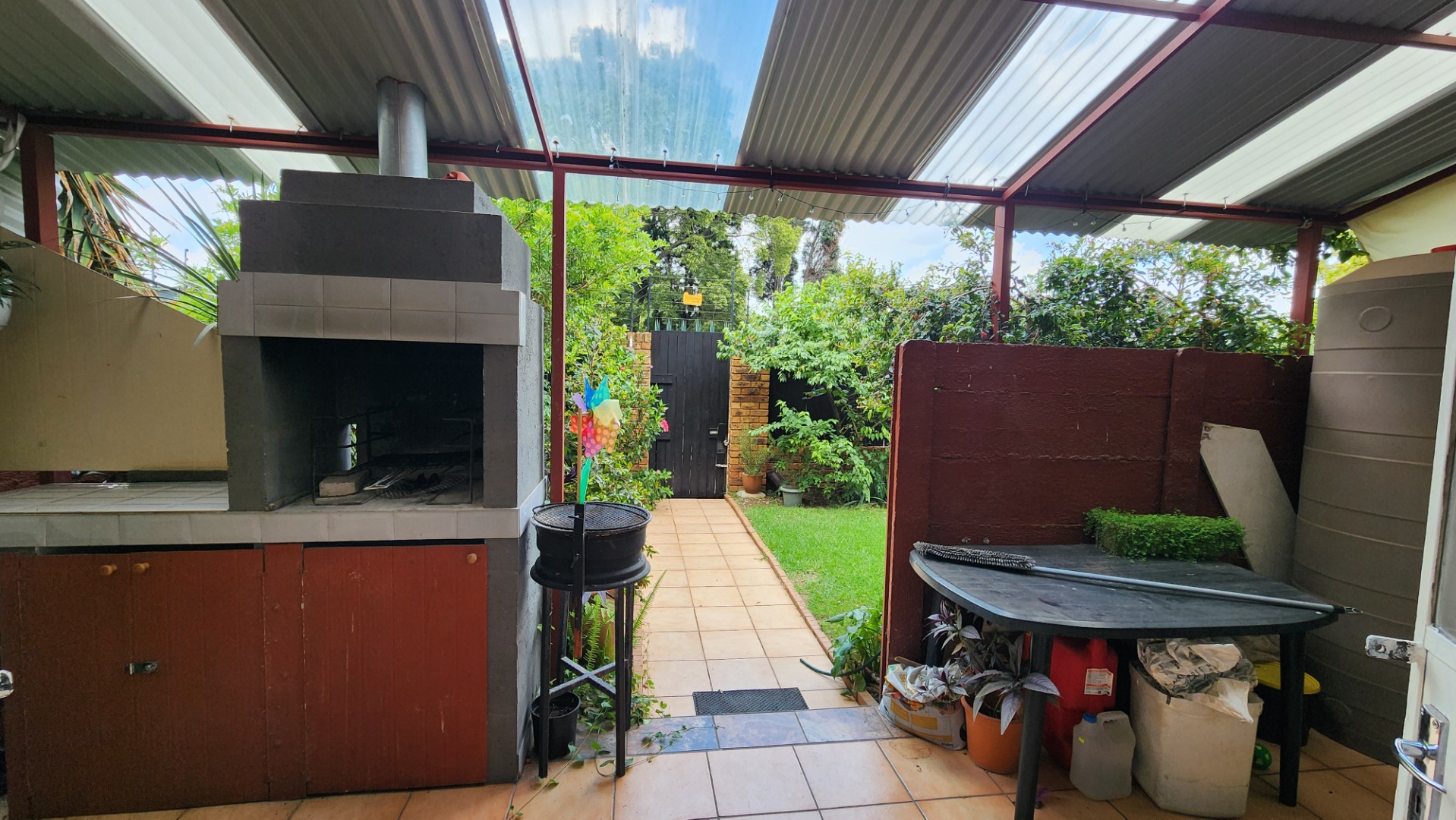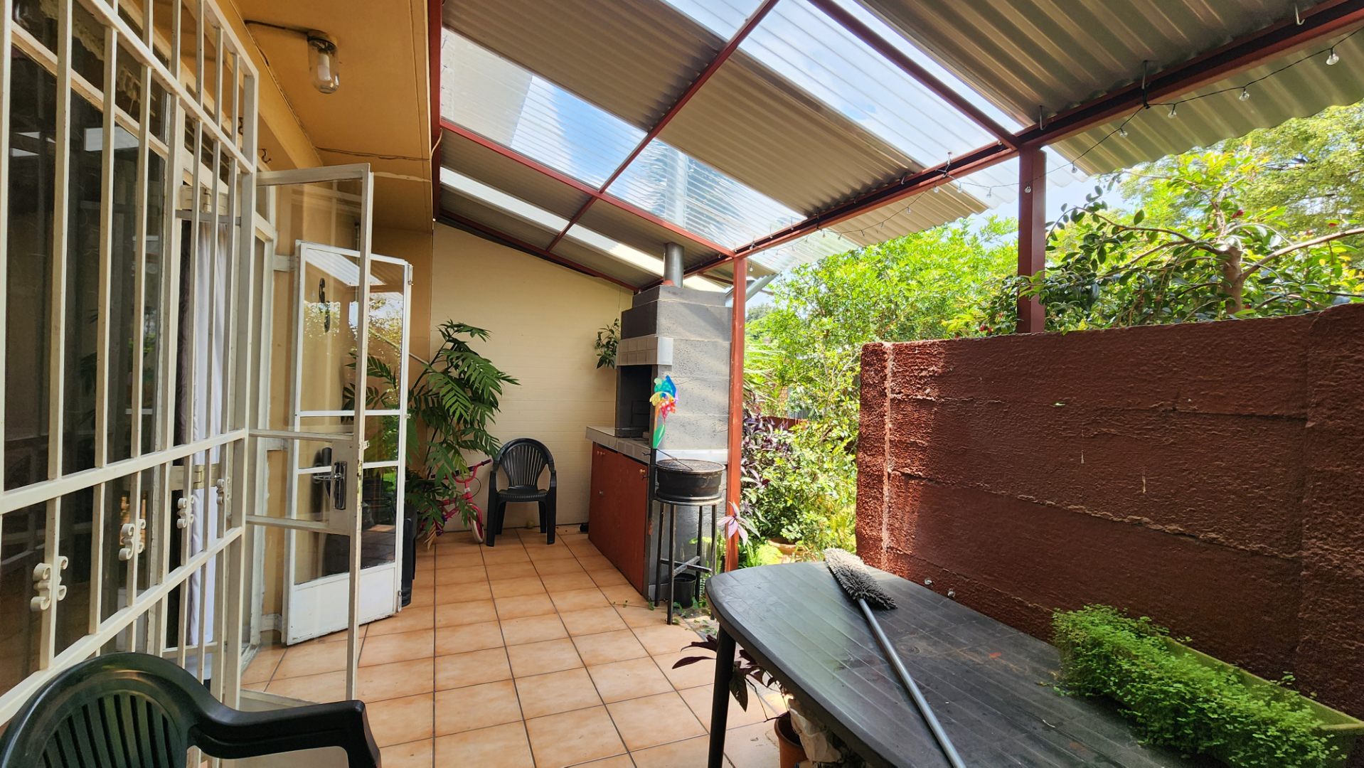 Semi-enclosed patio with built-in braai. Washing lines are located at the back kitchen door.