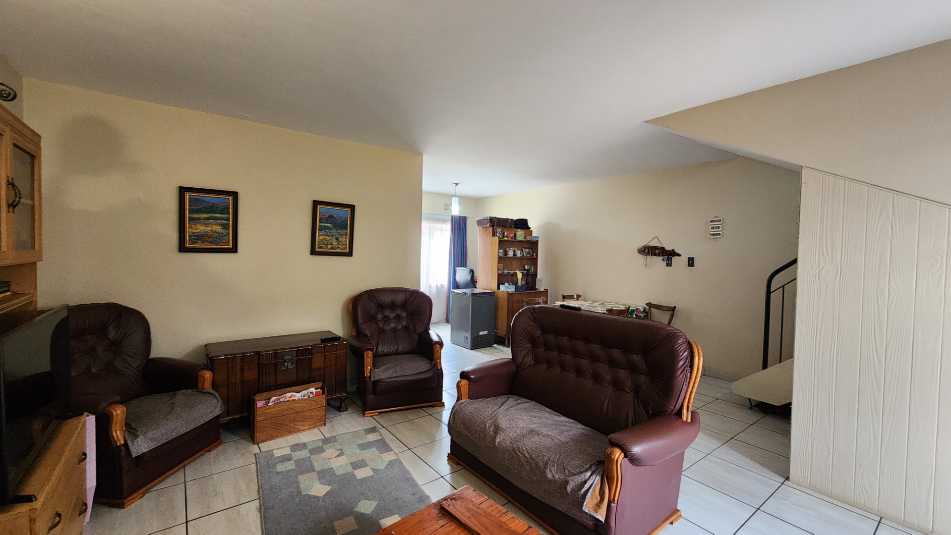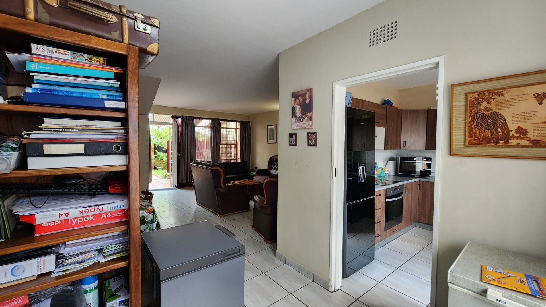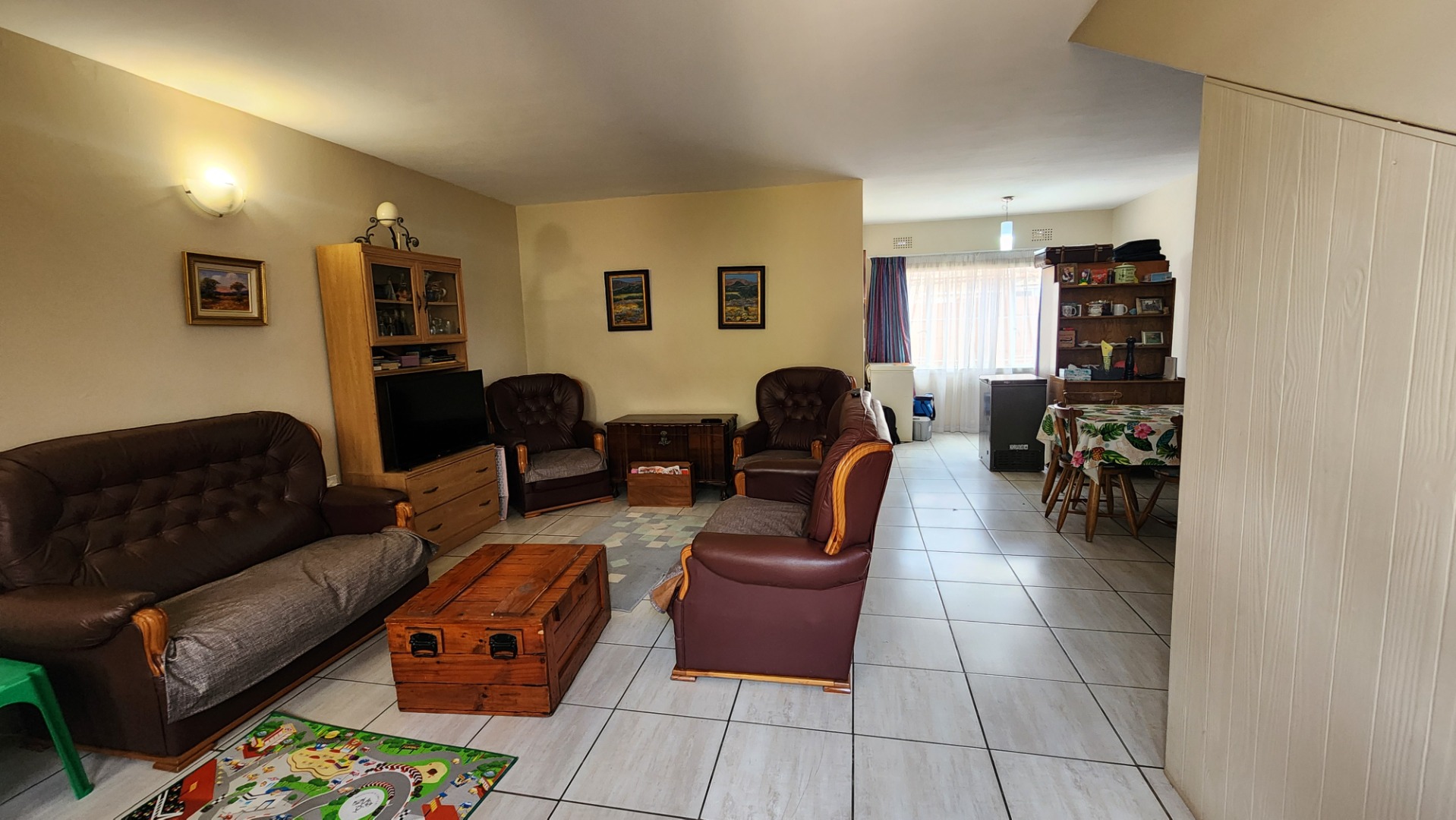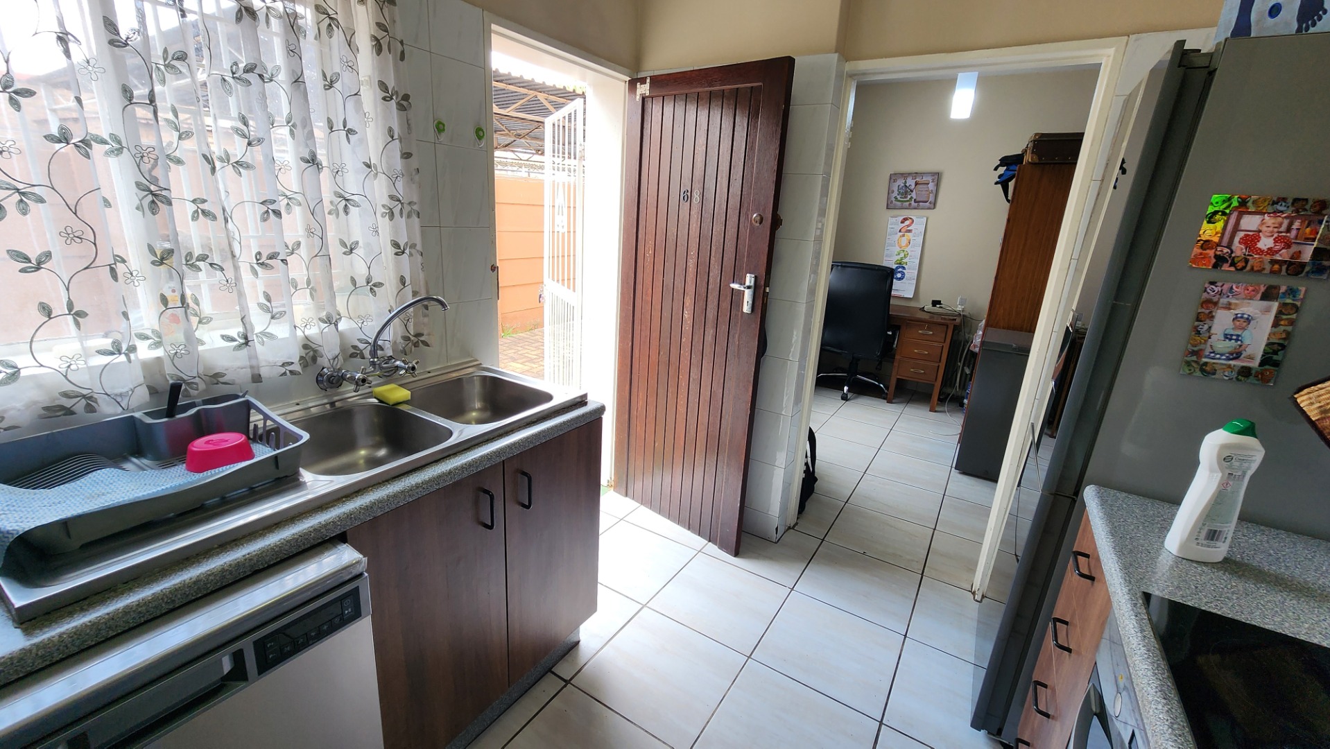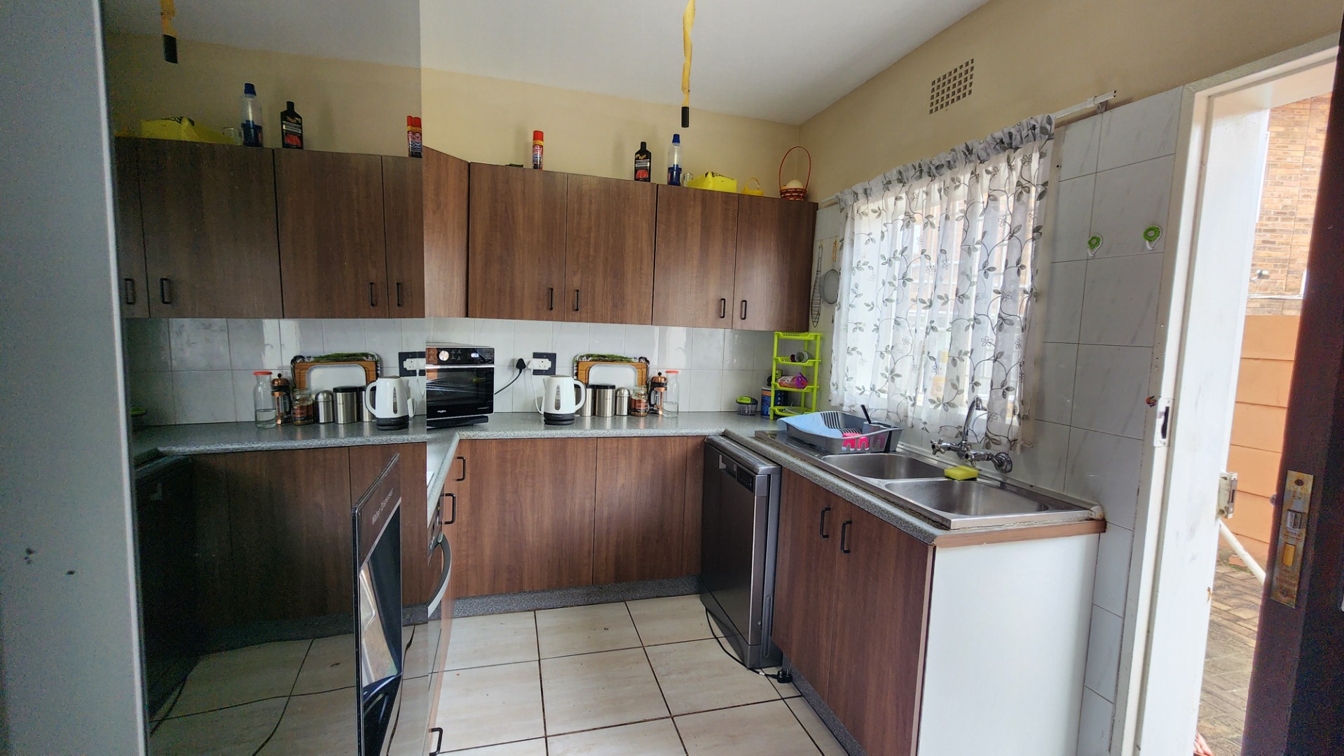 Open-plan lounge and dining area with tiled floors. Separate tiled kitchen fitted with a double sink and dishwasher connection.