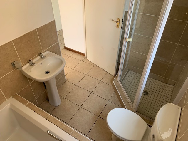 Both bedrooms offer built-in wardrobes for ample storage and durable tiled flooring, complemented by large windows that invite natural light. The full bathroom includes both a bathtub and a separate shower, alongside a pedestal sink, all finished with easy-to-maintain tiles.