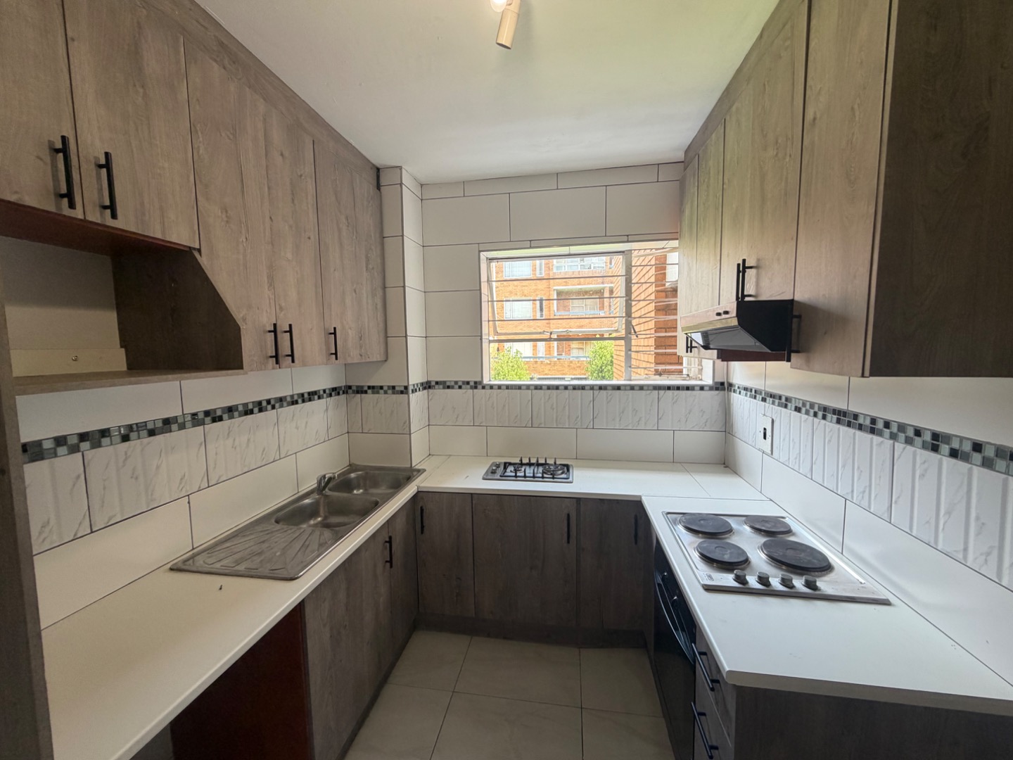 The modern kitchen is a highlight, boasting stylish wood-grain cabinetry, sleek black handles, and clean white countertops. It is equipped with a double sink and offers versatile cooking options with both a gas hob and an electric plate cooker with an integrated oven. Tiled walls with a decorative border and natural light from a window create a pleasant cooking environment. The apartment includes two comfortable bedrooms, one offering direct access to a private balcony, while the other benefits from abundant natural light through two windows and a scenic view of greenery. The bathroom is fully tiled and features a bathtub with an overhead shower and a partial glass screen, complemented by a sink with a vanity and two mirrors. A separate, fully tiled toilet room provides additional convenience.