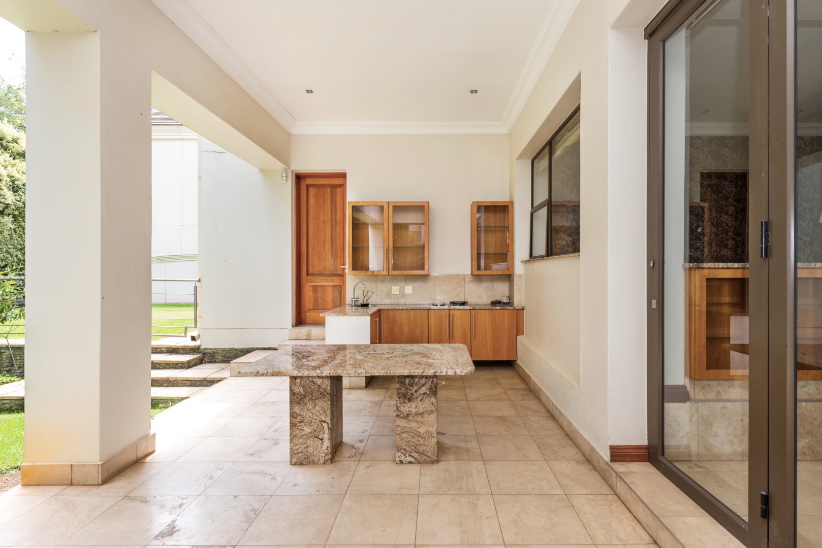 Designed for sophisticated living, the property includes a private swimming pool, a meticulously maintained garden, and a covered patio with a built-in gas braai, perfect for outdoor entertaining. A dedicated staff quarters with 2 rooms and kitchenette and bathroom and ample storage further enhance convenience. With four parking spaces, including two garages, and the allowance for pets, this unfurnished home is ideally suited for discerning families or professionals seeking a premium rental experience.