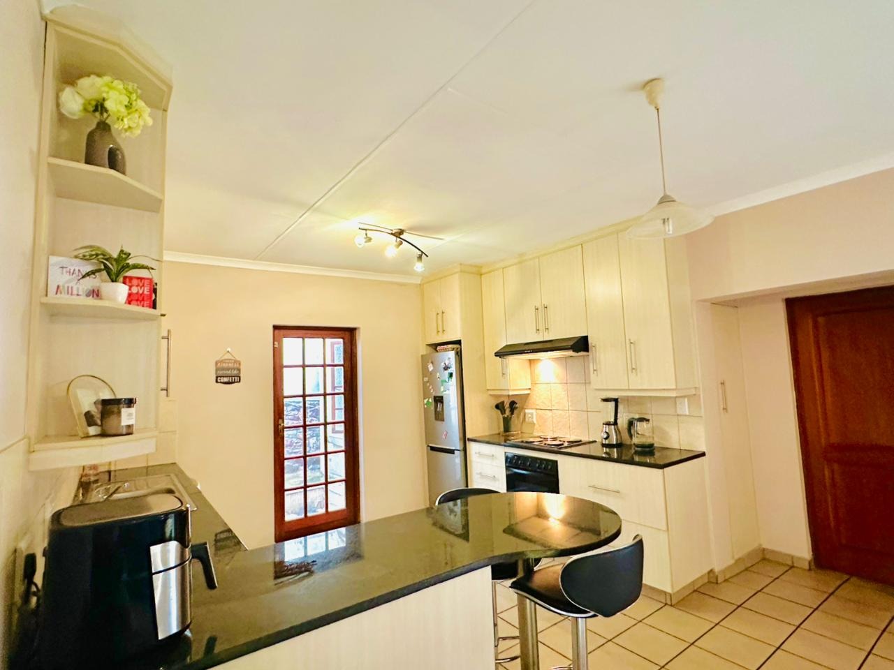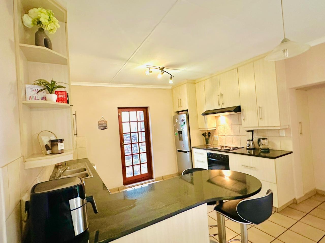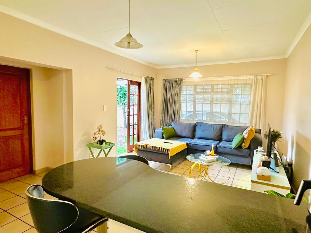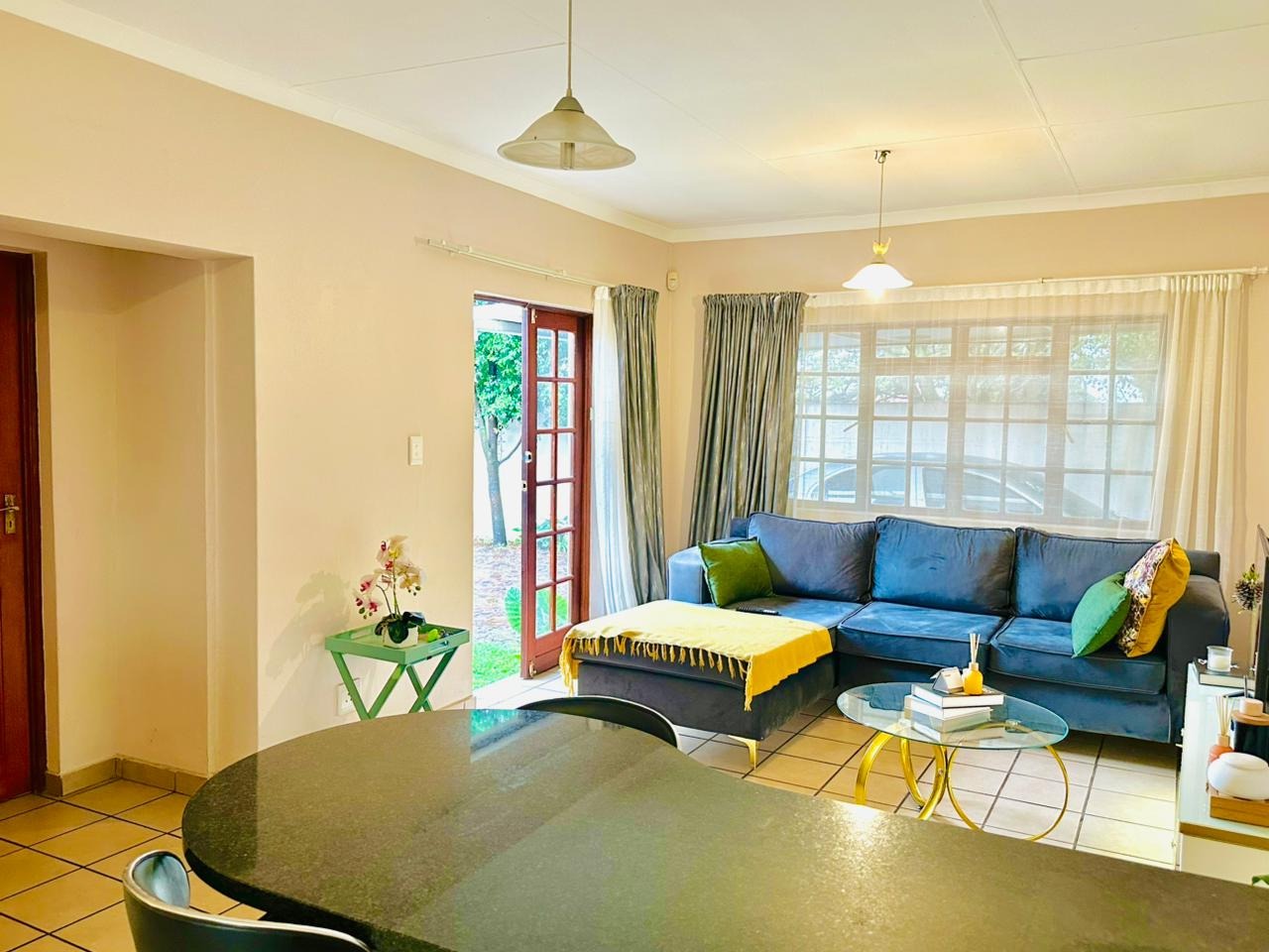 The interior features an open-plan living area seamlessly connected to a modern kitchen, creating a spacious and cohesive environment. Tiled flooring extends throughout, ensuring easy maintenance. The kitchen is equipped with light-coloured cabinetry, dark countertops, and a functional breakfast bar, perfect for casual dining. Natural light floods the living spaces through large windows and French doors, enhancing the bright and airy atmosphere.