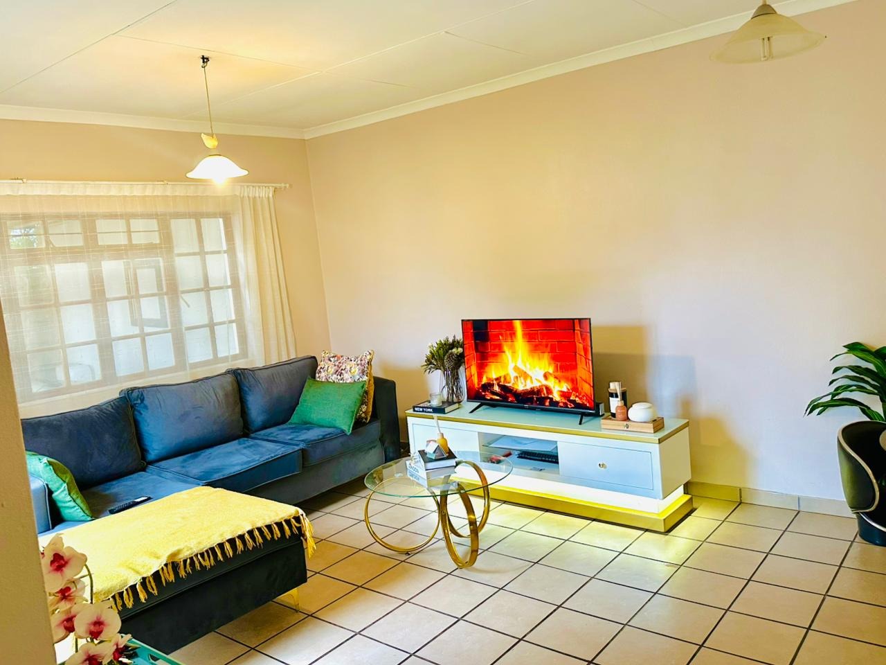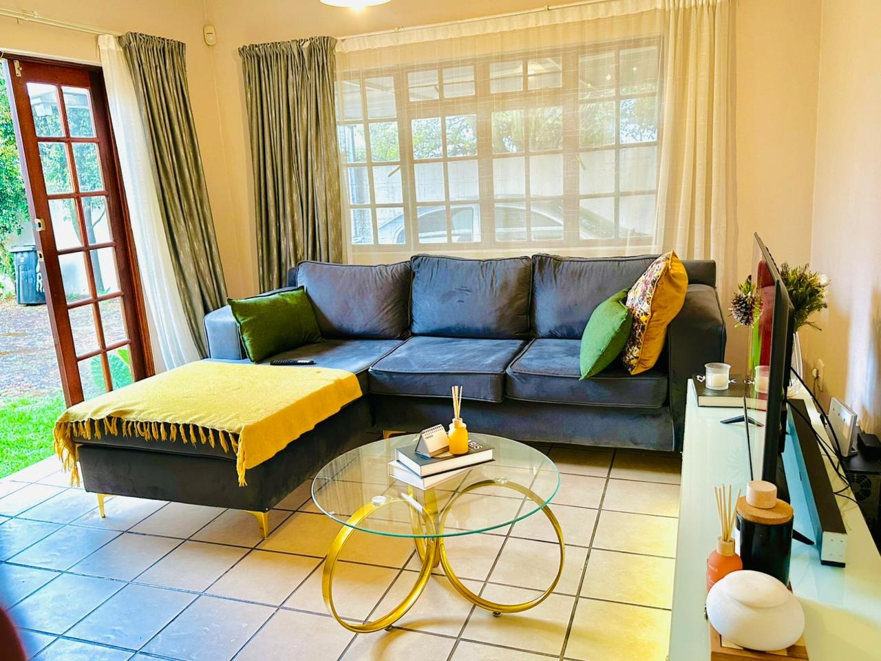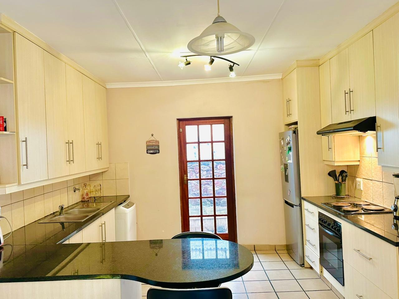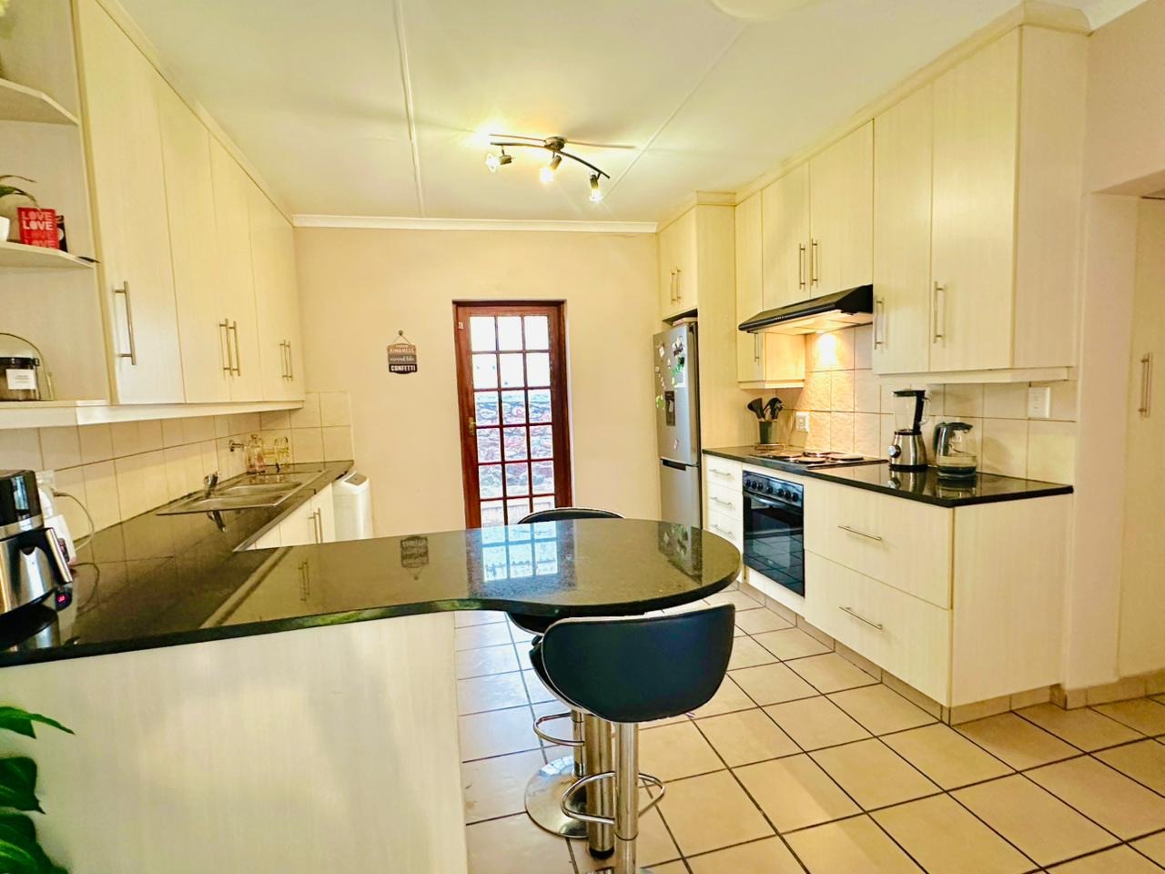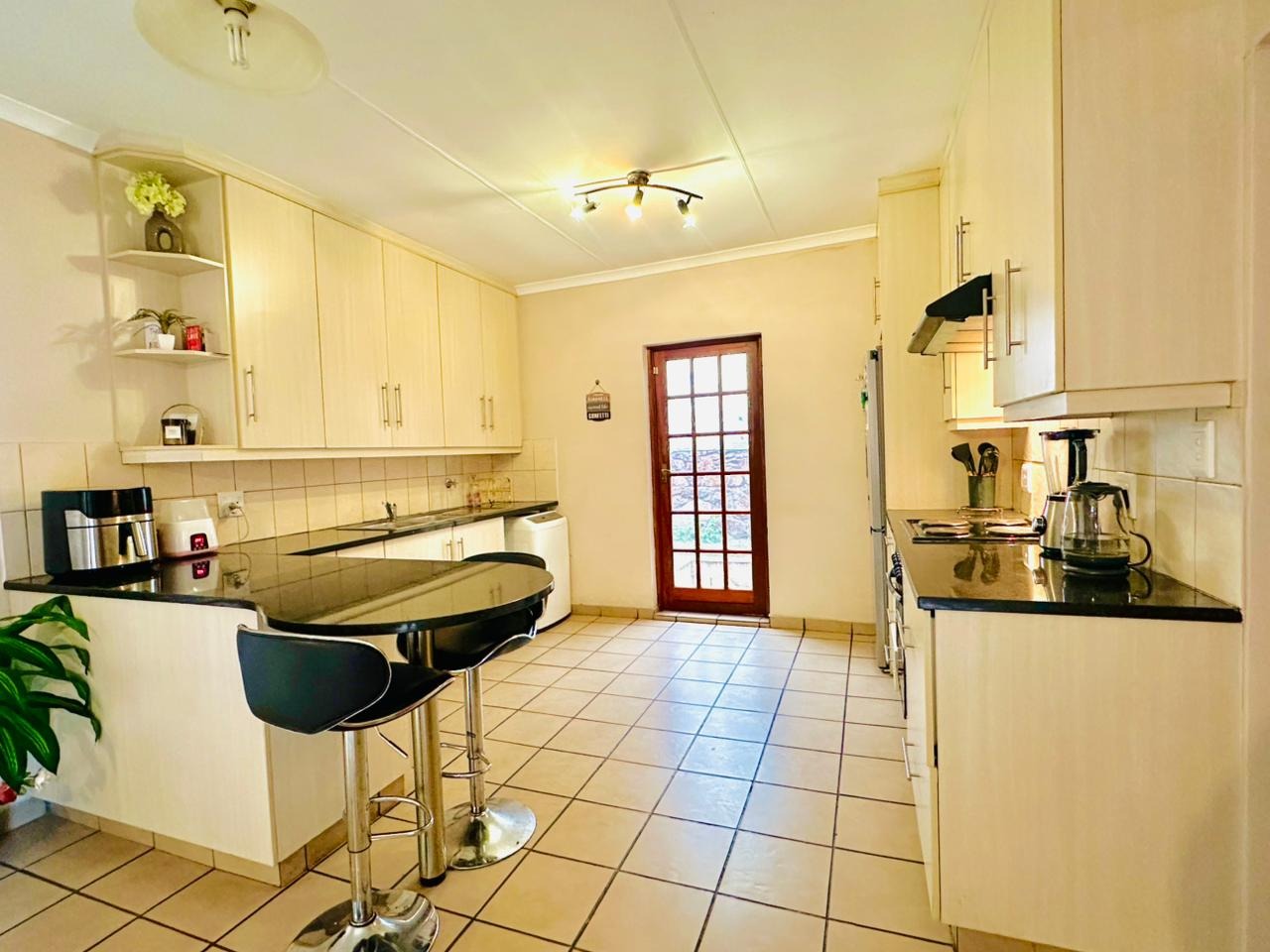 The interior features an open-plan living area seamlessly connected to a modern kitchen, creating a spacious and cohesive environment. Tiled flooring extends throughout, ensuring easy maintenance. The kitchen is equipped with light-coloured cabinetry, dark countertops, and a functional breakfast bar, perfect for casual dining. Natural light floods the living spaces through large windows and French doors, enhancing the bright and airy atmosphere.