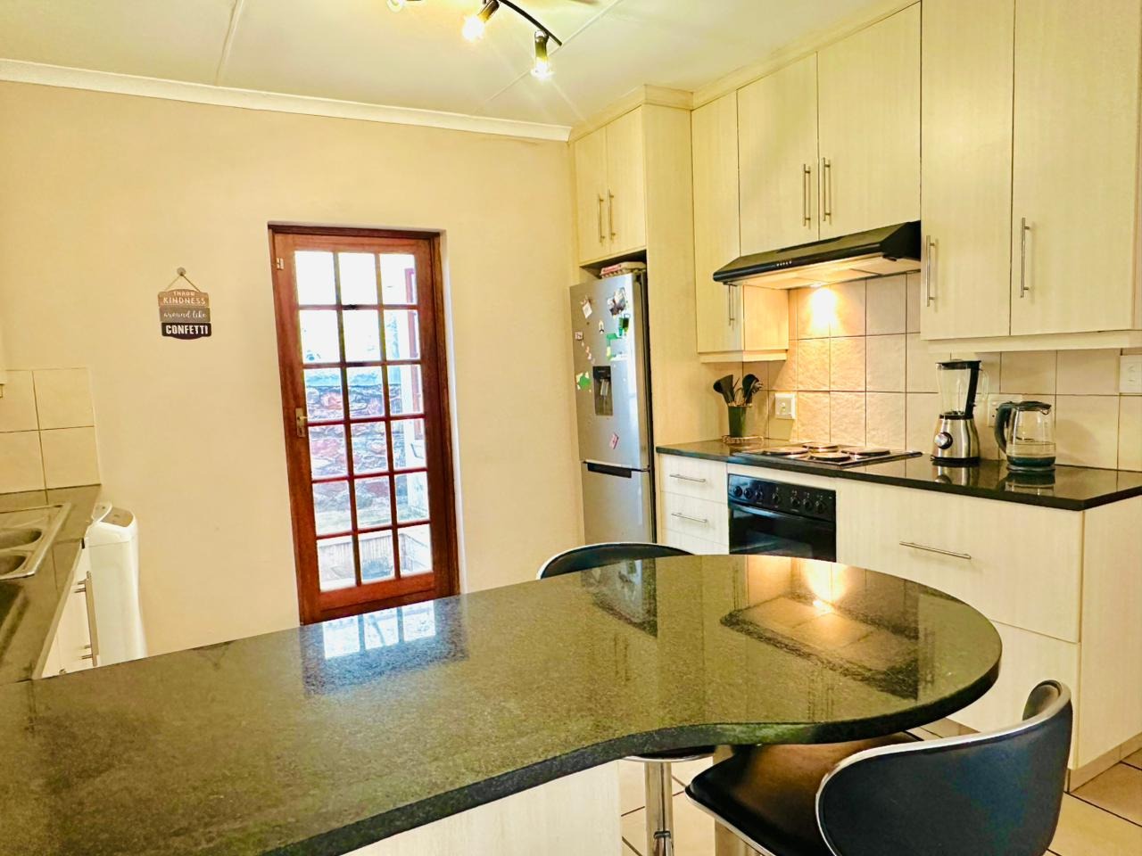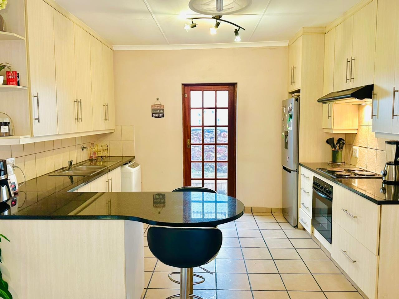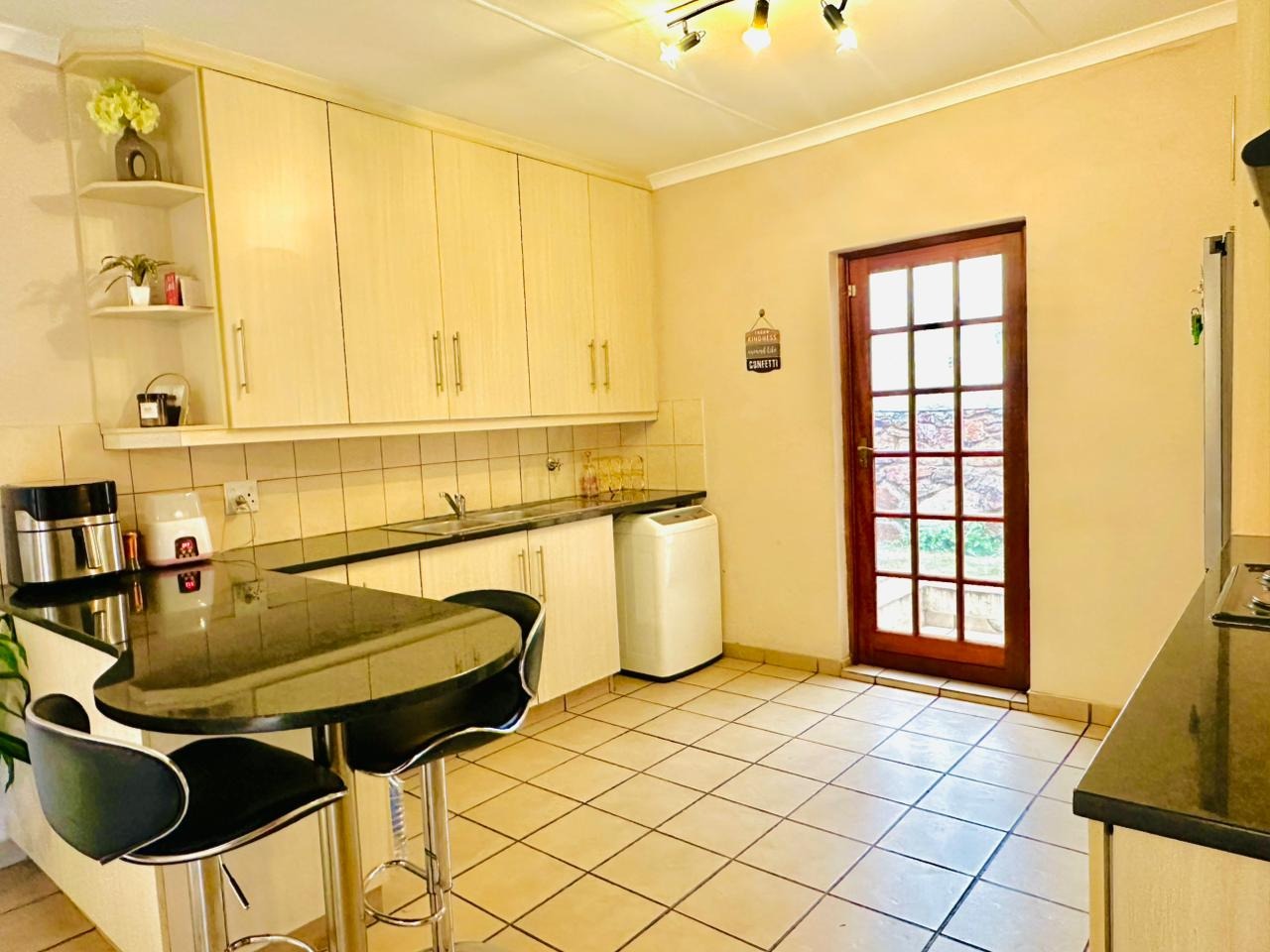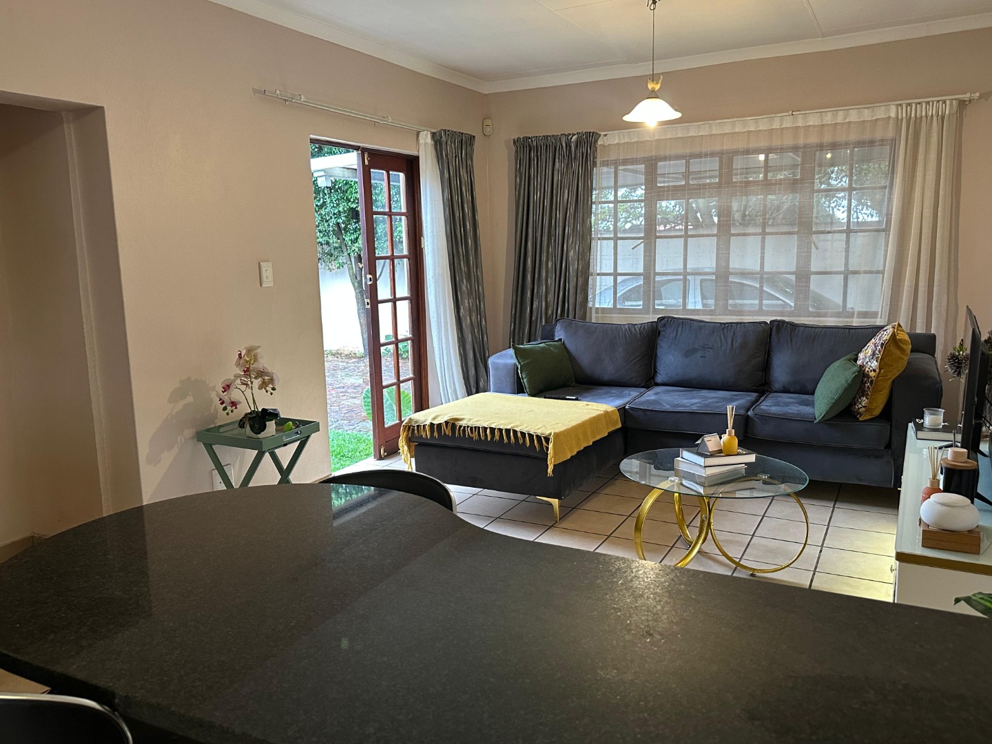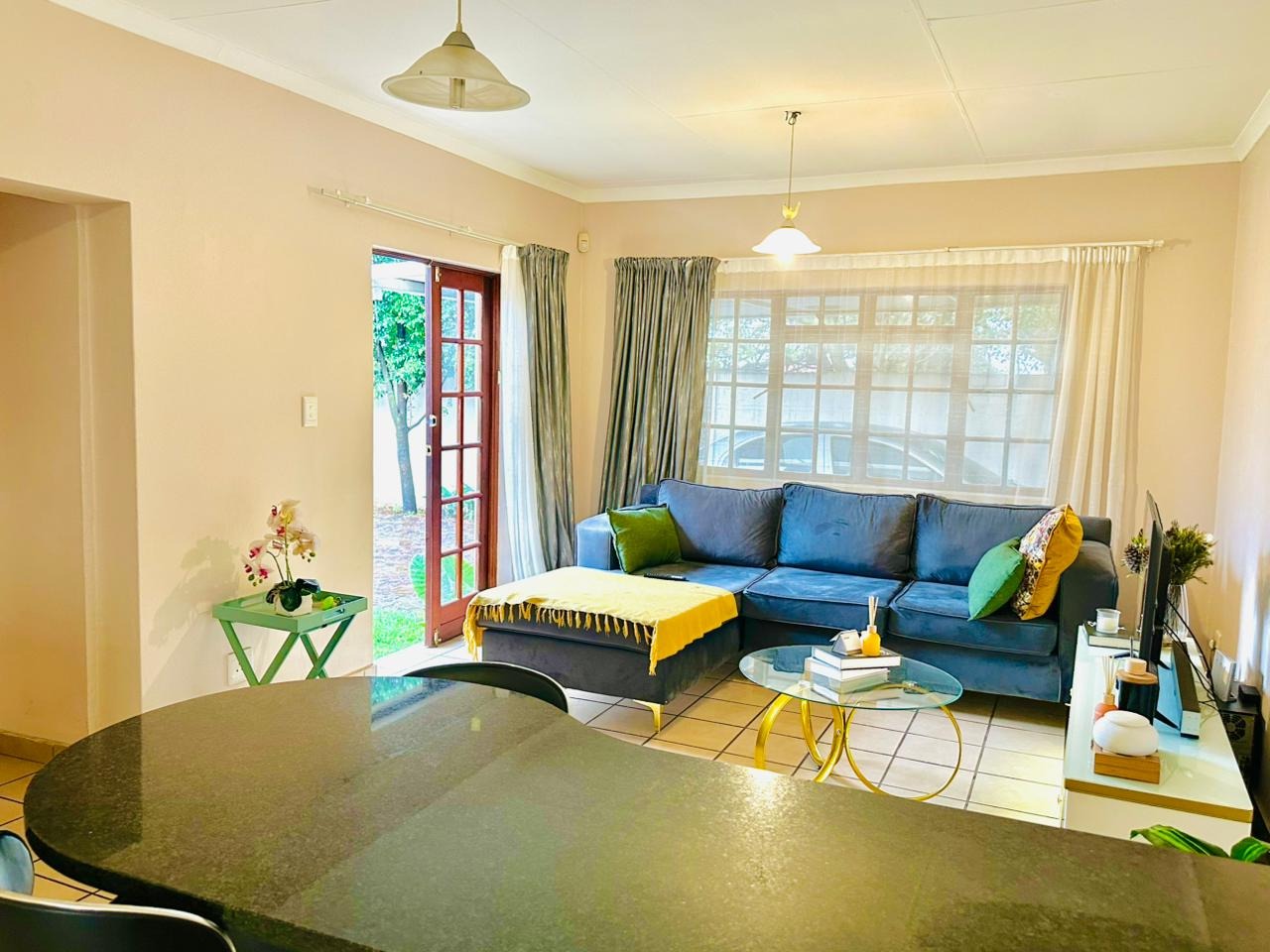 The interior features an open-plan living area seamlessly connected to a modern kitchen, creating a spacious and cohesive environment. Tiled flooring extends throughout, ensuring easy maintenance. The kitchen is equipped with light-coloured cabinetry, dark countertops, and a functional breakfast bar, perfect for casual dining. Natural light floods the living spaces through large windows and French doors, enhancing the bright and airy atmosphere.