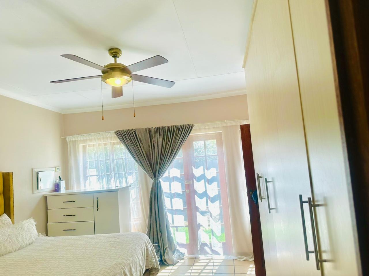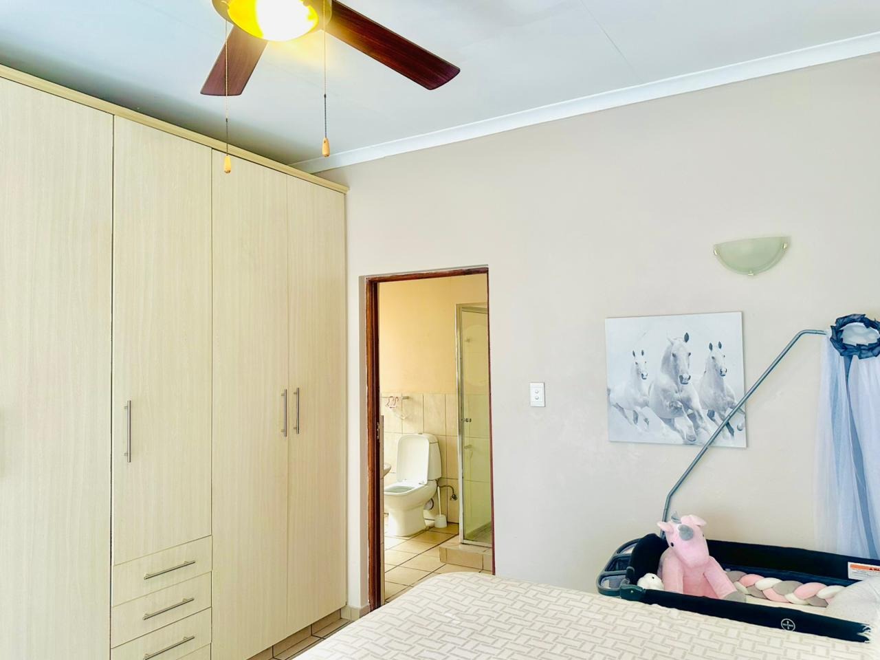 The single bedroom is designed for comfort, boasting built-in wardrobes that provide ample storage and a ceiling fan for climate control. The property includes one well-appointed bathroom, offering both a separate bathtub and a walk-in shower for convenience. One of the bathrooms also presents an en-suite setup, adding to the privacy and functionality of the home.